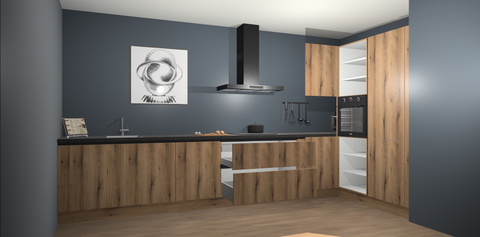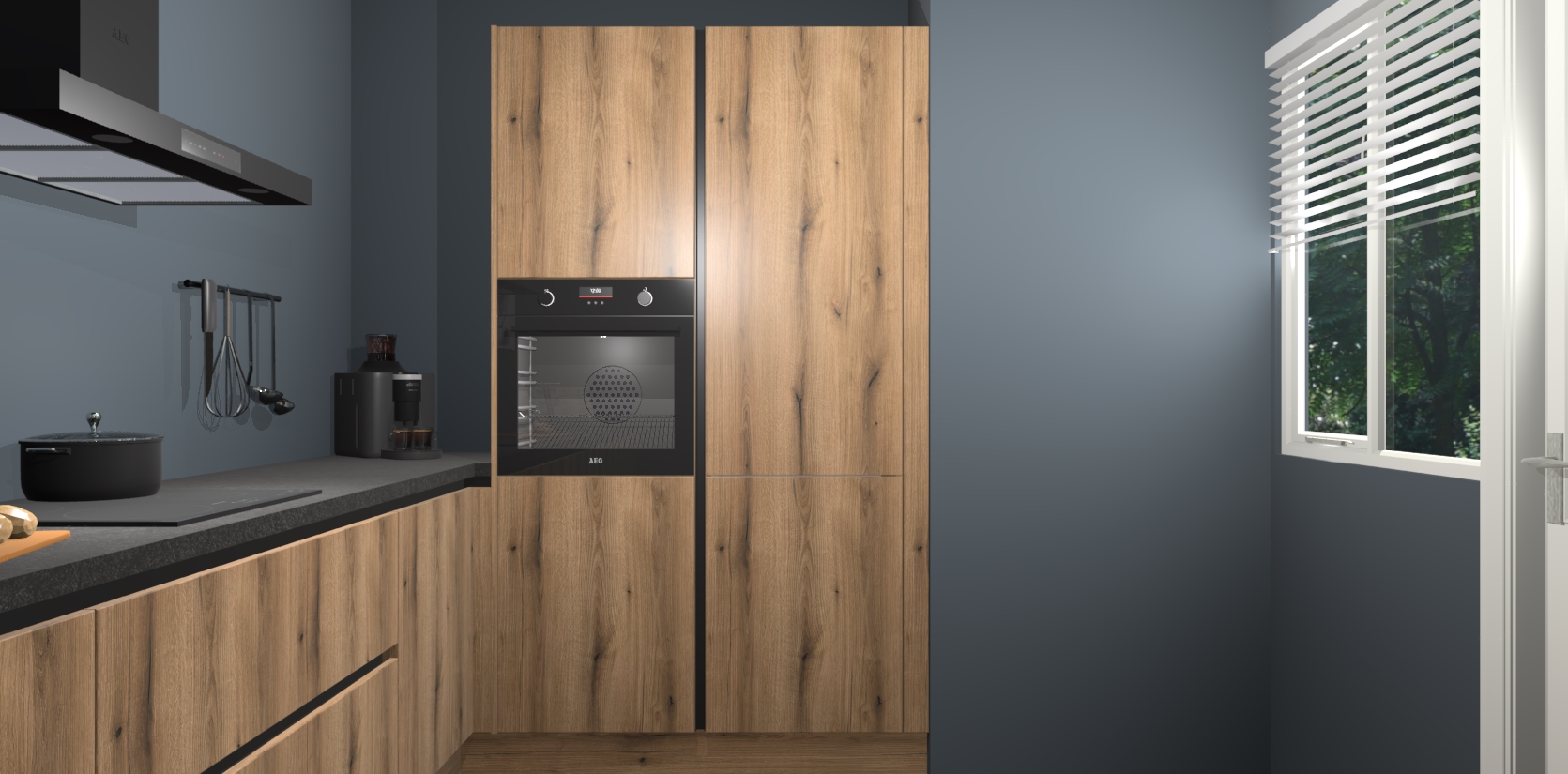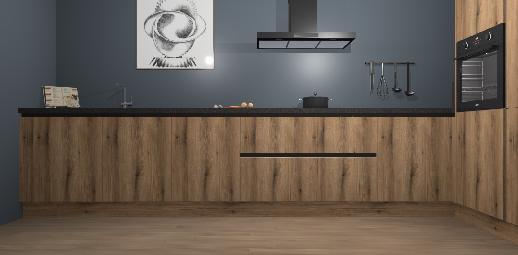Welkom bij de Goud Eiken greeploze keuken Khao Lak. Deze prachtige keuken zal de komende jaren het middelpunt van de belangstelling in uw huis zijn. Uitgerust met vijf inbouwapparaten komt u nooit kookgereedschap tekort. Bovendien geeft de warme houtlook elke ruimte een uitnodigende en tijdloze uitstraling.