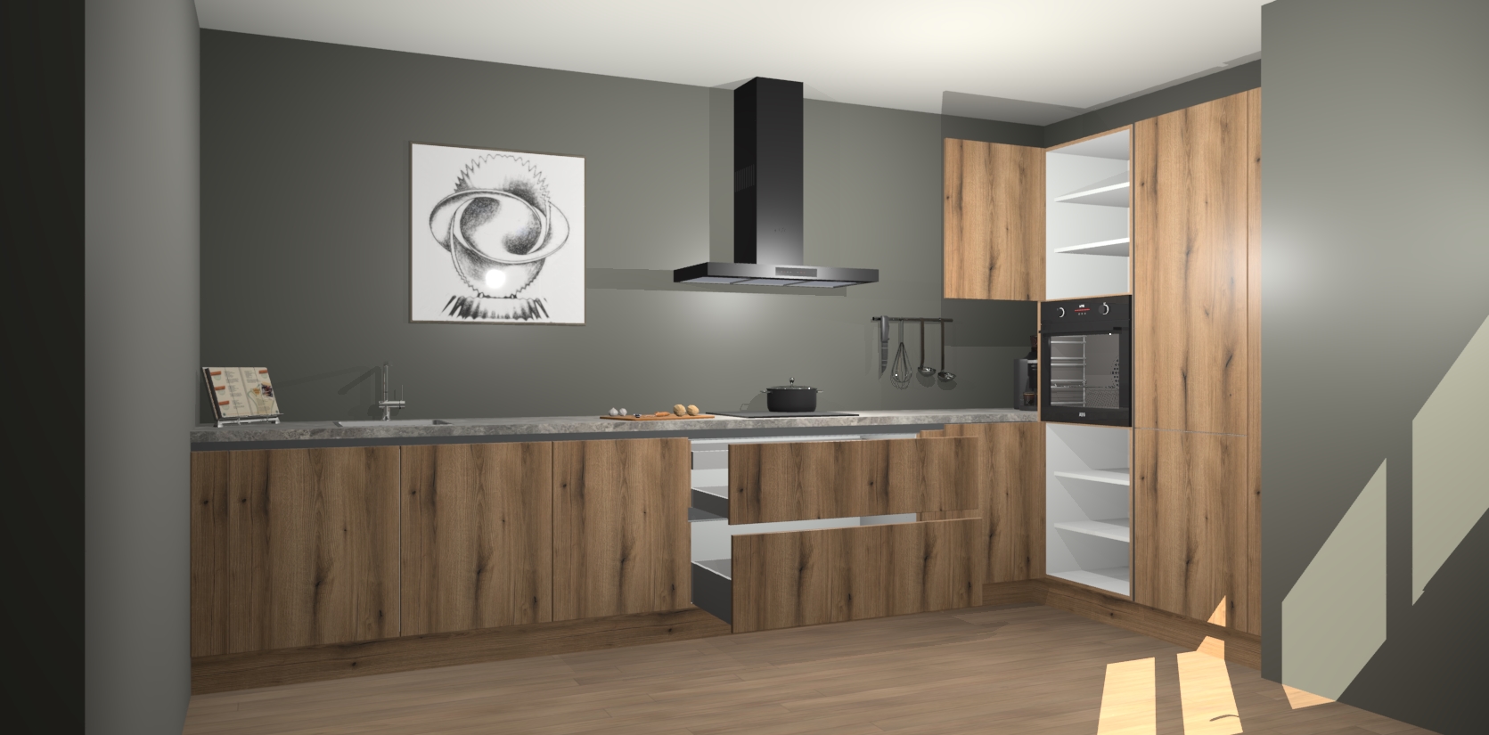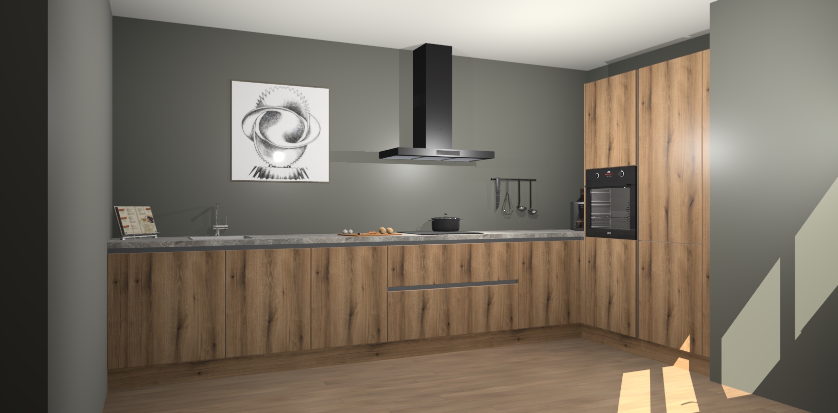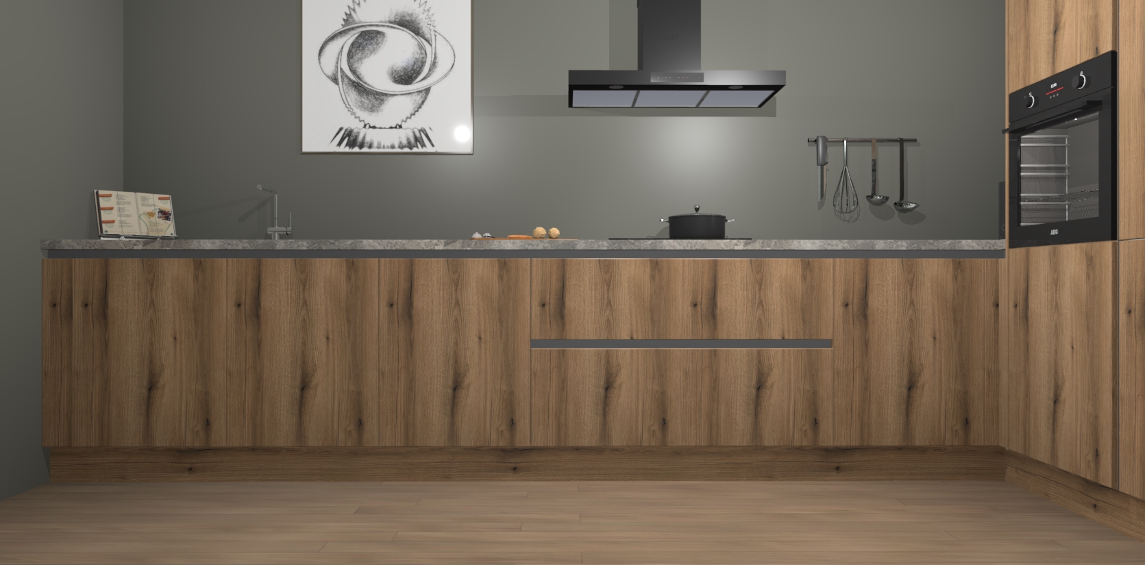 Welkom bij de Goud Eiken greeploze keuken Khao Lak. Deze prachtige keuken zal de komende jaren het middelpunt van de belangstelling in uw huis zijn. Uitgerust met vijf inbouwapparaten komt u nooit kookgereedschap tekort. Bovendien geeft de warme houtlook elke ruimte een uitnodigende en tijdloze uitstraling.