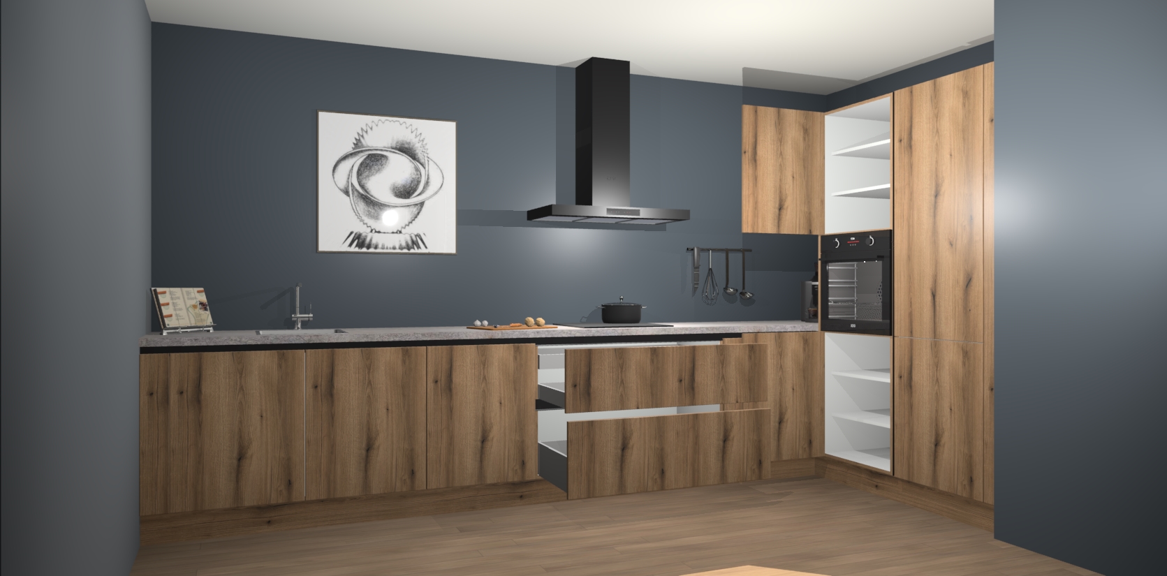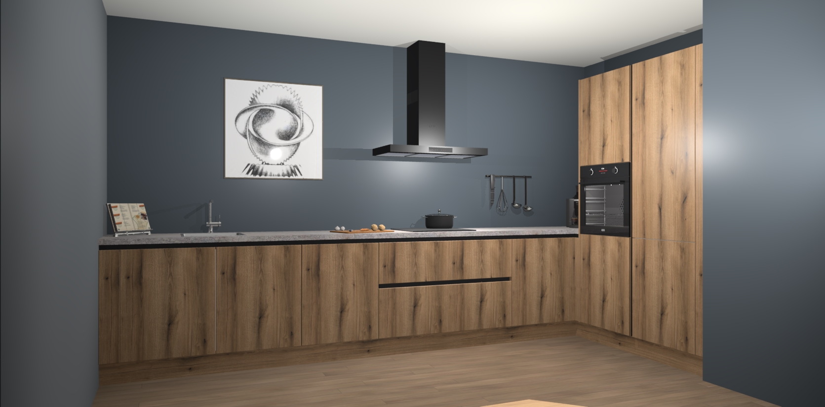 Welkom bij de Goud Eiken greeploze keuken Khao Lak. Deze prachtige keuken zal de komende jaren het middelpunt van de belangstelling in uw huis zijn. Uitgerust met vijf inbouwapparaten komt u nooit kookgereedschap tekort. Bovendien geeft de warme houtlook elke ruimte een uitnodigende en tijdloze uitstraling.
