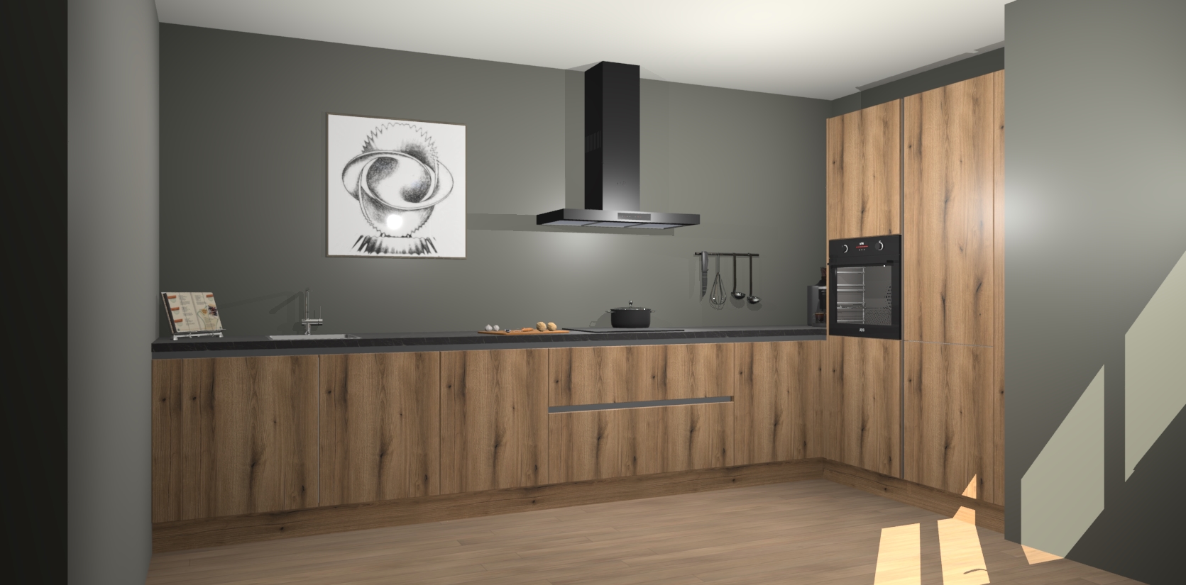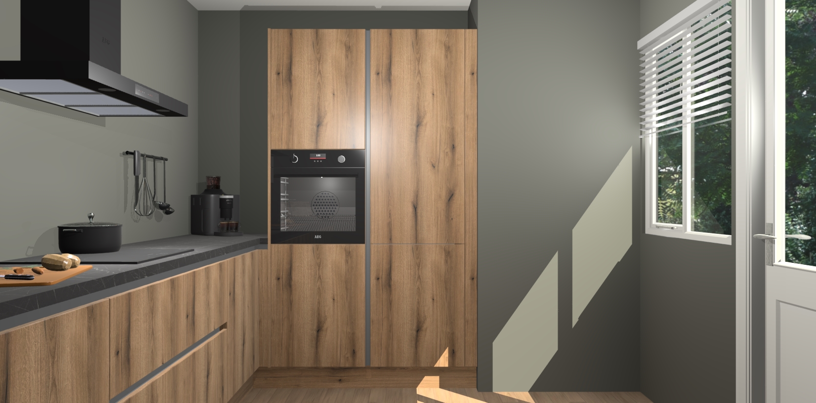 Welkom bij de Goud Eiken greeploze keuken Khao Lak. Deze prachtige keuken zal de komende jaren het middelpunt van de belangstelling in uw huis zijn. Uitgerust met vijf inbouwapparaten komt u nooit kookgereedschap tekort. Bovendien geeft de warme houtlook elke ruimte een uitnodigende en tijdloze uitstraling.