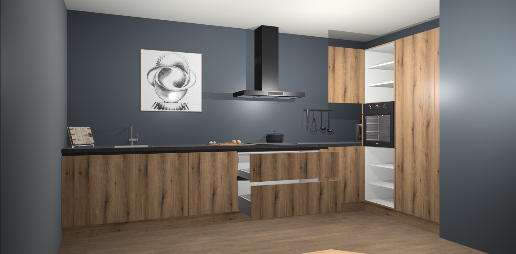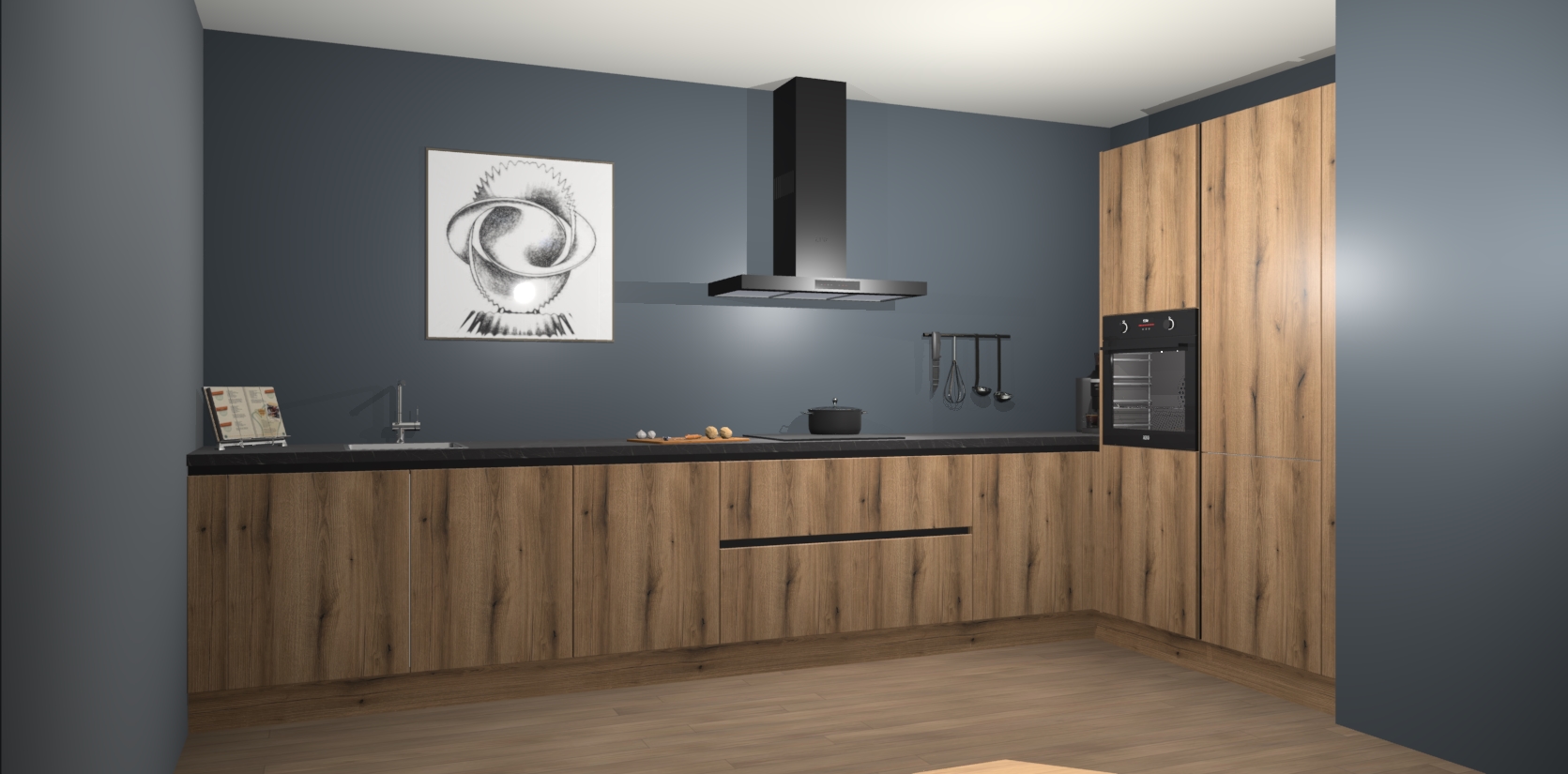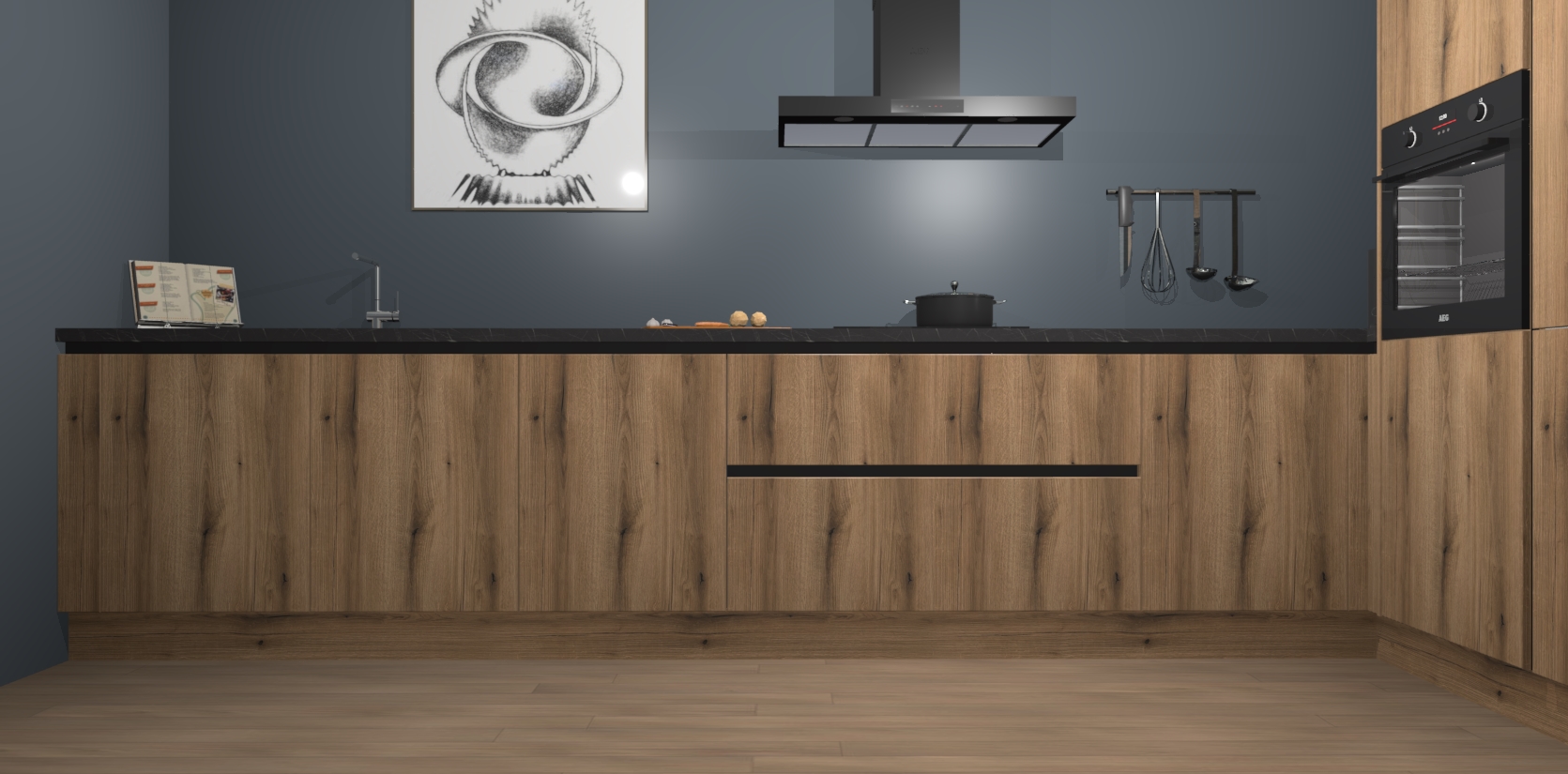 Welkom bij de Goud Eiken greeploze keuken Khao Lak. Deze prachtige keuken zal de komende jaren het middelpunt van de belangstelling in uw huis zijn. Uitgerust met vijf inbouwapparaten komt u nooit kookgereedschap tekort. Bovendien geeft de warme houtlook elke ruimte een uitnodigende en tijdloze uitstraling.