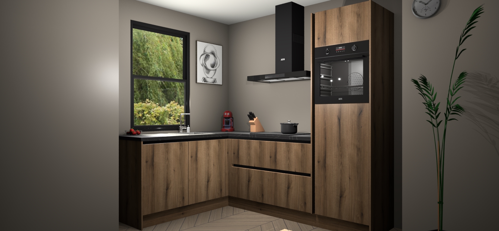 Deze prachtige hoekkeuken heeft alle benodigdheden om uw droomkook- en eetruimte compleet te maken. De Goud Eiken kasten bieden een echo van raffinement, terwijl de 5 inbouwapparaten genoeg opties bieden voor het bereiden van heerlijke maaltijden. De oven, inductiekookplaat, afzuigkap, vaatwasser en koelkast zorgen ervoor dat u tijd in de keuken zo efficiënt mogelijk verloopt, terwijl ze ook dat extra vleugje luxe bieden.
