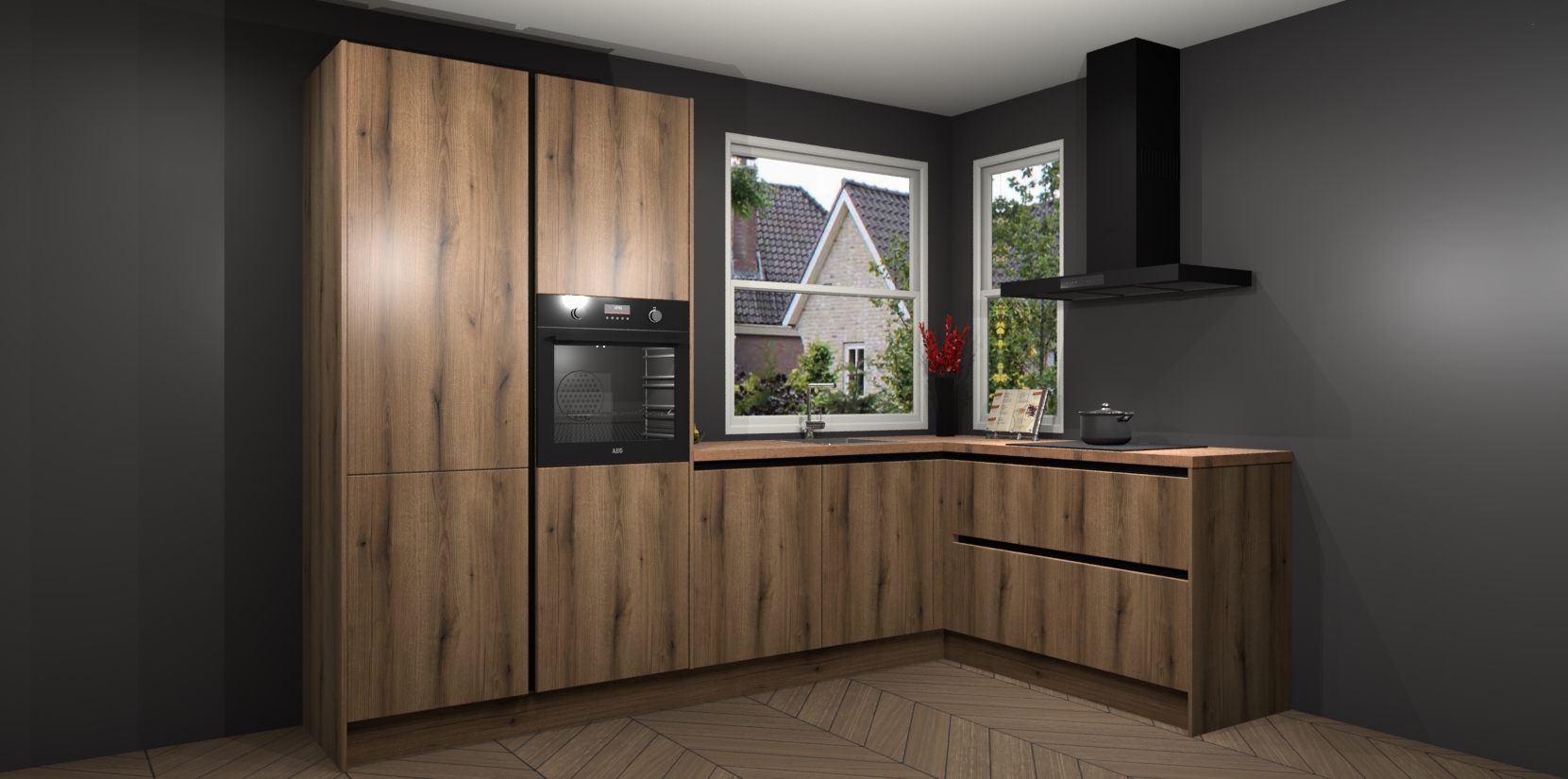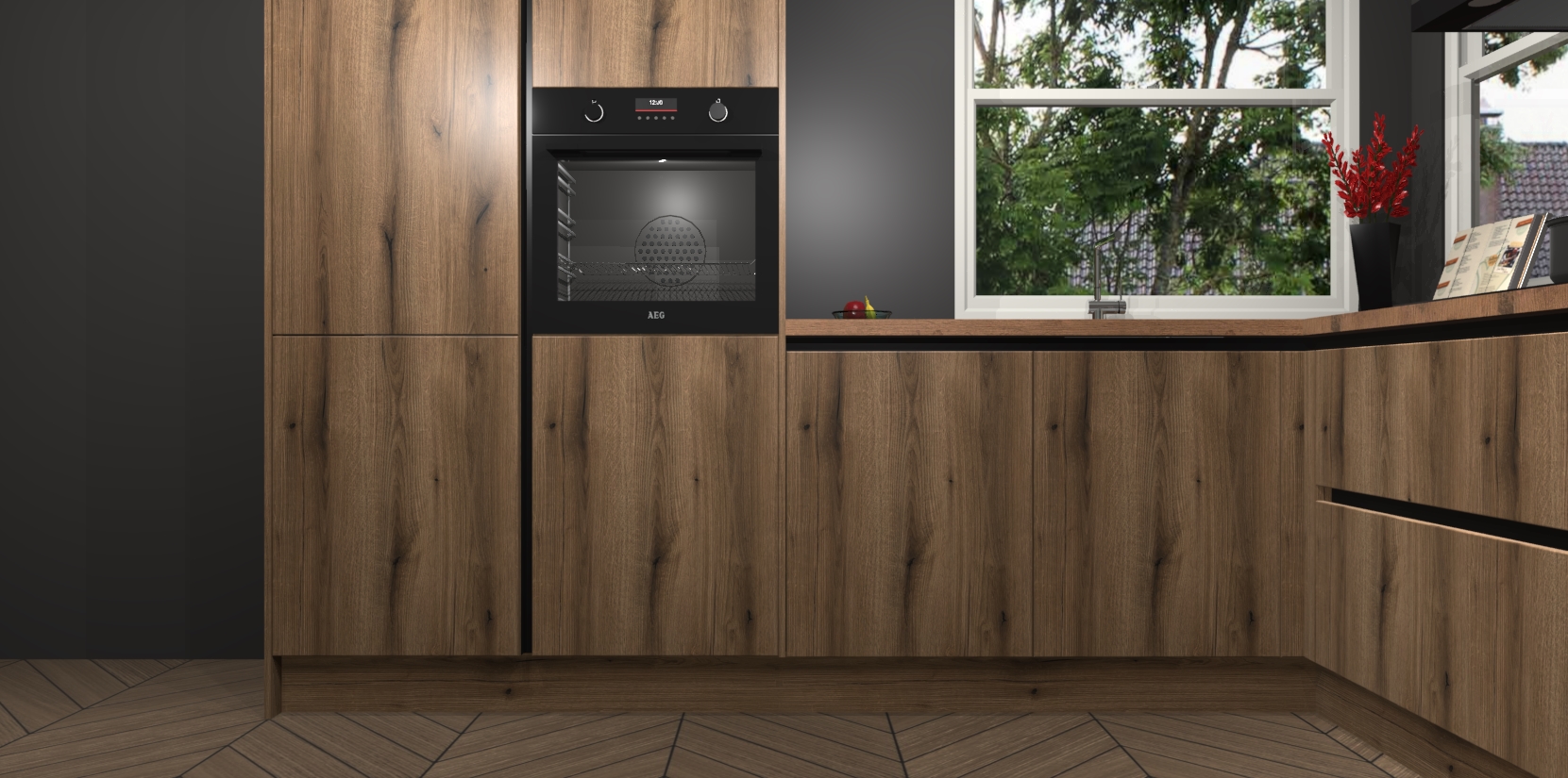 De Goud Eiken greeploze keuken Kotor wordt geleverd met vijf inbouwapparaten, waaronder een oven, inductiekookplaat, afzuigkap, vaatwasser en koelkast. En als u uw apparatuur wilt upgraden, kunnen we u na bestelling eenvoudig helpen overstappen naar AEG. Bovendien heeft deze keuken soft close deuren, zodat lades en kastjes geruisloos en zonder klepperen sluiten!