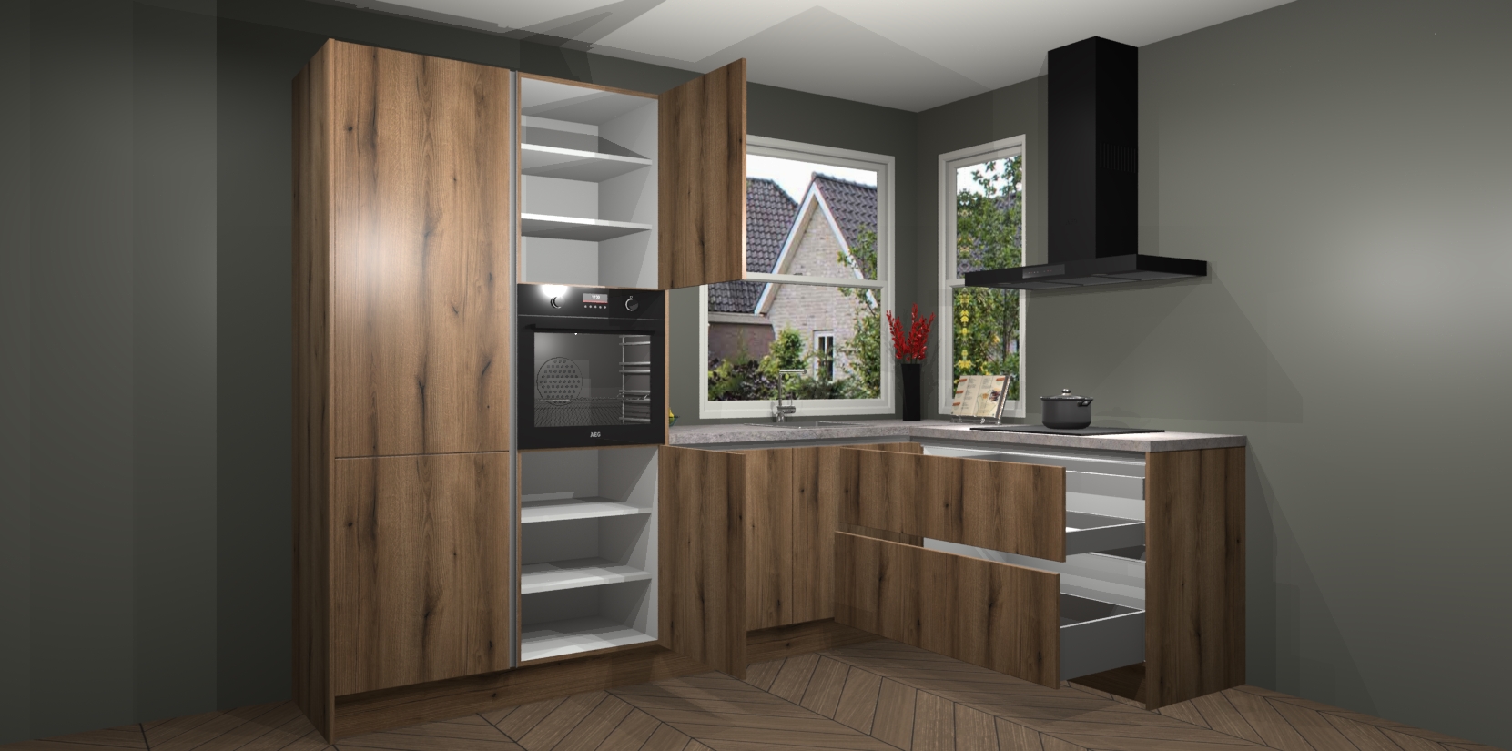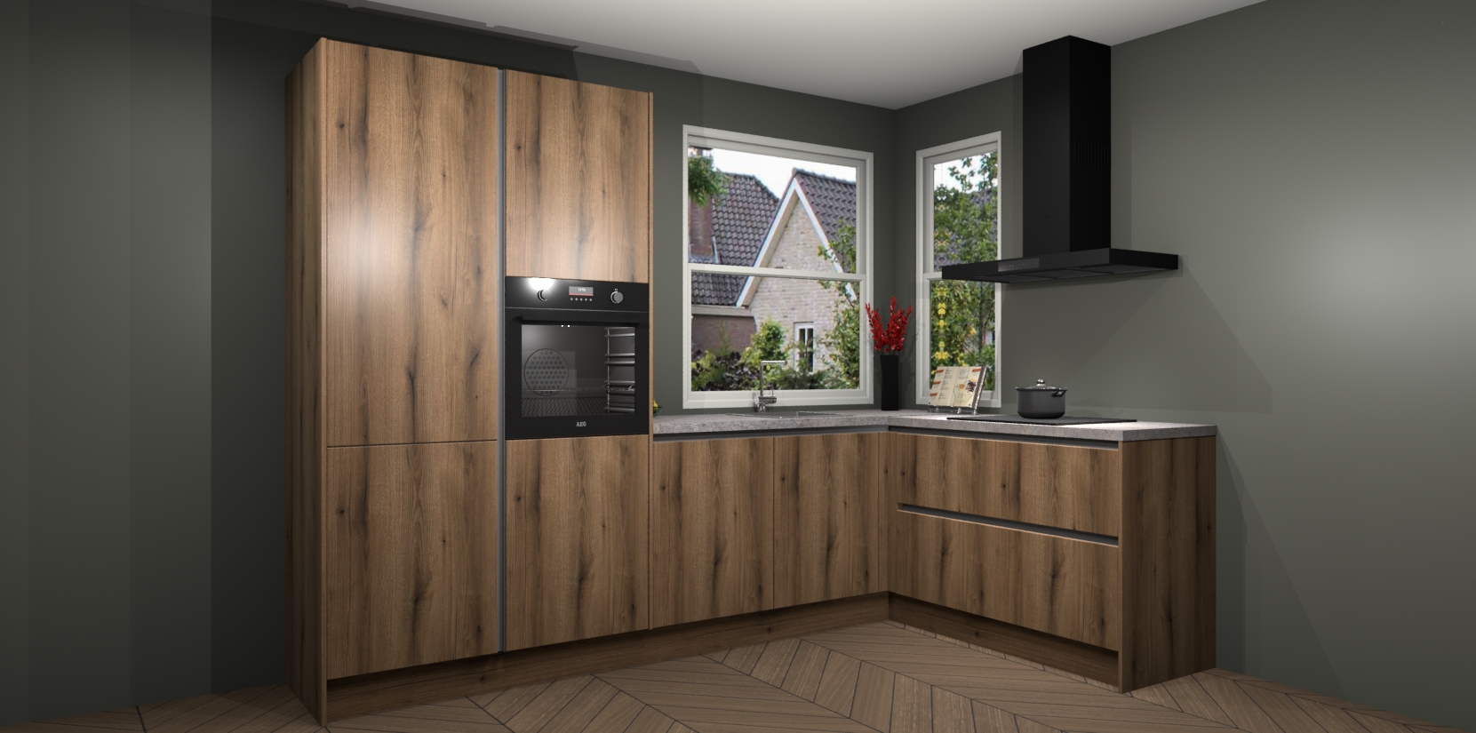 De Goud Eiken greeploze keuken Kotor wordt geleverd met vijf inbouwapparaten, waaronder een oven, inductiekookplaat, afzuigkap, vaatwasser en koelkast. En als u uw apparatuur wilt upgraden, kunnen we u na bestelling eenvoudig helpen overstappen naar AEG. Bovendien heeft deze keuken soft close deuren, zodat lades en kastjes geruisloos en zonder klepperen sluiten!