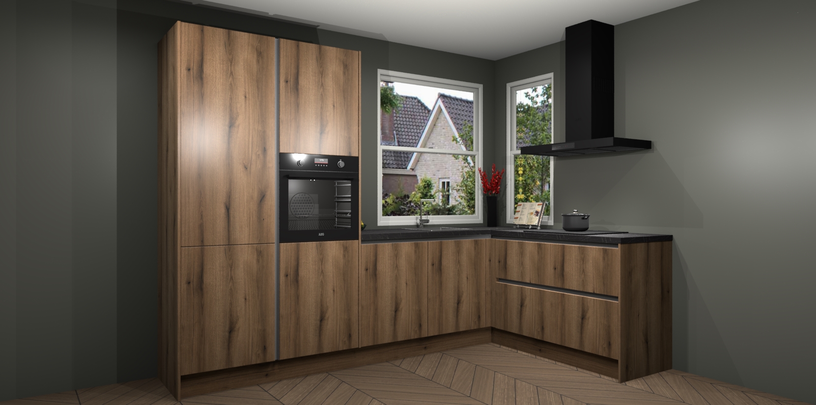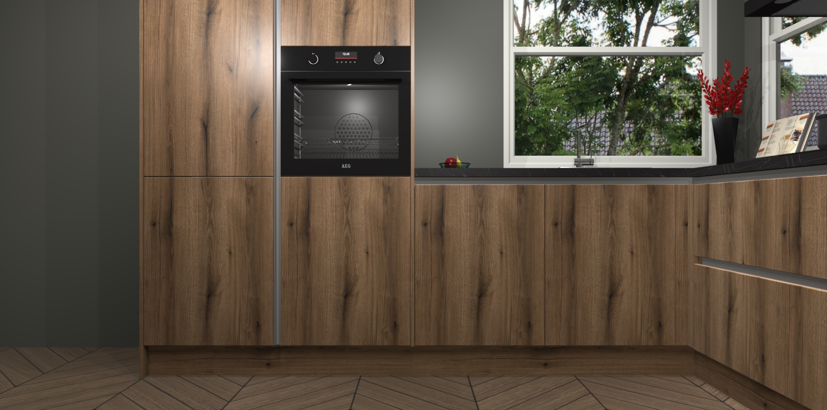 De Goud Eiken greeploze keuken Kotor wordt geleverd met vijf inbouwapparaten, waaronder een oven, inductiekookplaat, afzuigkap, vaatwasser en koelkast. En als u uw apparatuur wilt upgraden, kunnen we u na bestelling eenvoudig helpen overstappen naar AEG. Bovendien heeft deze keuken soft close deuren, zodat lades en kastjes geruisloos en zonder klepperen sluiten!
