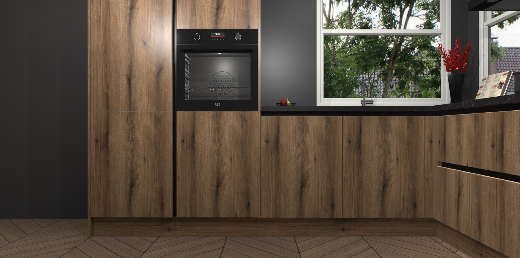De Goud Eiken greeploze keuken Kotor wordt geleverd met vijf inbouwapparaten, waaronder een oven, inductiekookplaat, afzuigkap, vaatwasser en koelkast. En als u uw apparatuur wilt upgraden, kunnen we u na bestelling eenvoudig helpen overstappen naar AEG. Bovendien heeft deze keuken soft close deuren, zodat lades en kastjes geruisloos en zonder klepperen sluiten!