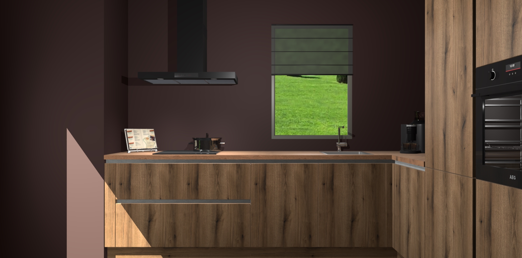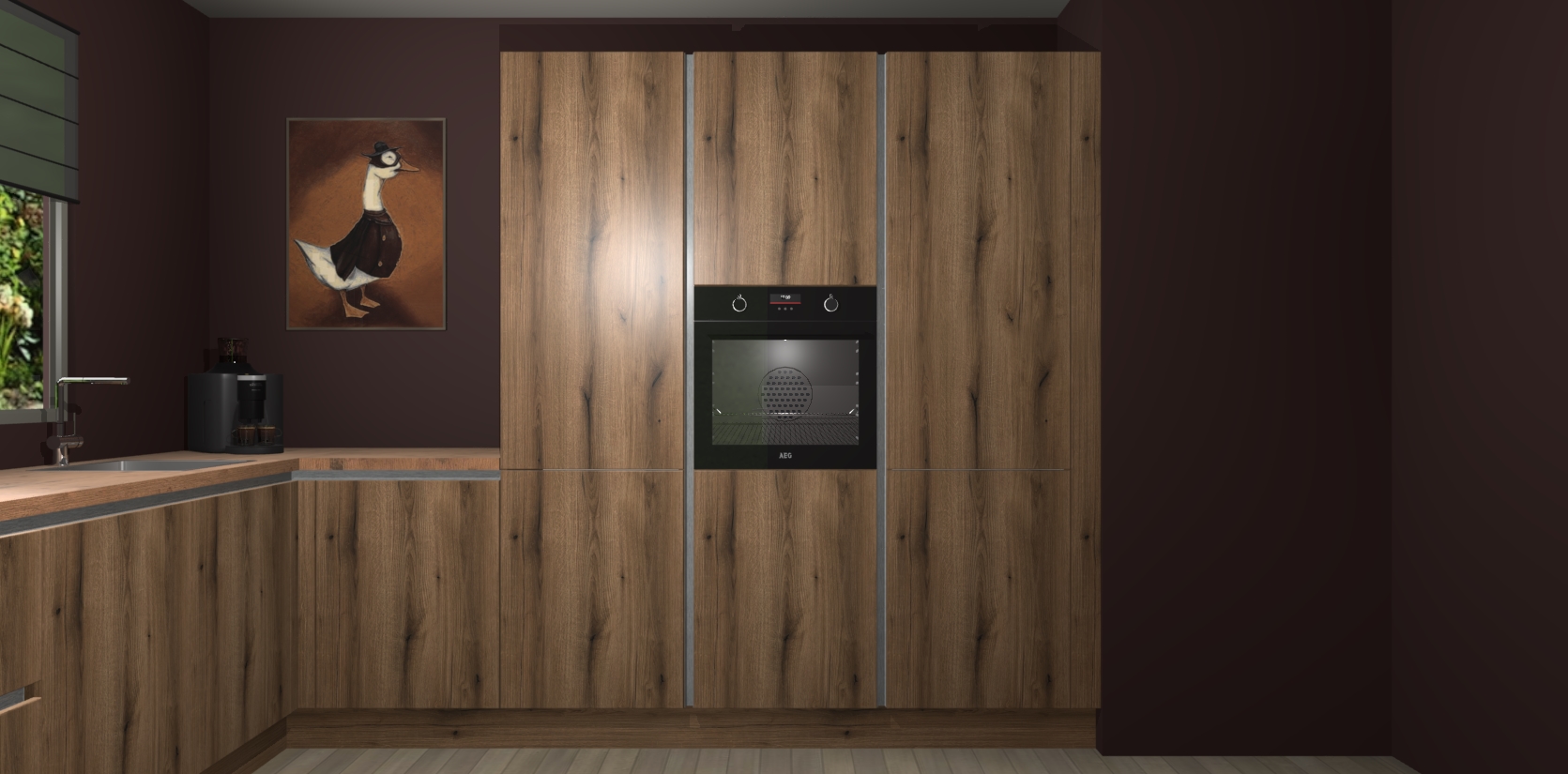 Welkom bij de Goud Eiken greeploze keuken Laos. Deze prachtige keuken zal de komende jaren het middelpunt van de belangstelling in uw huis zijn. Uitgerust met vijf inbouwapparaten komt u nooit kookgereedschap tekort. Bovendien geeft de warme houtlook elke ruimte een uitnodigende en tijdloze uitstraling.