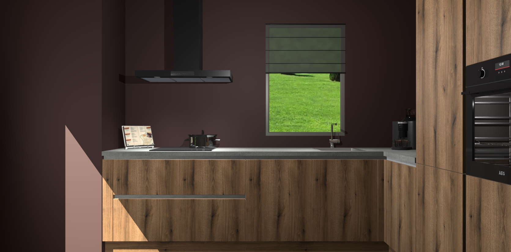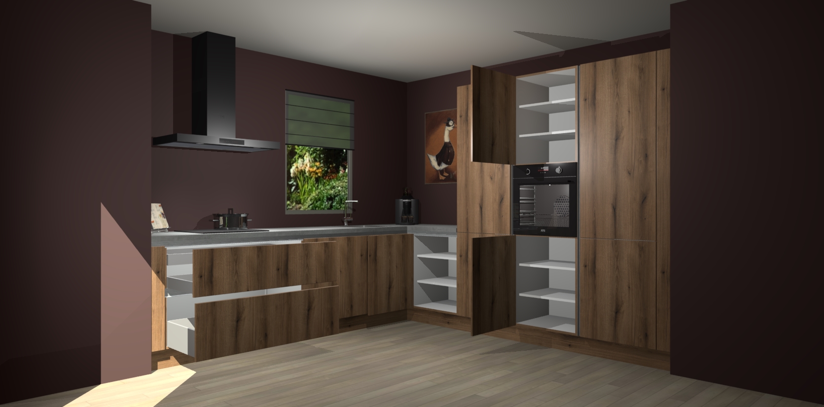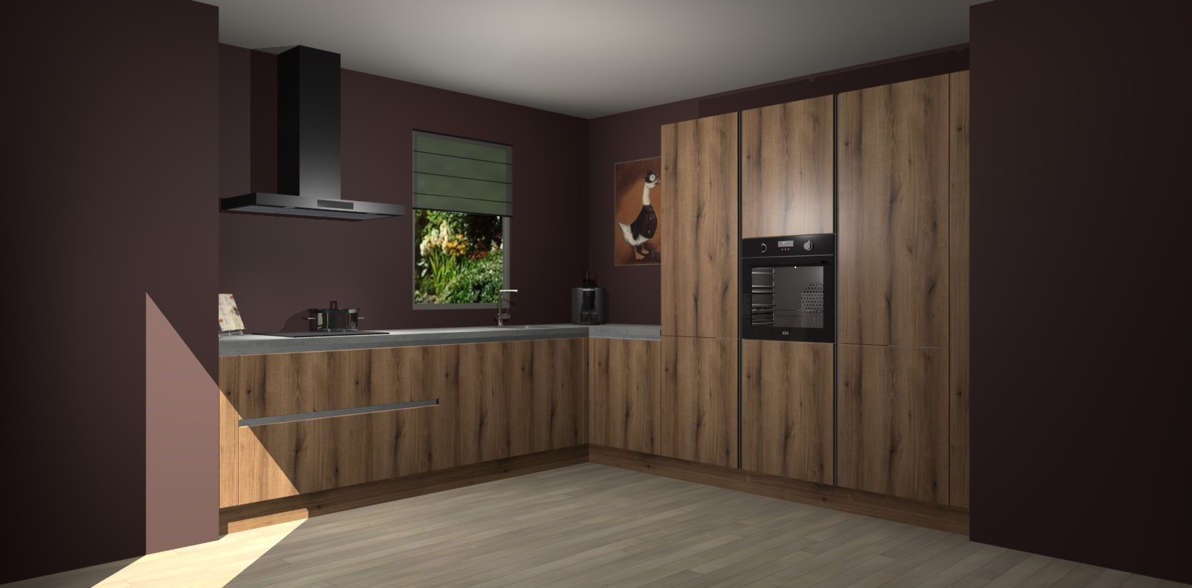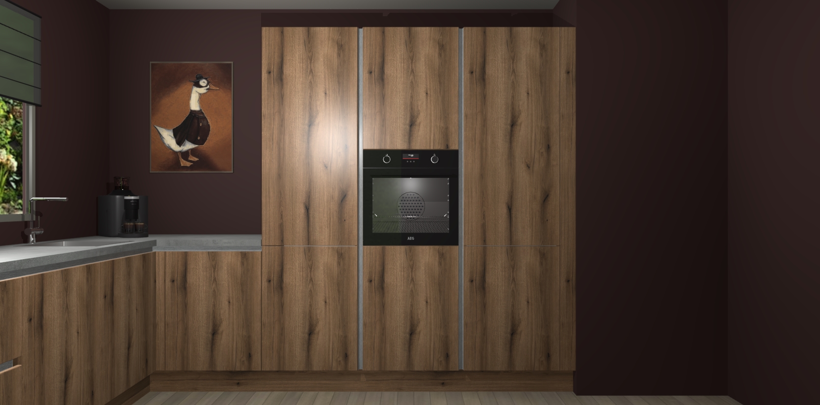 Welkom bij de Goud Eiken greeploze keuken Laos. Deze prachtige keuken zal de komende jaren het middelpunt van de belangstelling in uw huis zijn. Uitgerust met vijf inbouwapparaten komt u nooit kookgereedschap tekort. Bovendien geeft de warme houtlook elke ruimte een uitnodigende en tijdloze uitstraling.