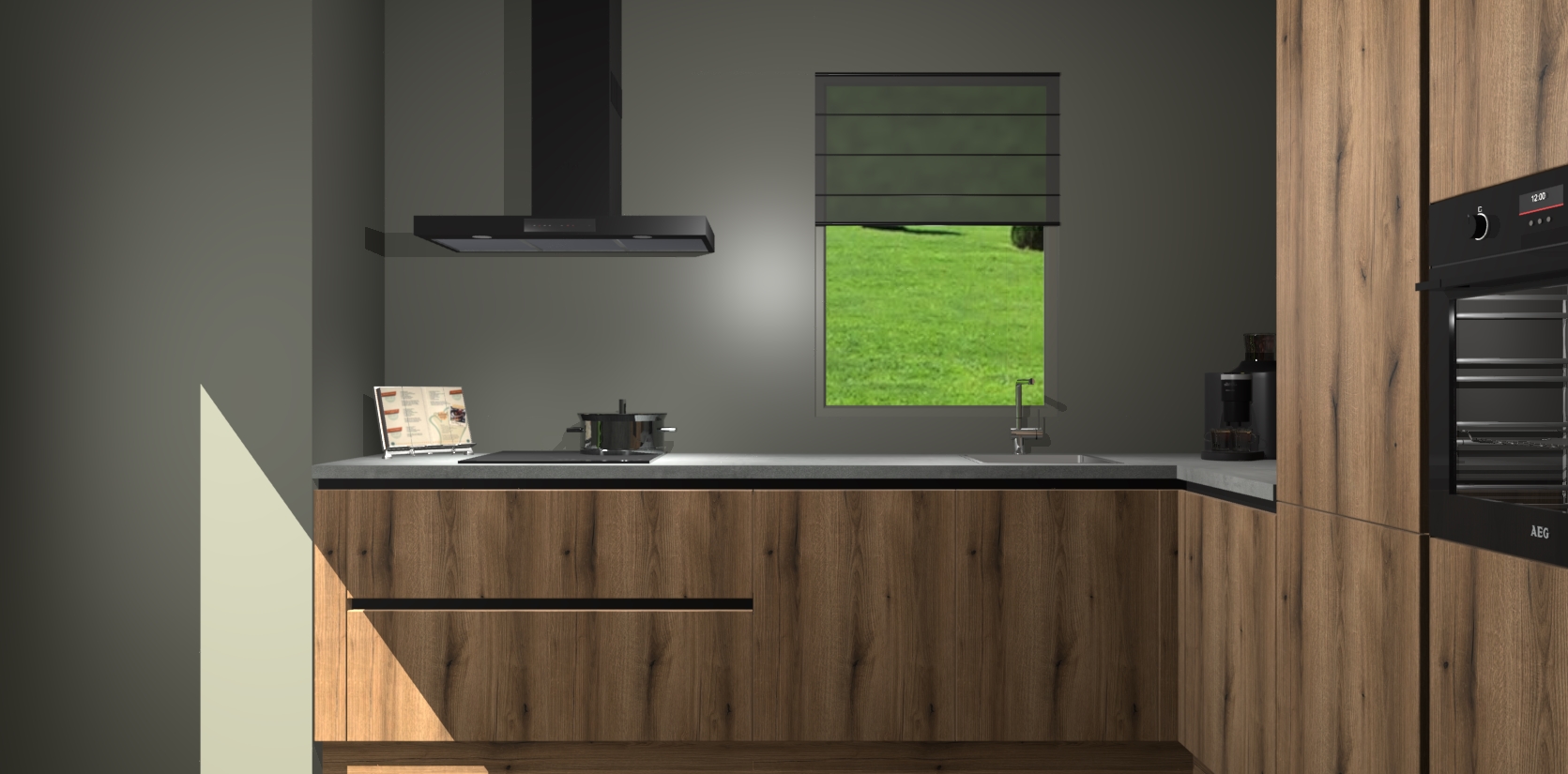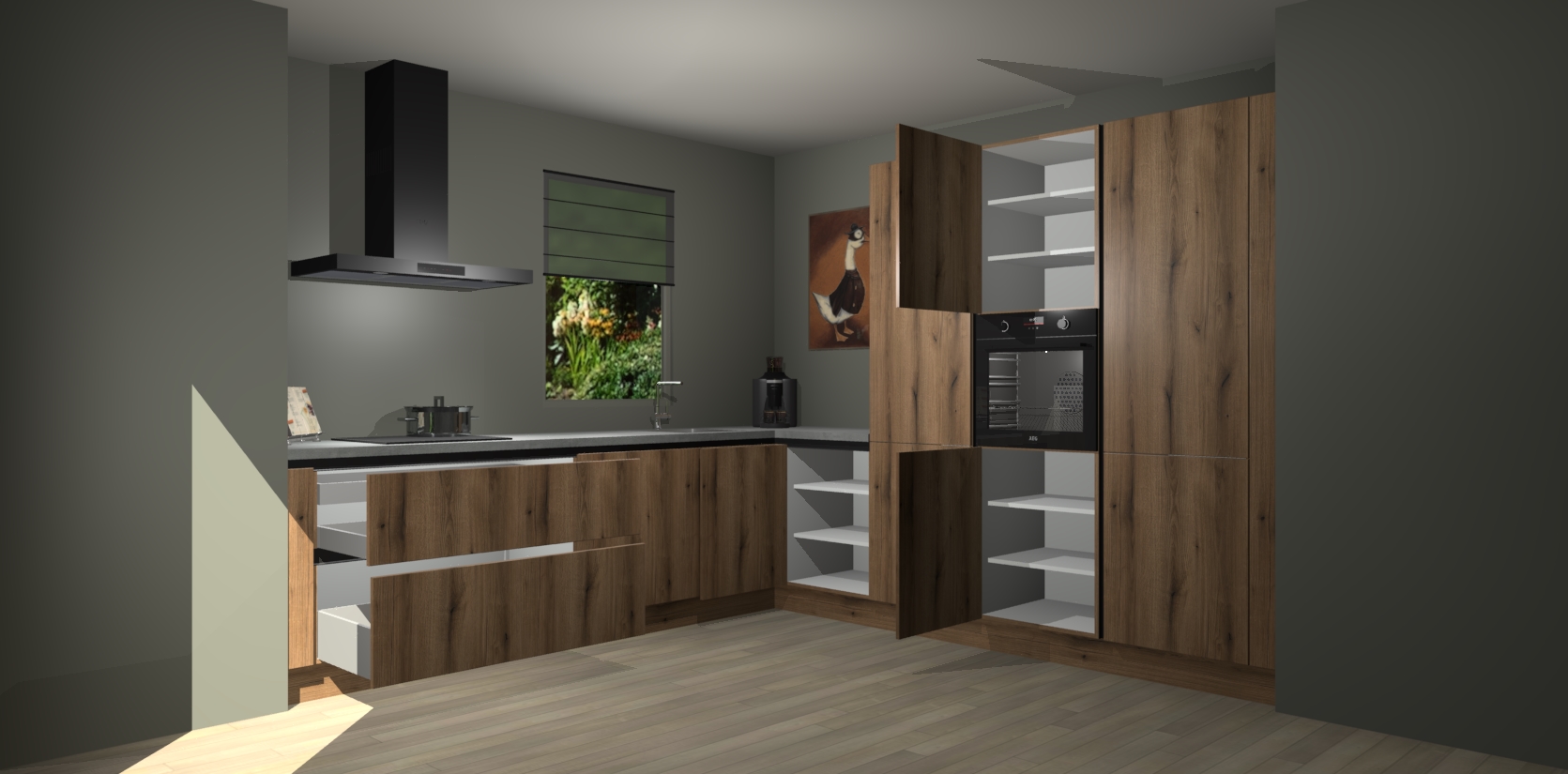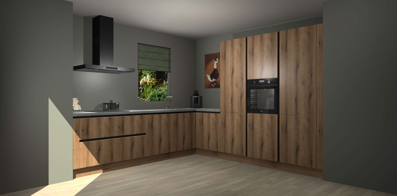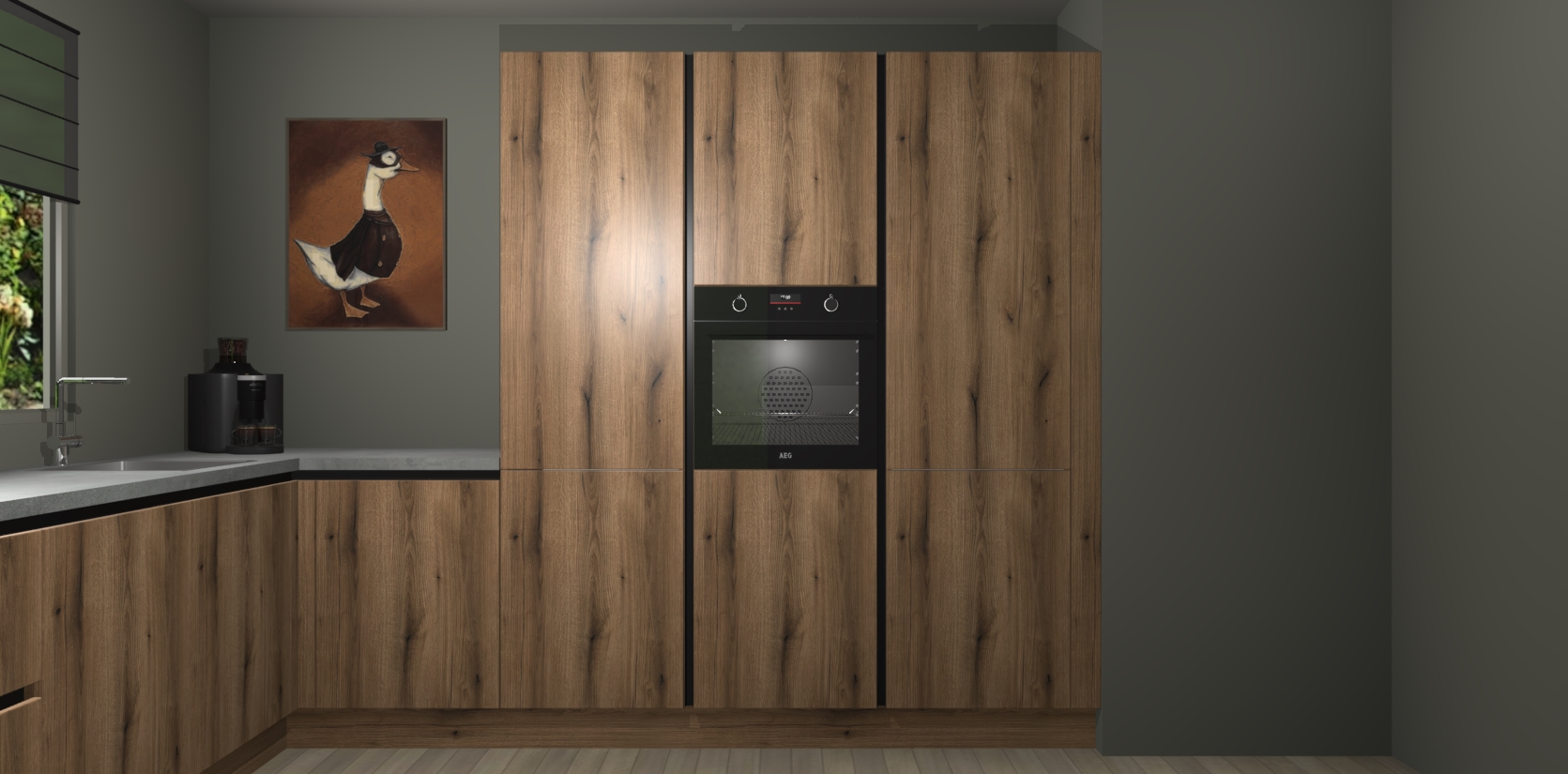 Welkom bij de Goud Eiken greeploze keuken Laos. Deze prachtige keuken zal de komende jaren het middelpunt van de belangstelling in uw huis zijn. Uitgerust met vijf inbouwapparaten komt u nooit kookgereedschap tekort. Bovendien geeft de warme houtlook elke ruimte een uitnodigende en tijdloze uitstraling.