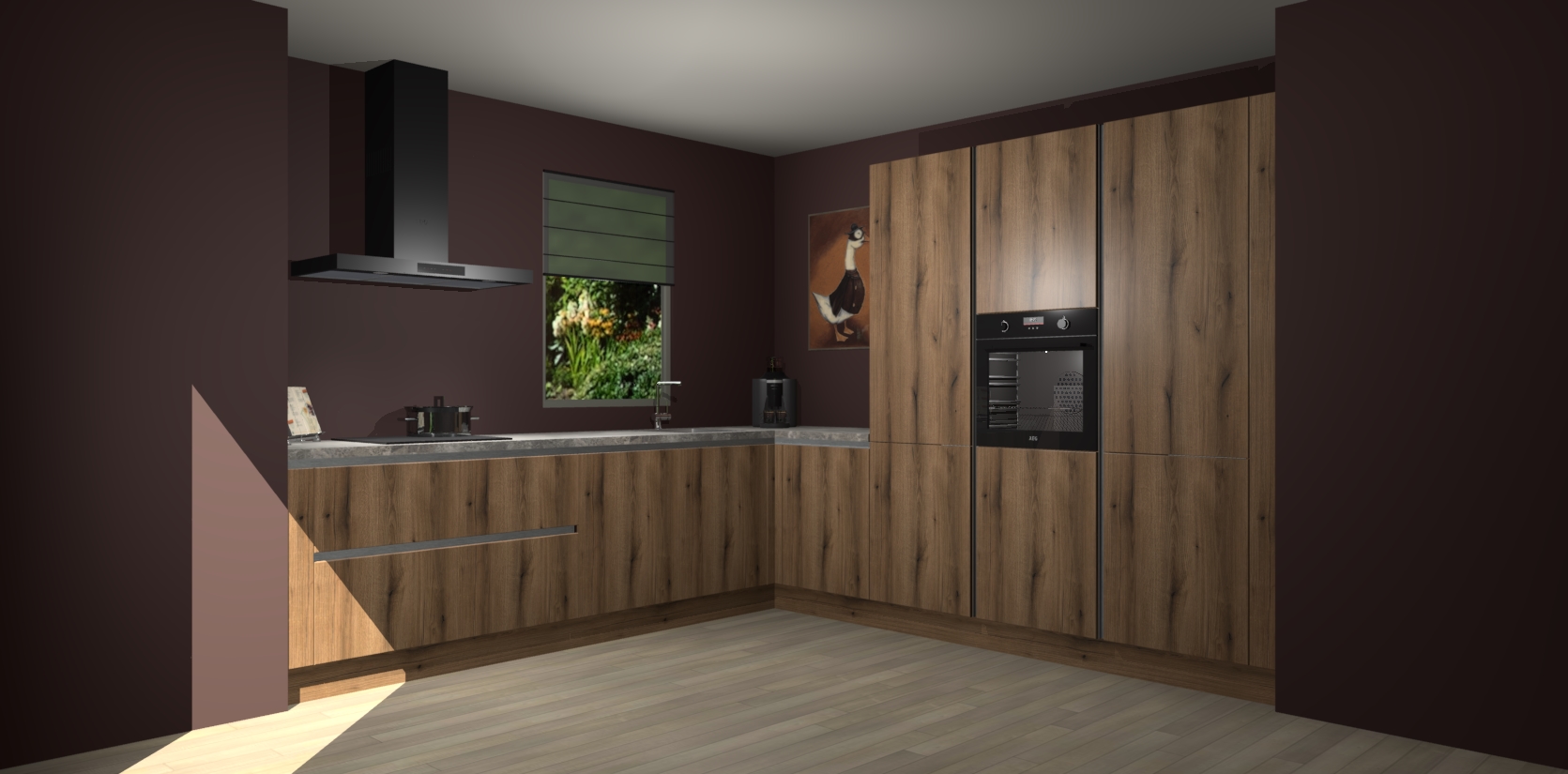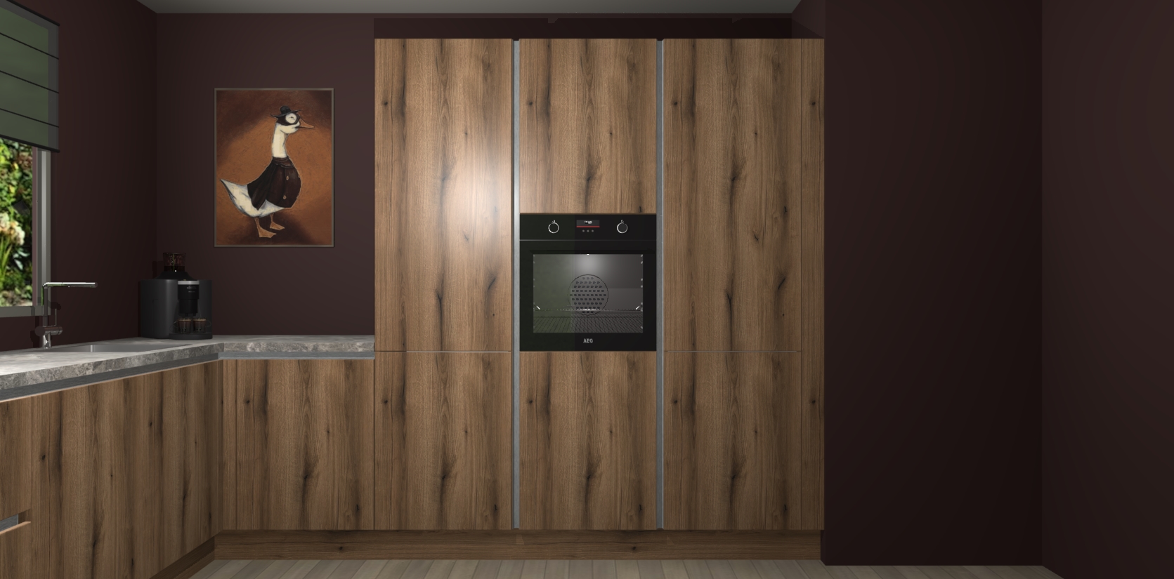 Welkom bij de Goud Eiken greeploze keuken Laos. Deze prachtige keuken zal de komende jaren het middelpunt van de belangstelling in uw huis zijn. Uitgerust met vijf inbouwapparaten komt u nooit kookgereedschap tekort. Bovendien geeft de warme houtlook elke ruimte een uitnodigende en tijdloze uitstraling.