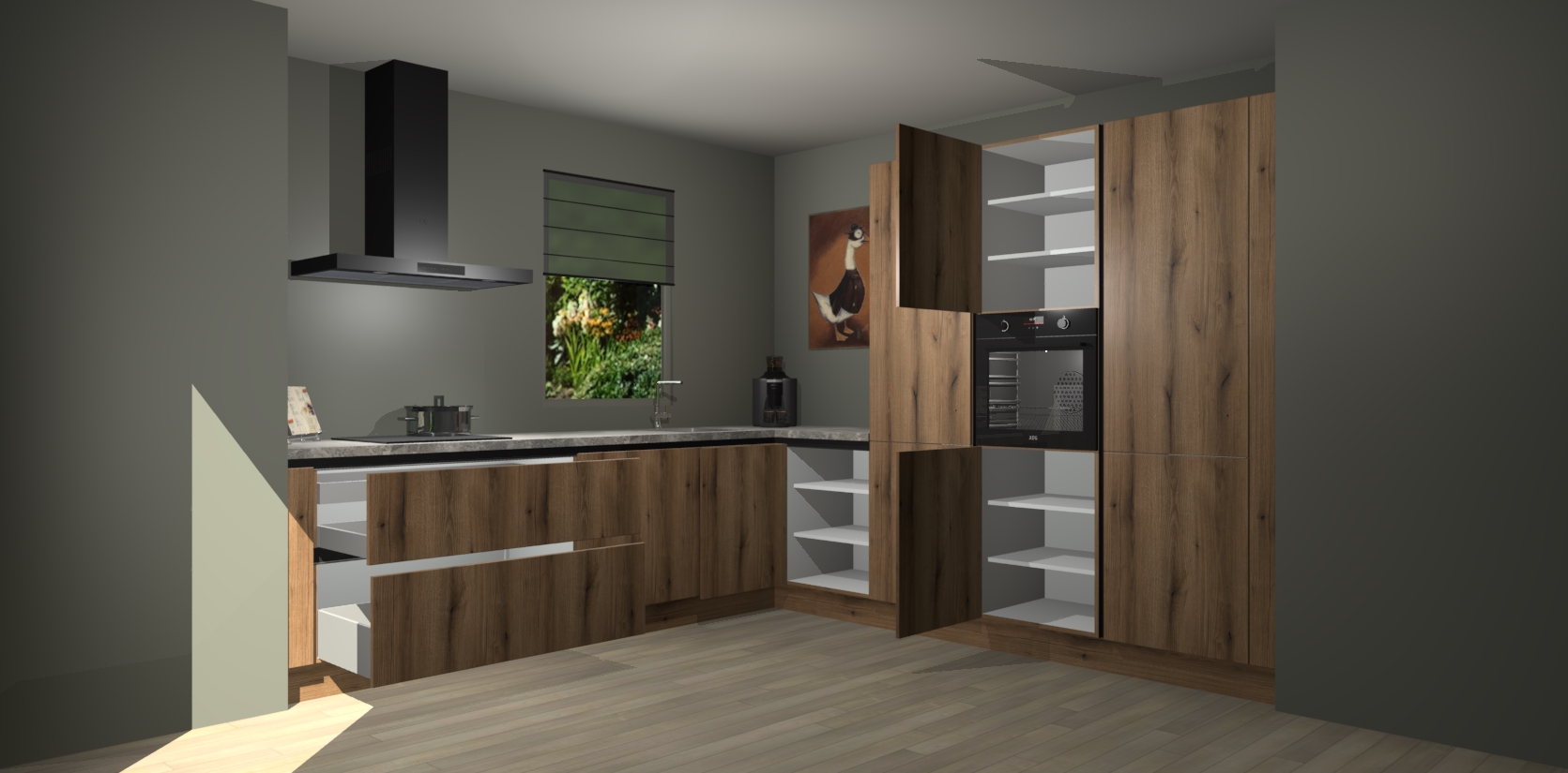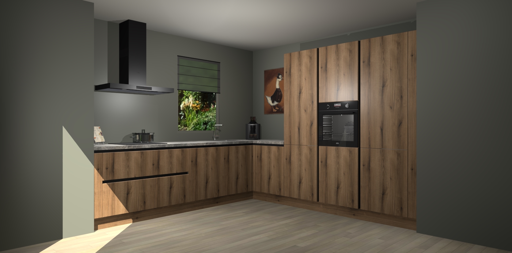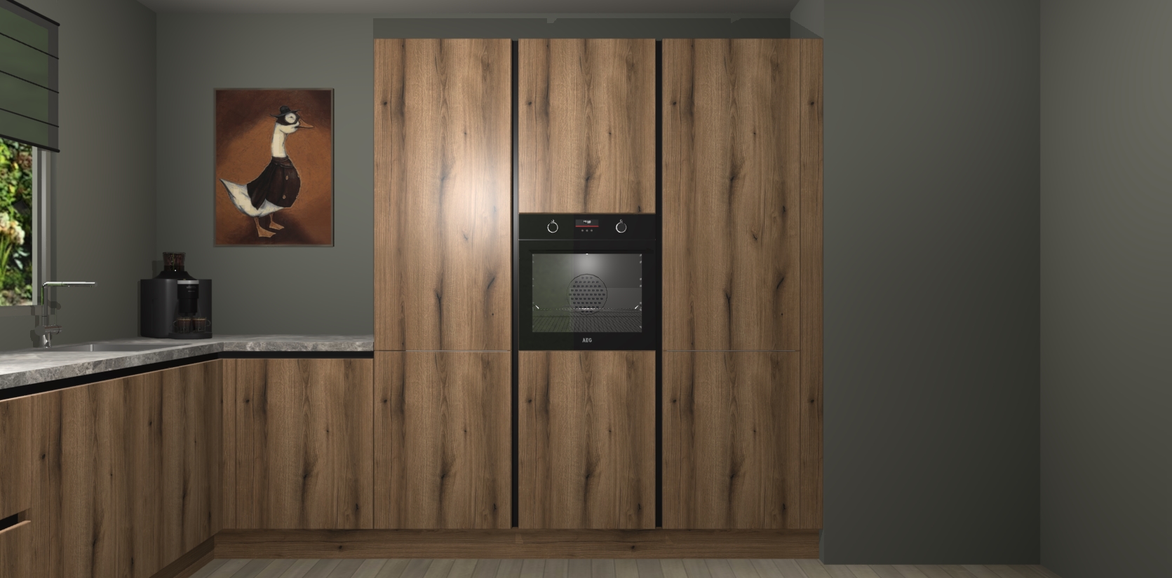Welkom bij de Goud Eiken greeploze keuken Laos. Deze prachtige keuken zal de komende jaren het middelpunt van de belangstelling in uw huis zijn. Uitgerust met vijf inbouwapparaten komt u nooit kookgereedschap tekort. Bovendien geeft de warme houtlook elke ruimte een uitnodigende en tijdloze uitstraling.