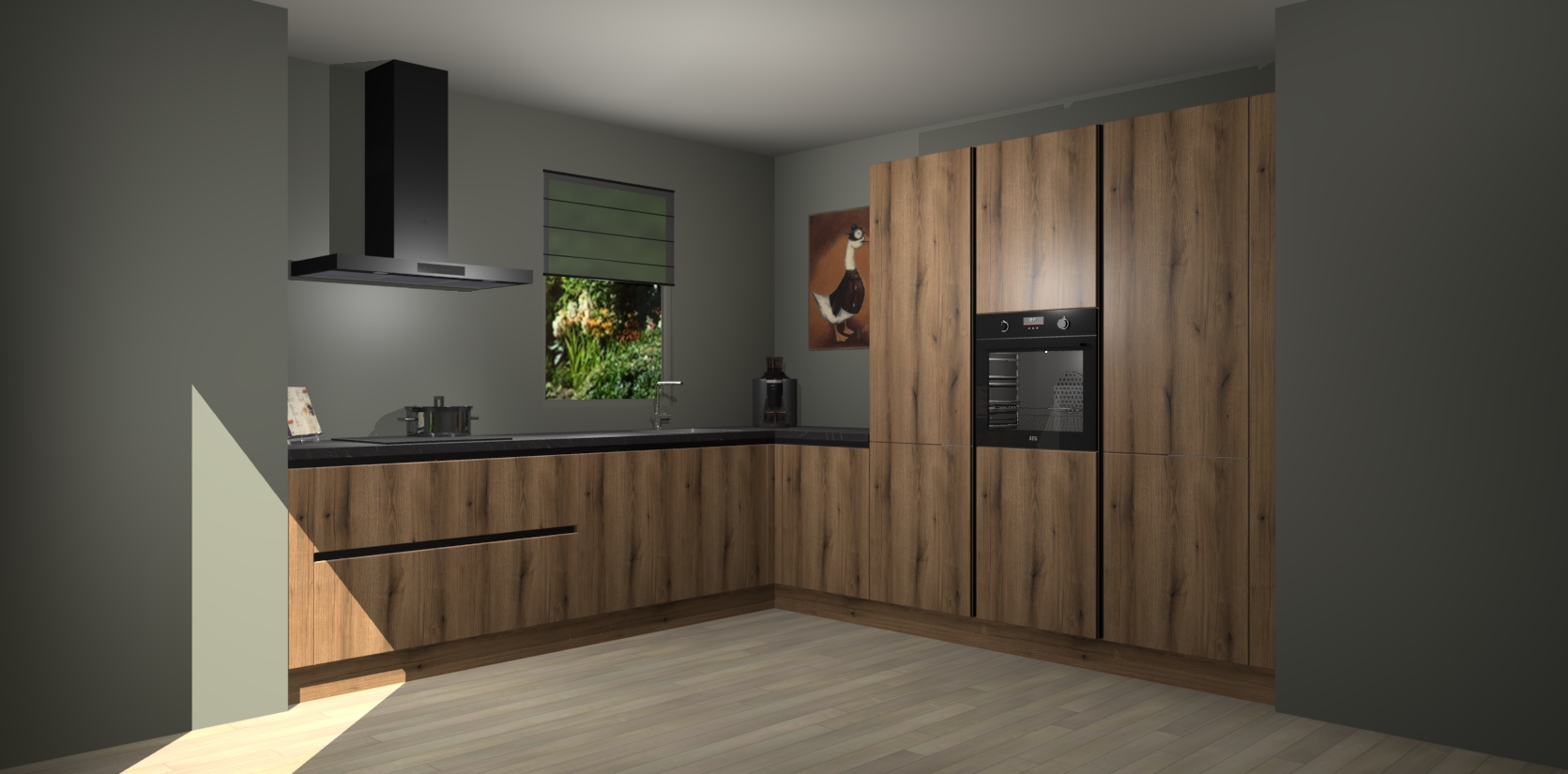 Welkom bij de Goud Eiken greeploze keuken Laos. Deze prachtige keuken zal de komende jaren het middelpunt van de belangstelling in uw huis zijn. Uitgerust met vijf inbouwapparaten komt u nooit kookgereedschap tekort. Bovendien geeft de warme houtlook elke ruimte een uitnodigende en tijdloze uitstraling.
