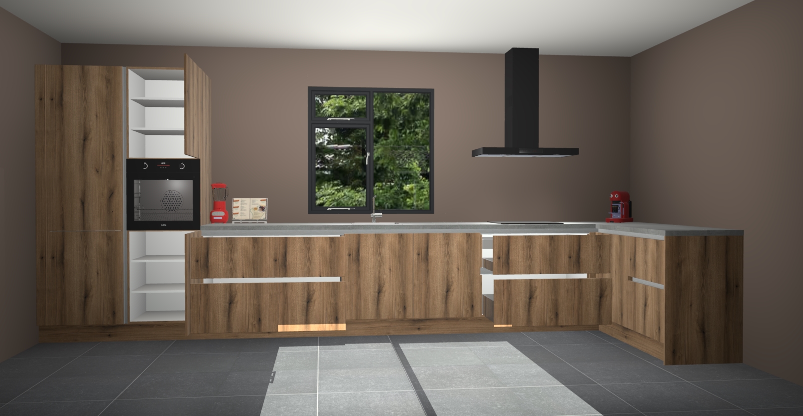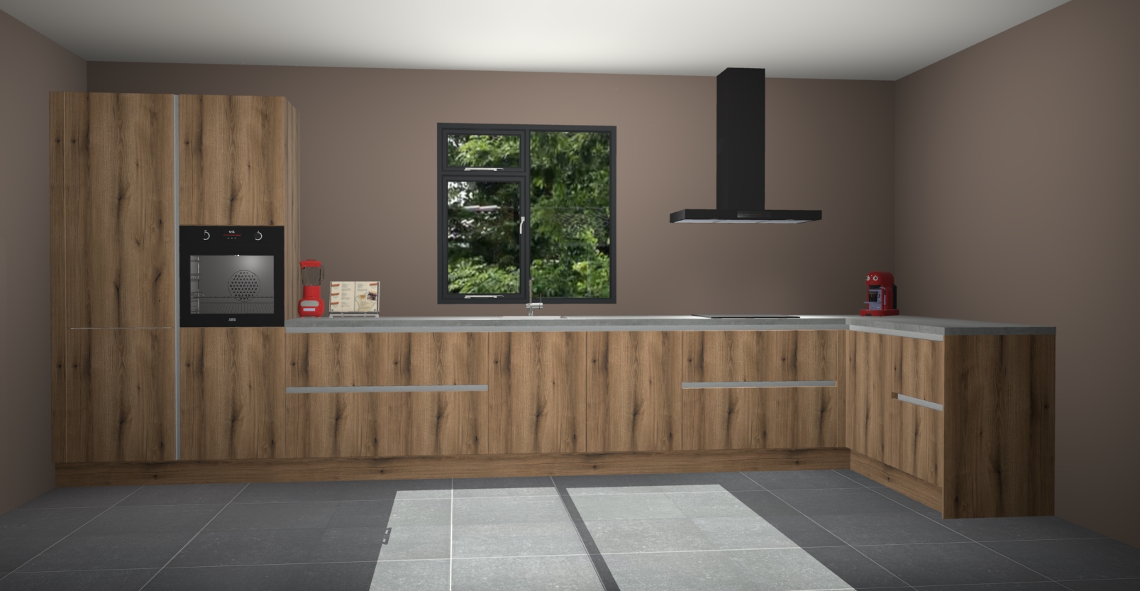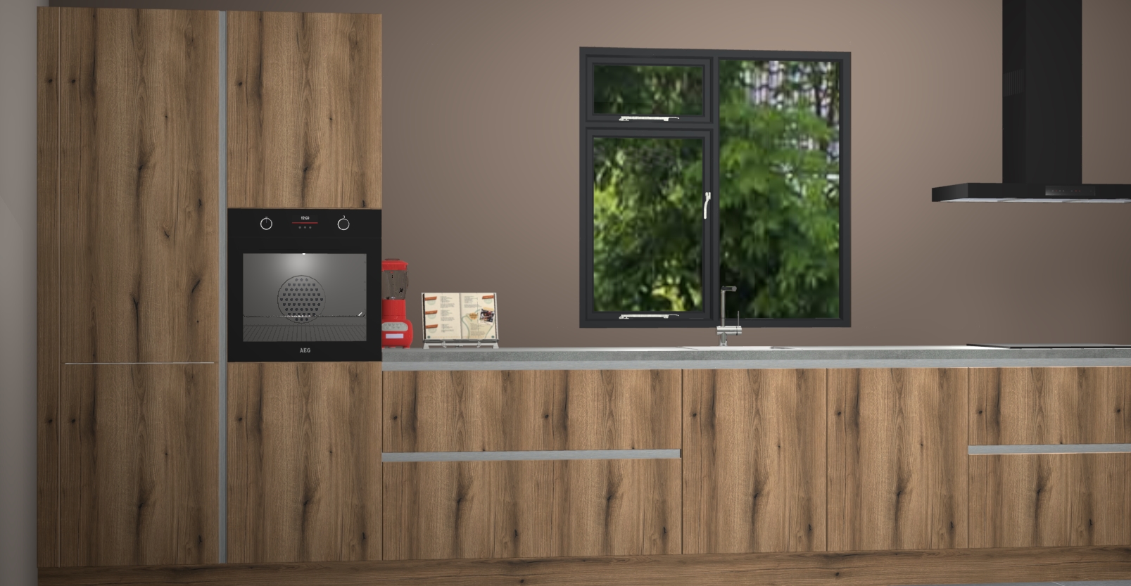 De Goud eiken keuken Lille wordt geleverd met vijf inbouwapparaten - een oven, inductiekookplaat, afzuigkap, vaatwasser en koelkast. Maar dat is nog niet alles! Na bestelling kunnen deze apparaten eenvoudig worden geüpgraded naar premium AEG-apparatuur. Bovendien is er zelfs de optie om de oven te vervangen door een combimagnetron of uw inductiekookplaat te vervangen door een kookplaat met geïntegreerde afzuiging.