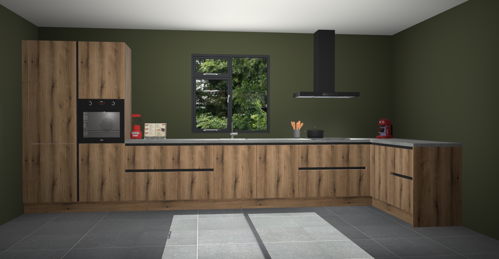De Goud eiken keuken Lille wordt geleverd met vijf inbouwapparaten - een oven, inductiekookplaat, afzuigkap, vaatwasser en koelkast. Maar dat is nog niet alles! Na bestelling kunnen deze apparaten eenvoudig worden geüpgraded naar premium AEG-apparatuur. Bovendien is er zelfs de optie om de oven te vervangen door een combimagnetron of uw inductiekookplaat te vervangen door een kookplaat met geïntegreerde afzuiging.