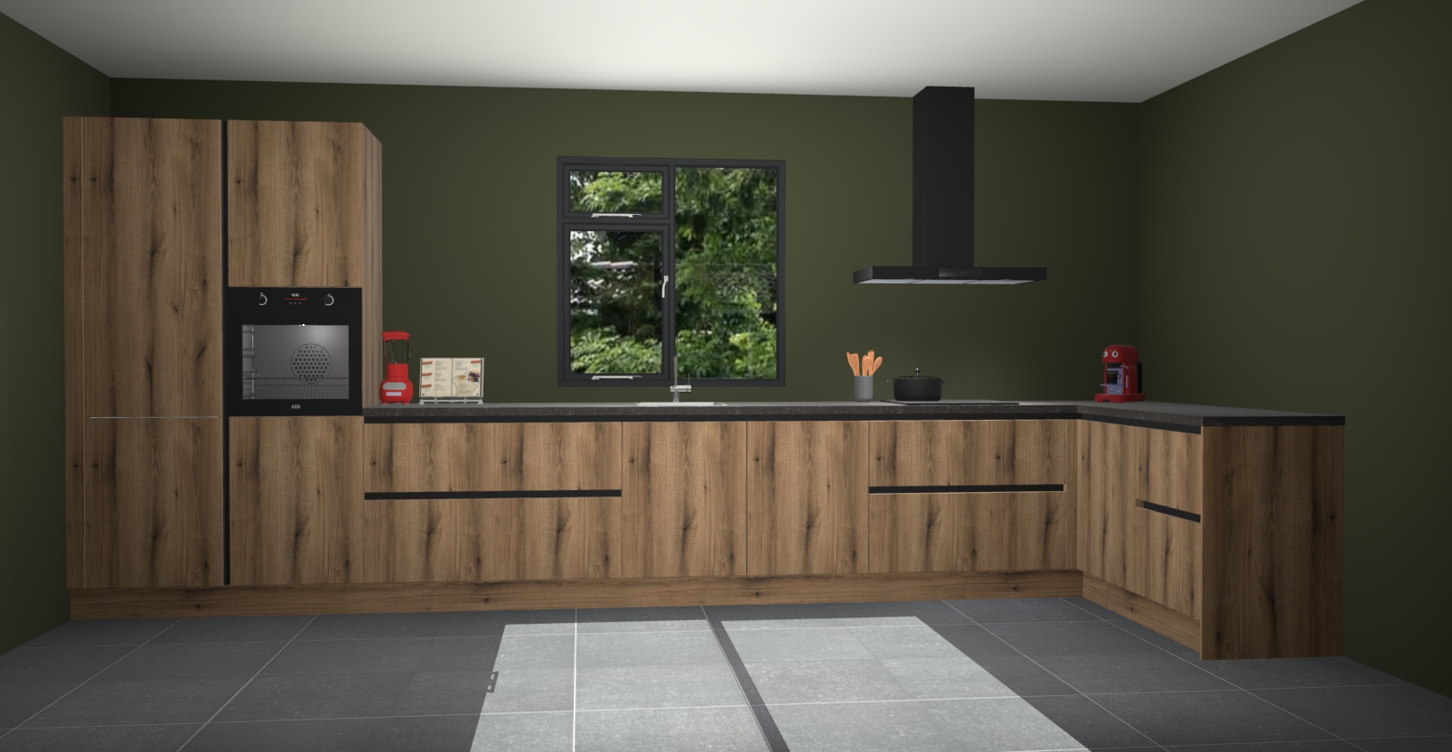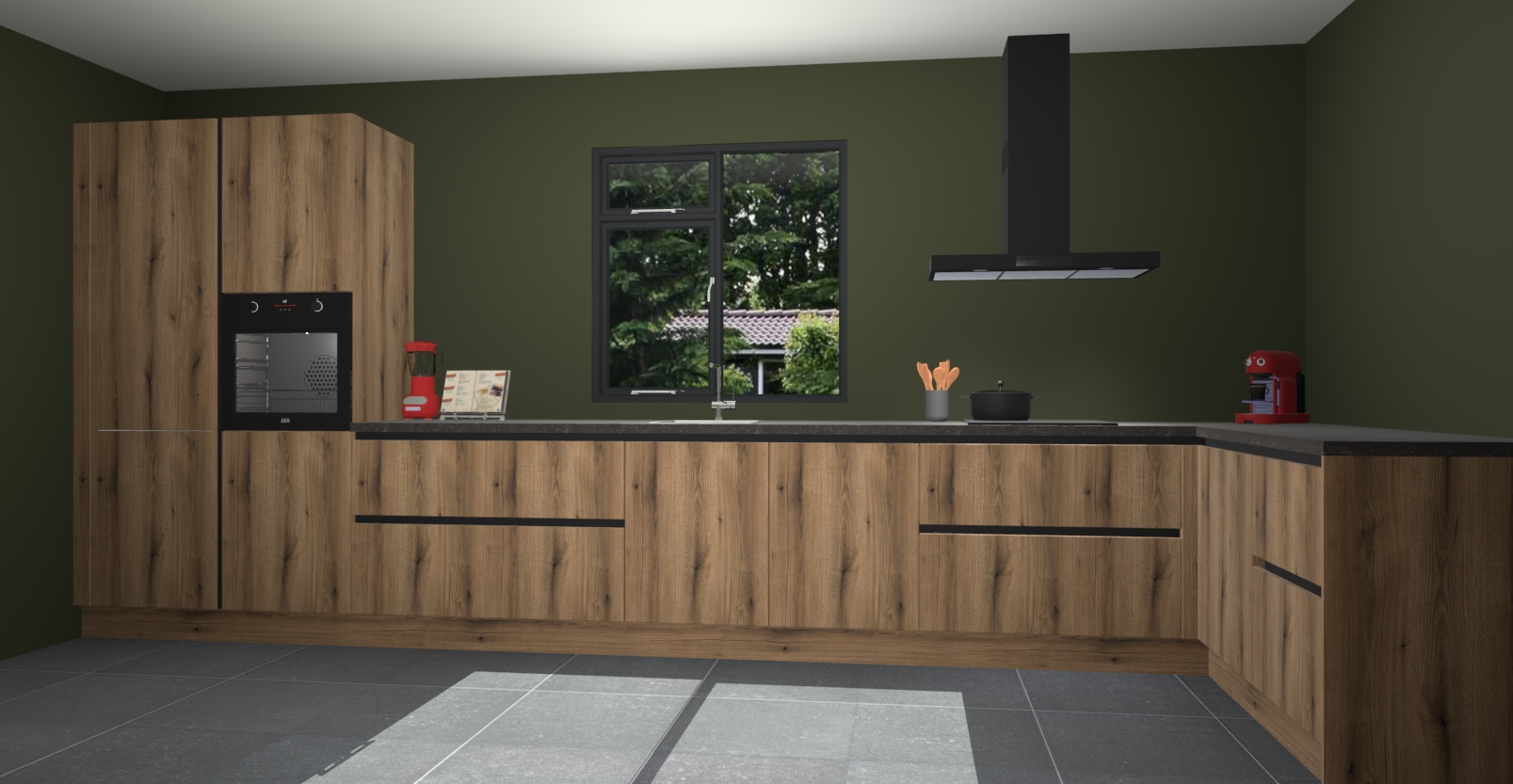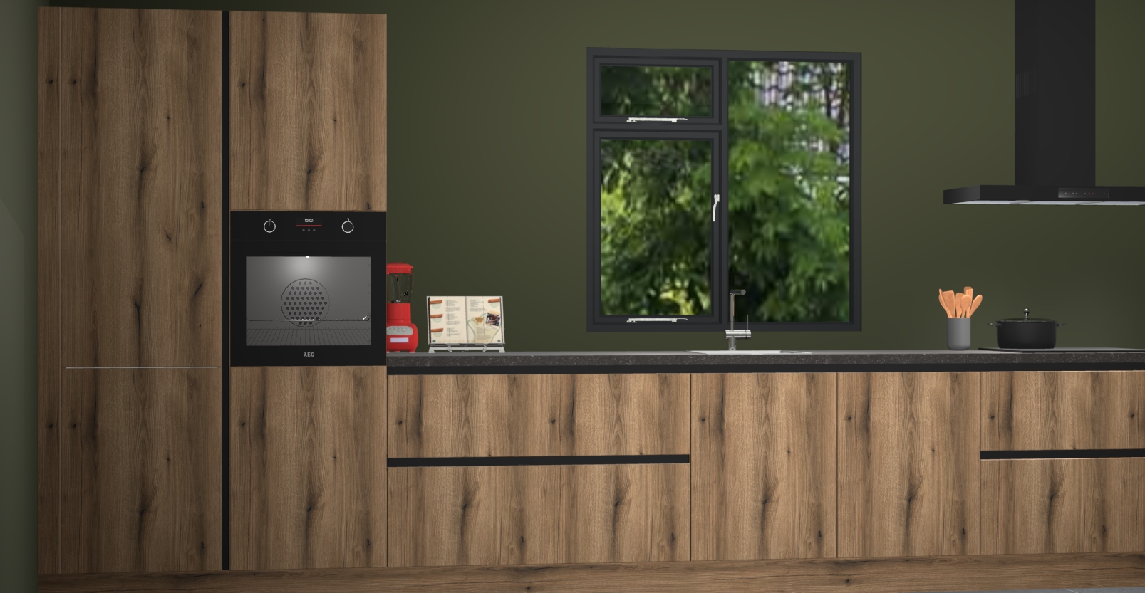 De Goud eiken keuken Lille wordt geleverd met vijf inbouwapparaten - een oven, inductiekookplaat, afzuigkap, vaatwasser en koelkast. Maar dat is nog niet alles! Na bestelling kunnen deze apparaten eenvoudig worden geüpgraded naar premium AEG-apparatuur. Bovendien is er zelfs de optie om de oven te vervangen door een combimagnetron of uw inductiekookplaat te vervangen door een kookplaat met geïntegreerde afzuiging.