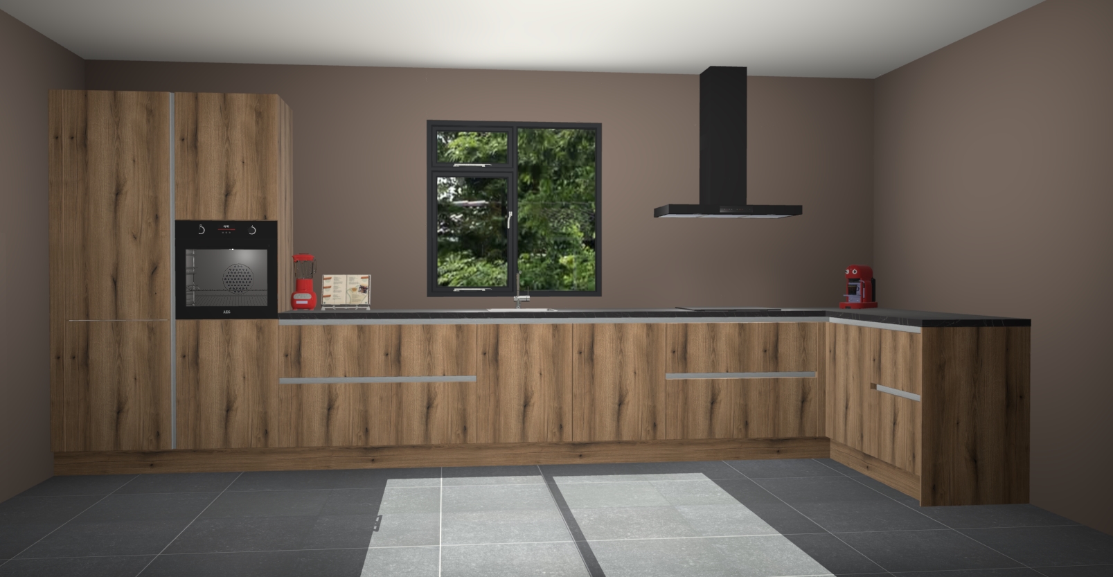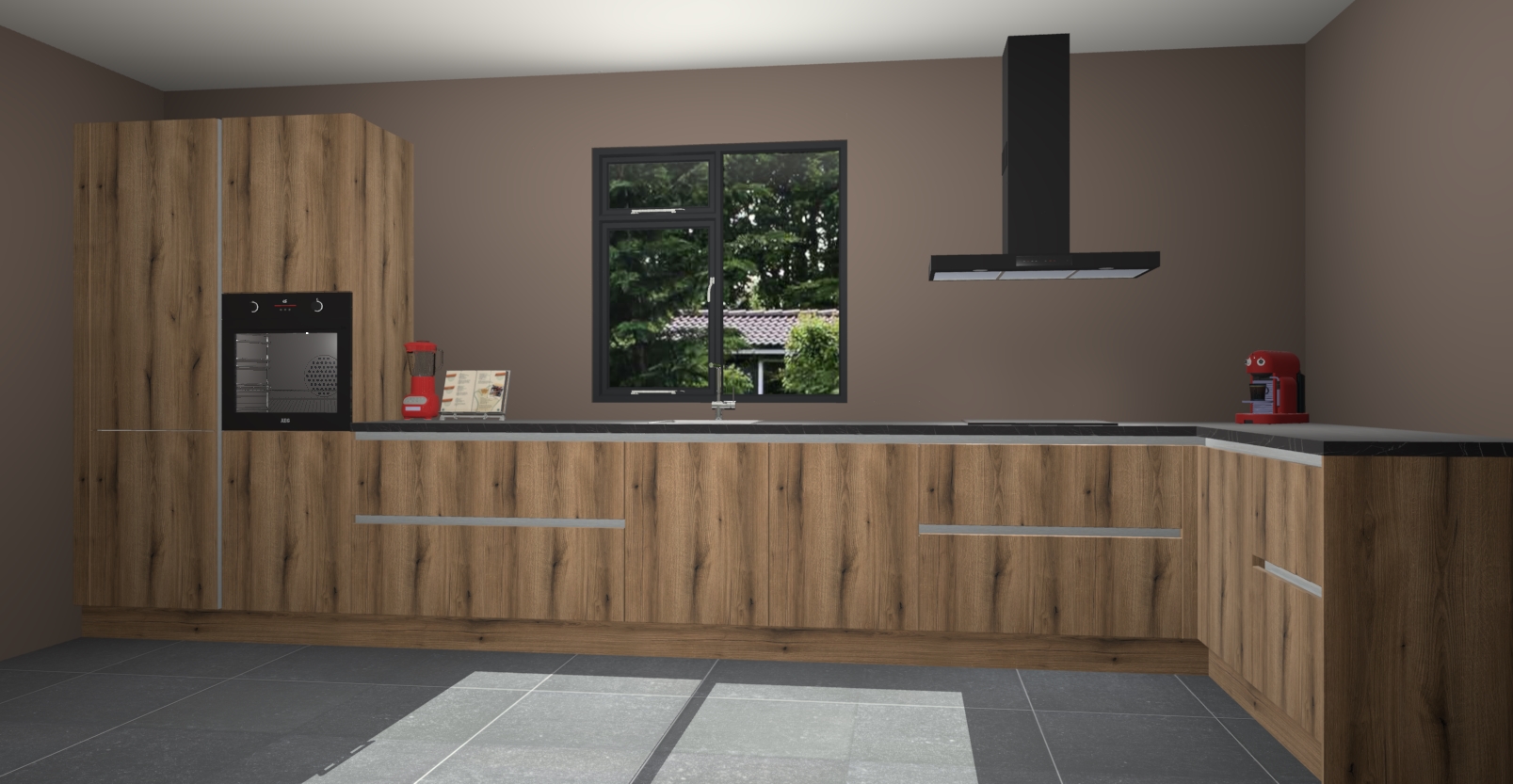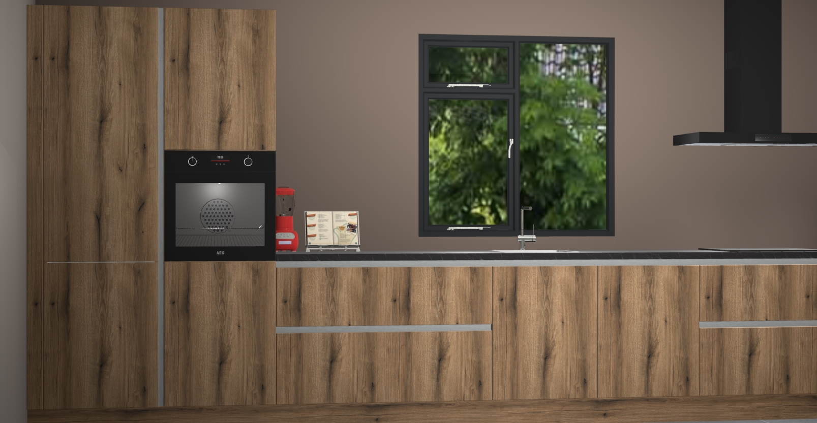 De Goud eiken keuken Lille wordt geleverd met vijf inbouwapparaten - een oven, inductiekookplaat, afzuigkap, vaatwasser en koelkast. Maar dat is nog niet alles! Na bestelling kunnen deze apparaten eenvoudig worden geüpgraded naar premium AEG-apparatuur. Bovendien is er zelfs de optie om de oven te vervangen door een combimagnetron of uw inductiekookplaat te vervangen door een kookplaat met geïntegreerde afzuiging.