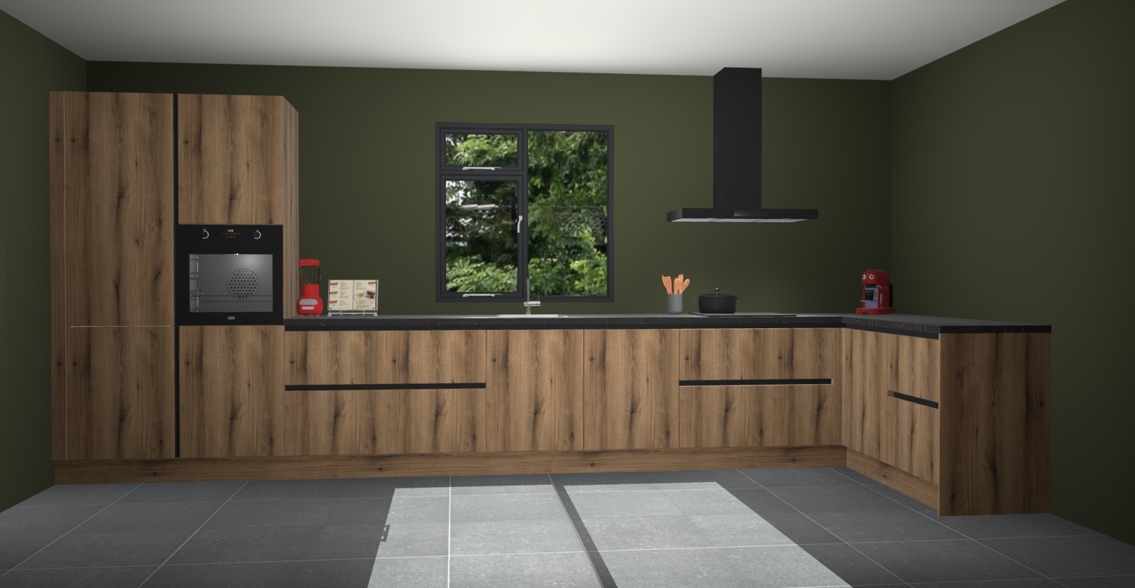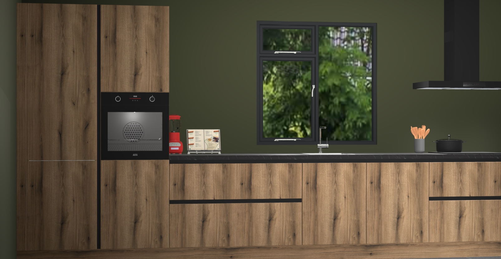 De Goud eiken keuken Lille wordt geleverd met vijf inbouwapparaten - een oven, inductiekookplaat, afzuigkap, vaatwasser en koelkast. Maar dat is nog niet alles! Na bestelling kunnen deze apparaten eenvoudig worden geüpgraded naar premium AEG-apparatuur. Bovendien is er zelfs de optie om de oven te vervangen door een combimagnetron of uw inductiekookplaat te vervangen door een kookplaat met geïntegreerde afzuiging.