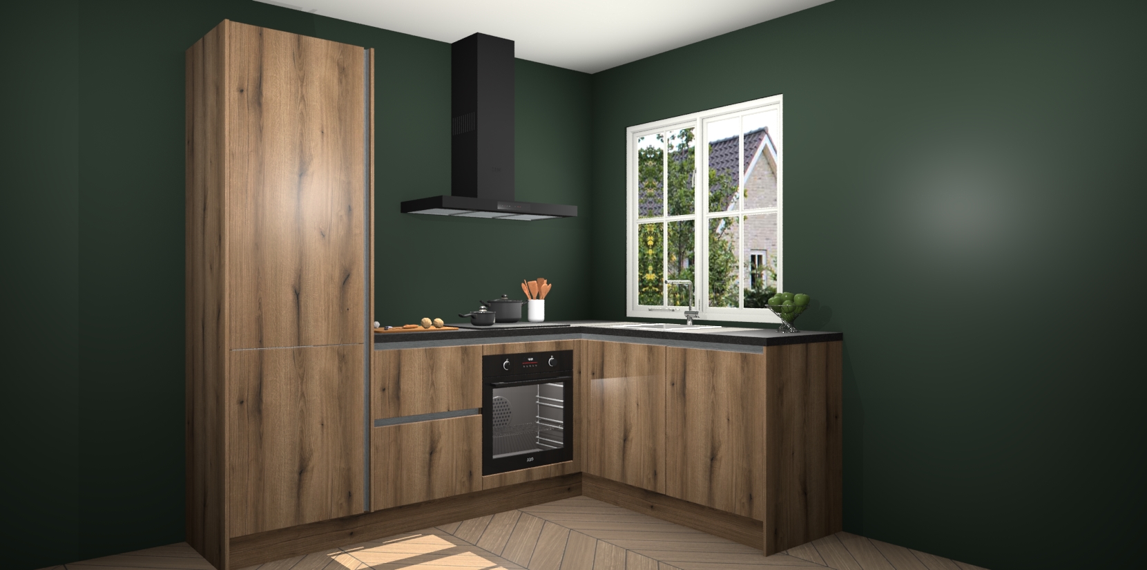 De Goud Eiken greeploze keuken Linz is de perfecte keuze voor uw nieuwe moderne en tijdloze keuken. Ga voor moderne en tijdloze elegantie in uw keuken. De prachtige hoekkeuken biedt een verfrissende kijk op de manier waarop we ons vertrouwde keukenontwerp kunnen aanpassen in een nieuwe stijl. Één blik om alles te zien: zo mooi dat het bijna magisch lijkt.