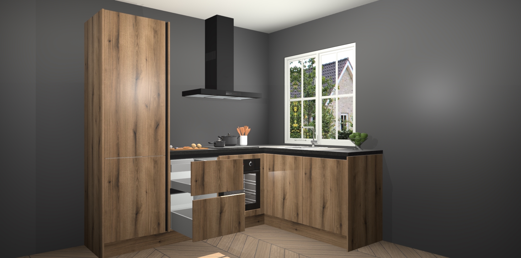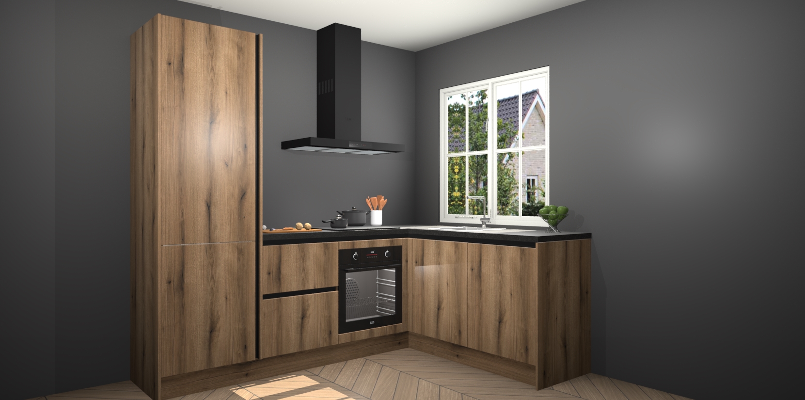 De Goud Eiken greeploze keuken Linz is de perfecte keuze voor uw nieuwe moderne en tijdloze keuken. Ga voor moderne en tijdloze elegantie in uw keuken. De prachtige hoekkeuken biedt een verfrissende kijk op de manier waarop we ons vertrouwde keukenontwerp kunnen aanpassen in een nieuwe stijl. Één blik om alles te zien: zo mooi dat het bijna magisch lijkt.