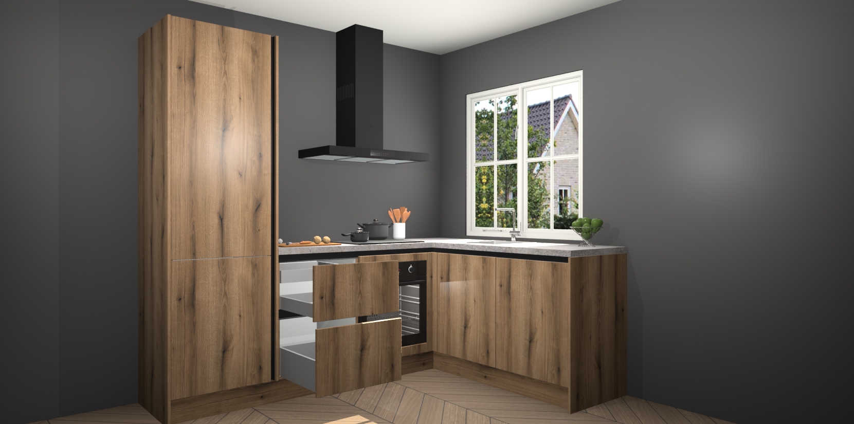 De Goud Eiken greeploze keuken Linz is de perfecte keuze voor uw nieuwe moderne en tijdloze keuken. Ga voor moderne en tijdloze elegantie in uw keuken. De prachtige hoekkeuken biedt een verfrissende kijk op de manier waarop we ons vertrouwde keukenontwerp kunnen aanpassen in een nieuwe stijl. Één blik om alles te zien: zo mooi dat het bijna magisch lijkt.