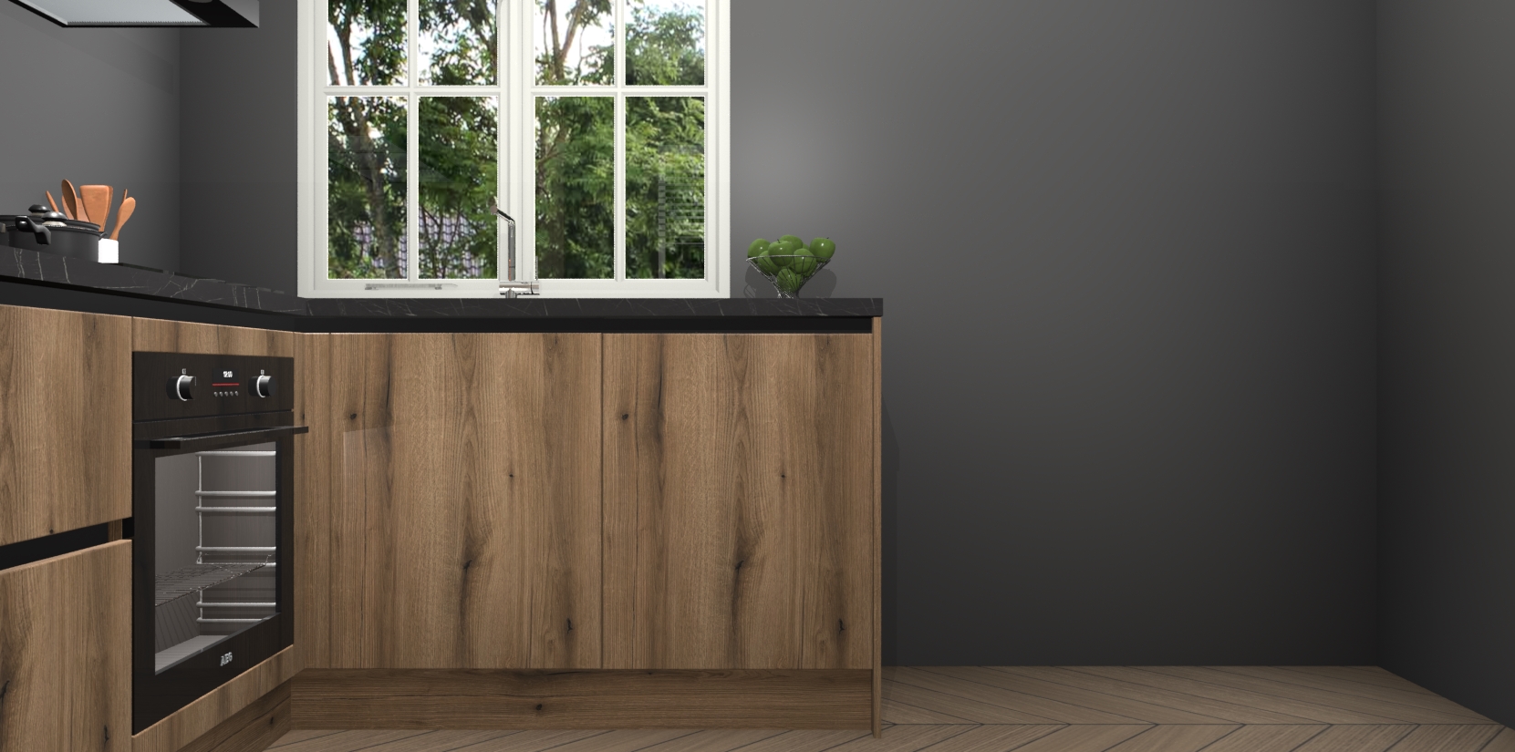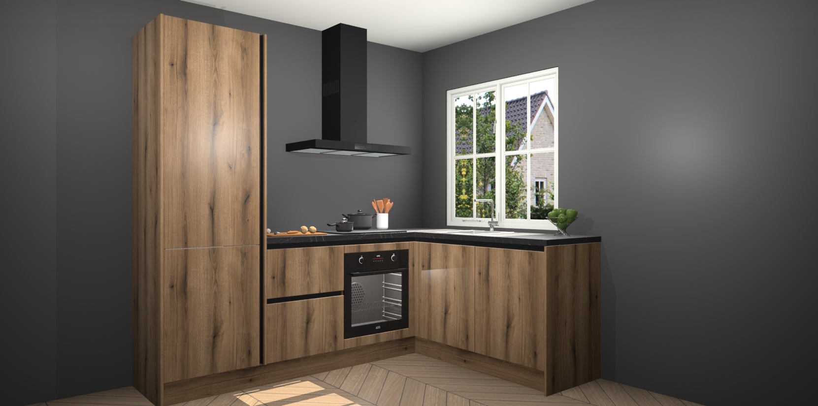 De Goud Eiken greeploze keuken Linz is de perfecte keuze voor uw nieuwe moderne en tijdloze keuken. Ga voor moderne en tijdloze elegantie in uw keuken. De prachtige hoekkeuken biedt een verfrissende kijk op de manier waarop we ons vertrouwde keukenontwerp kunnen aanpassen in een nieuwe stijl. Één blik om alles te zien: zo mooi dat het bijna magisch lijkt.