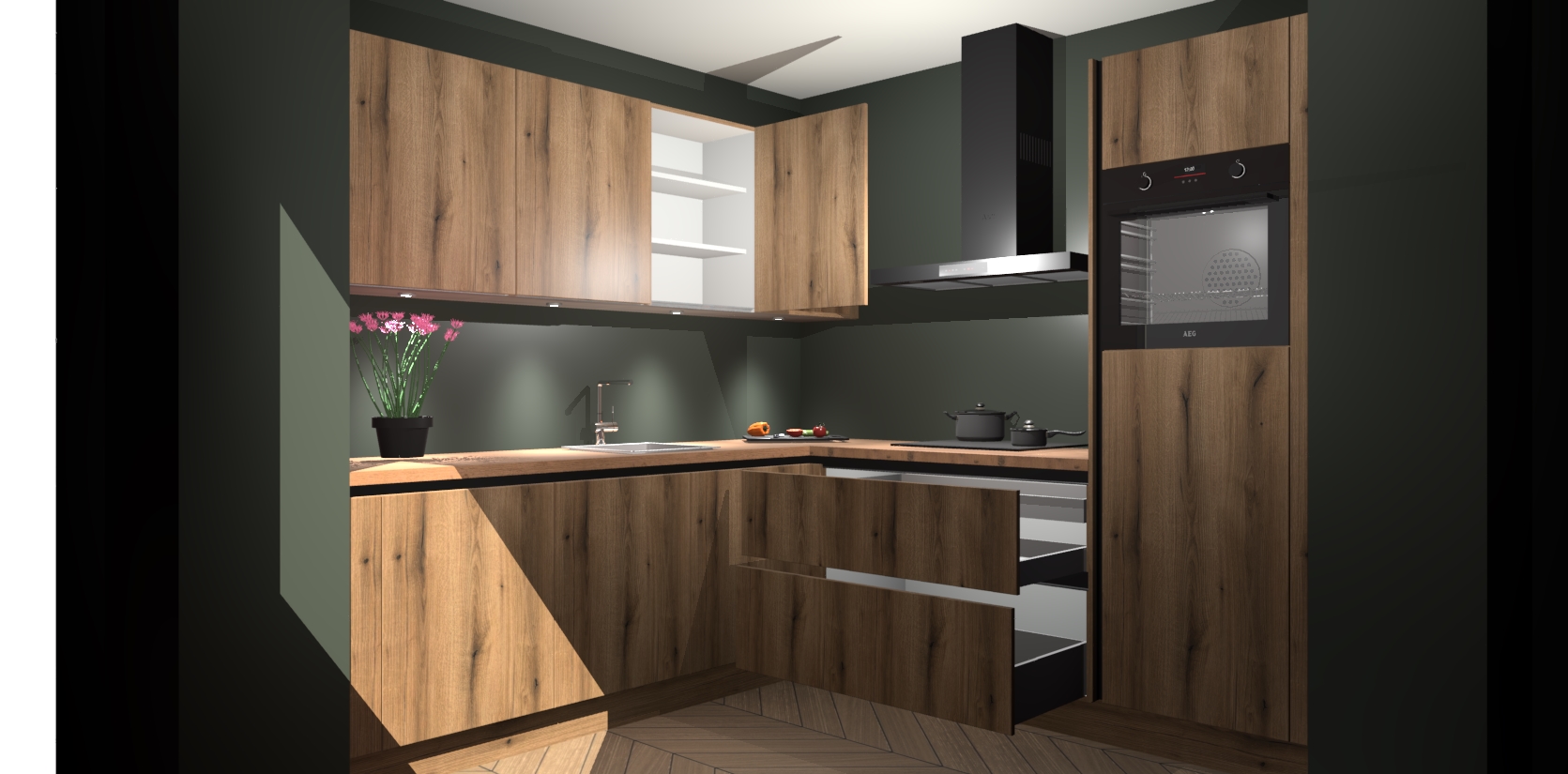Met een modern, tijdloos design en ruime opslagruimte, zult u zich in no-time thuis voelen in uw nieuwe keuken. Uw leven wordt eenvoudiger met de soft-close deuren die voor het ultieme stille comfort zorgen - geen geluid dat u stoort terwijl u kookt. Ook is de keuken voorzien van 5 ingebouwde apparaten: een oven, inductie kookplaat, afzuigkap, vaatwasser en koelkast. Deze kunnen gemakkelijk na bestelling worden bijgewerkt naar AEG - waardoor uw luxe ervaring compleet is.