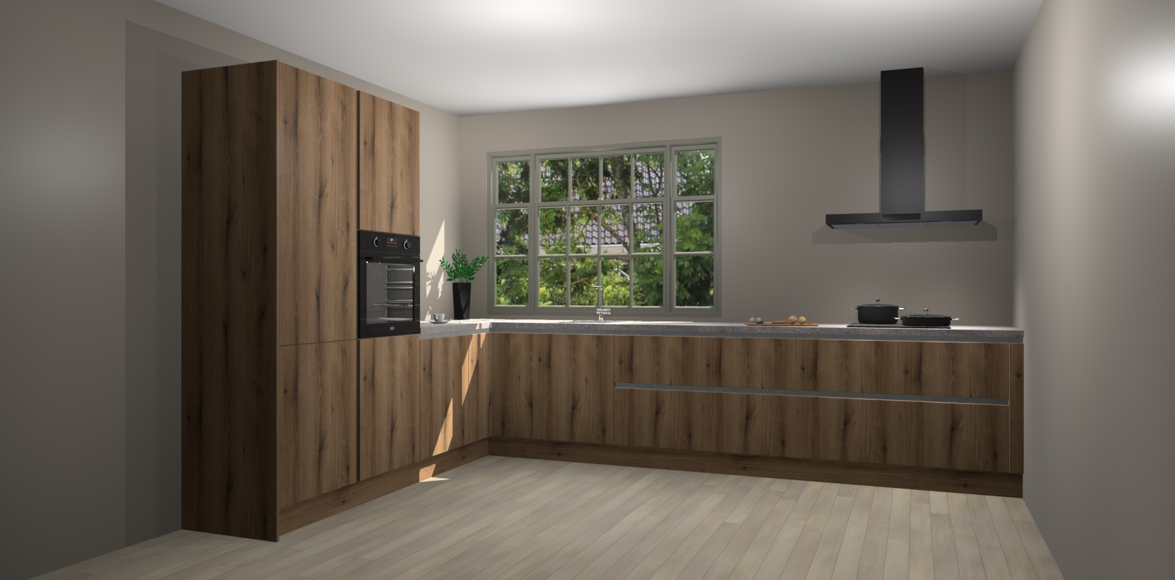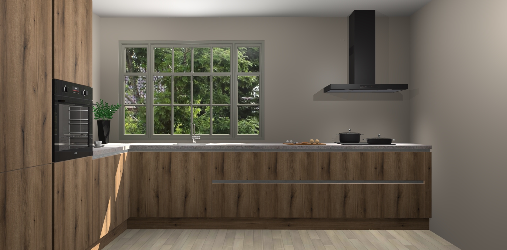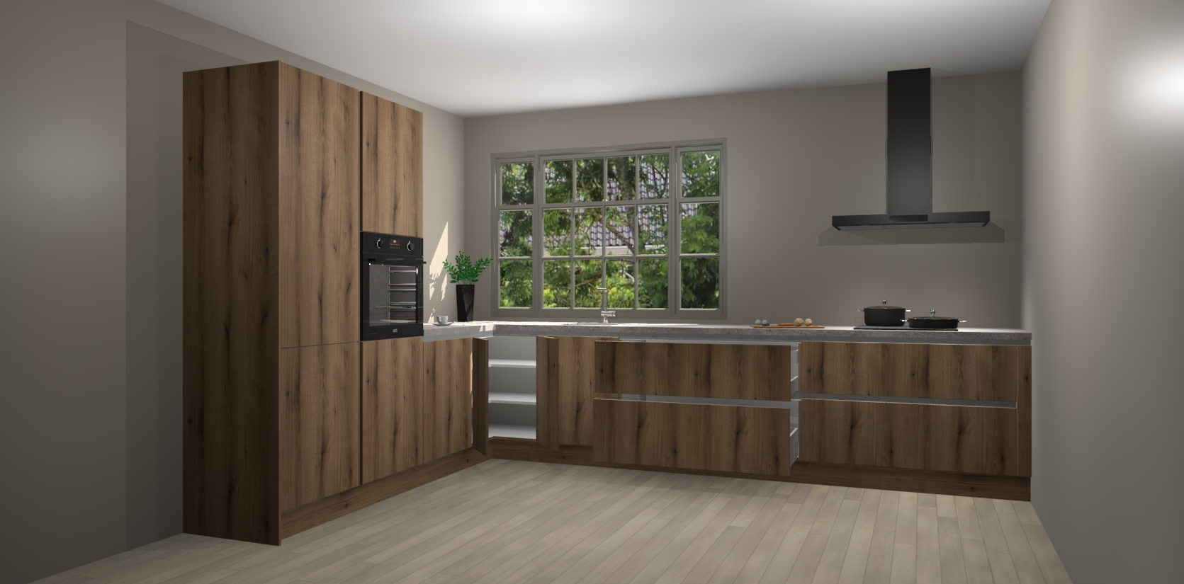 Kom dichtbij de perfecte keuken van uw dromen met de Goud Eiken greeploze keuken Malaga. Met een prachtige houtlook en eigentijds ontwerp, straalt deze keuken warmte en sfeer uit. Of u nu liefhebber bent van traditionele of moderne stijlen, er is genoeg ruimte om aan al uw behoeften te voldoen.