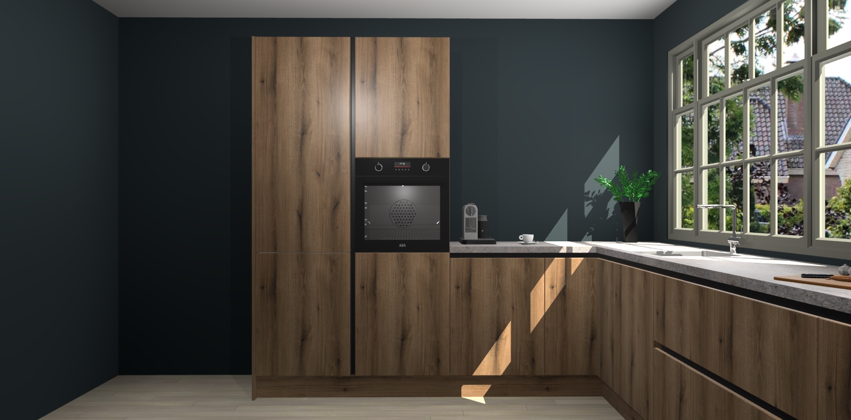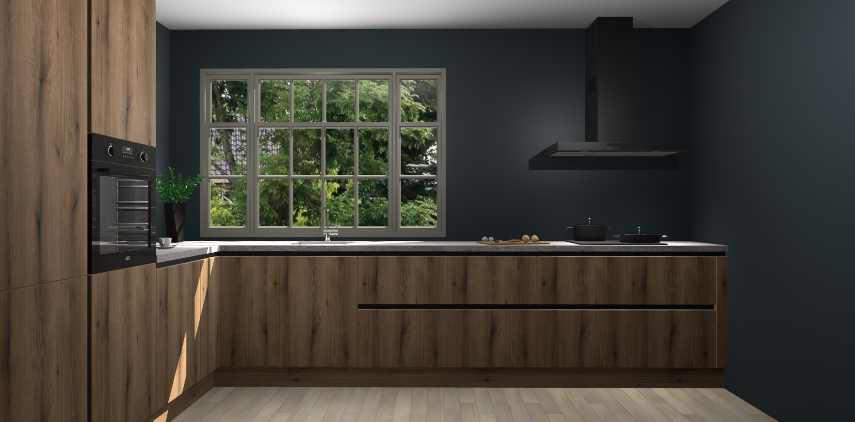 Kom dichtbij de perfecte keuken van uw dromen met de Goud Eiken greeploze keuken Malaga. Met een prachtige houtlook en eigentijds ontwerp, straalt deze keuken warmte en sfeer uit. Of u nu liefhebber bent van traditionele of moderne stijlen, er is genoeg ruimte om aan al uw behoeften te voldoen.