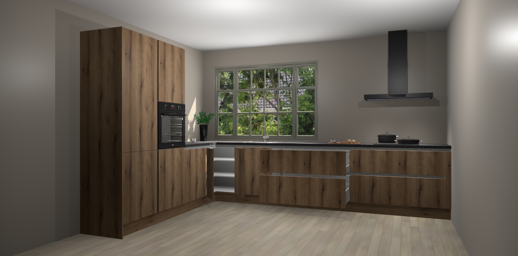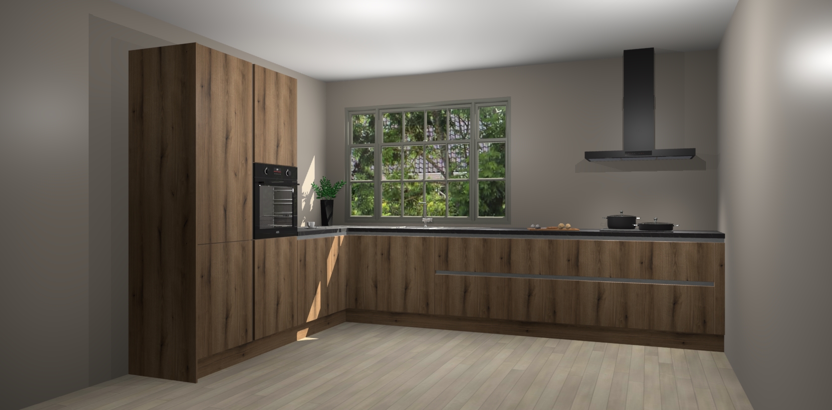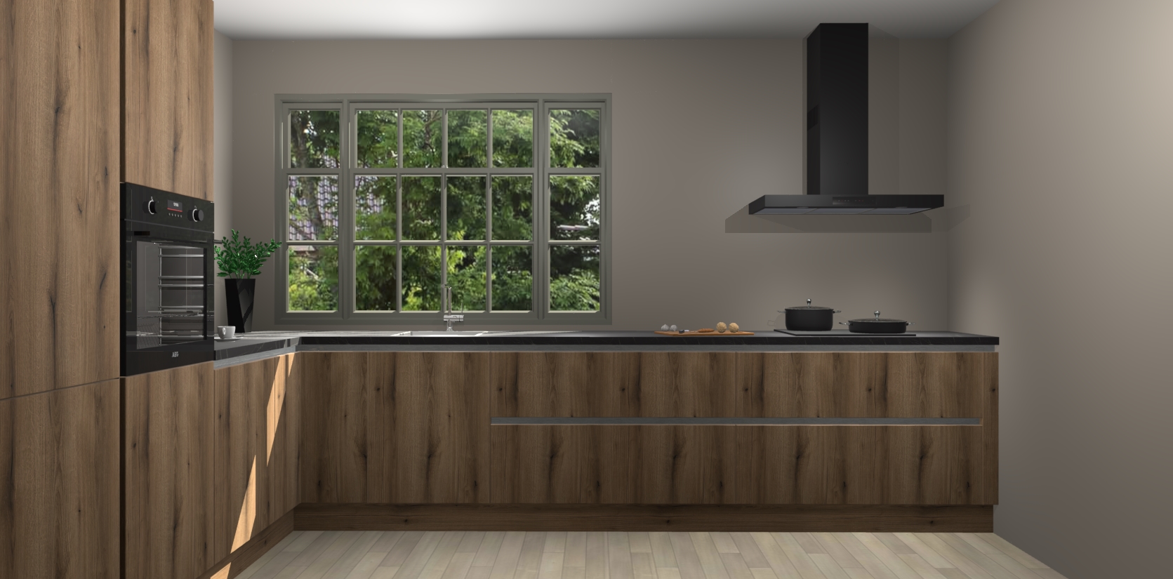 Kom dichtbij de perfecte keuken van uw dromen met de Goud Eiken greeploze keuken Malaga. Met een prachtige houtlook en eigentijds ontwerp, straalt deze keuken warmte en sfeer uit. Of u nu liefhebber bent van traditionele of moderne stijlen, er is genoeg ruimte om aan al uw behoeften te voldoen.