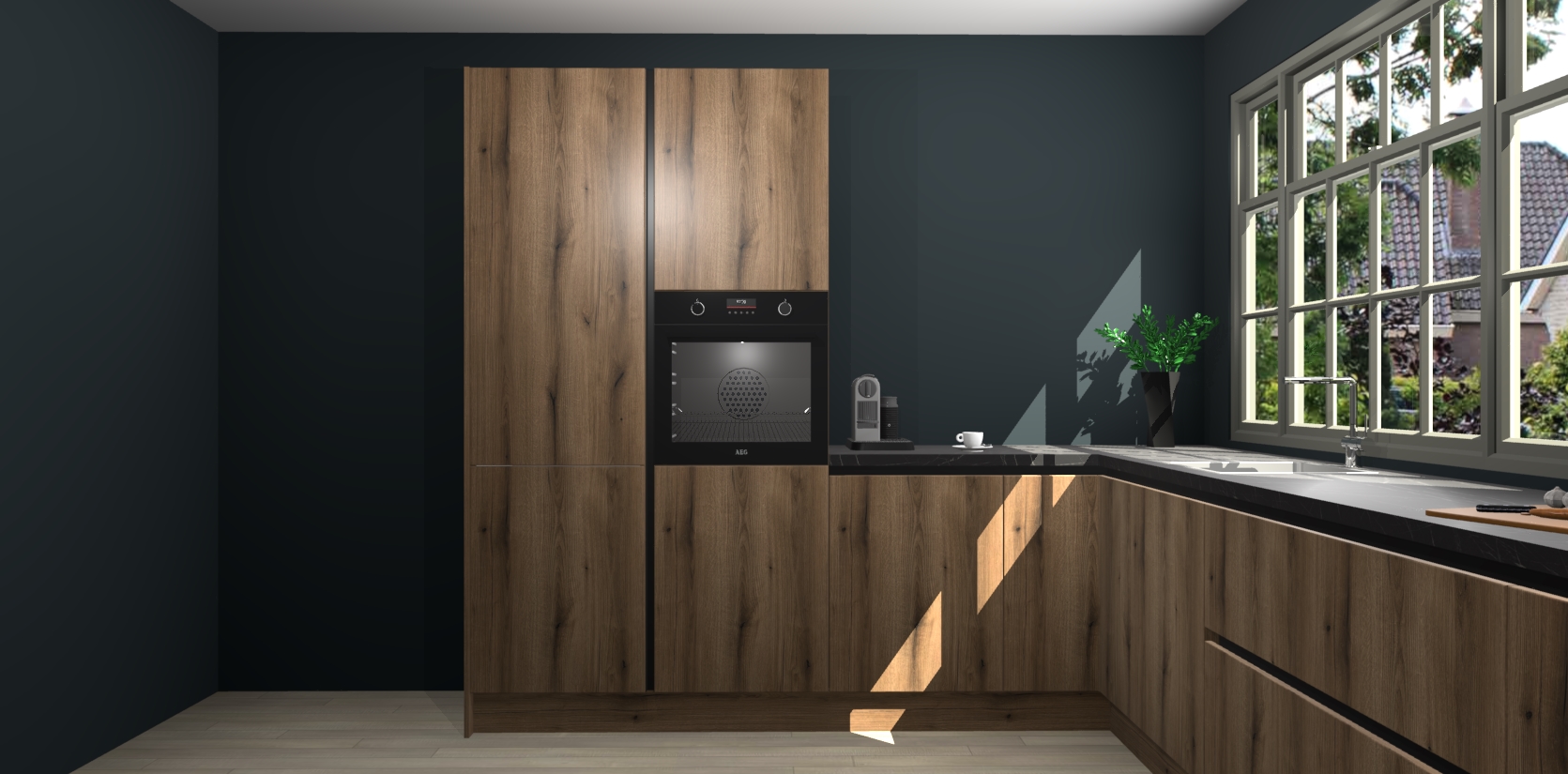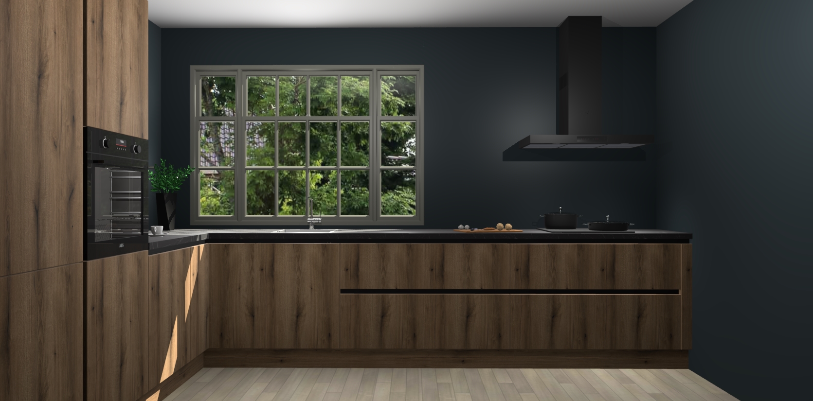 Kom dichtbij de perfecte keuken van uw dromen met de Goud Eiken greeploze keuken Malaga. Met een prachtige houtlook en eigentijds ontwerp, straalt deze keuken warmte en sfeer uit. Of u nu liefhebber bent van traditionele of moderne stijlen, er is genoeg ruimte om aan al uw behoeften te voldoen.