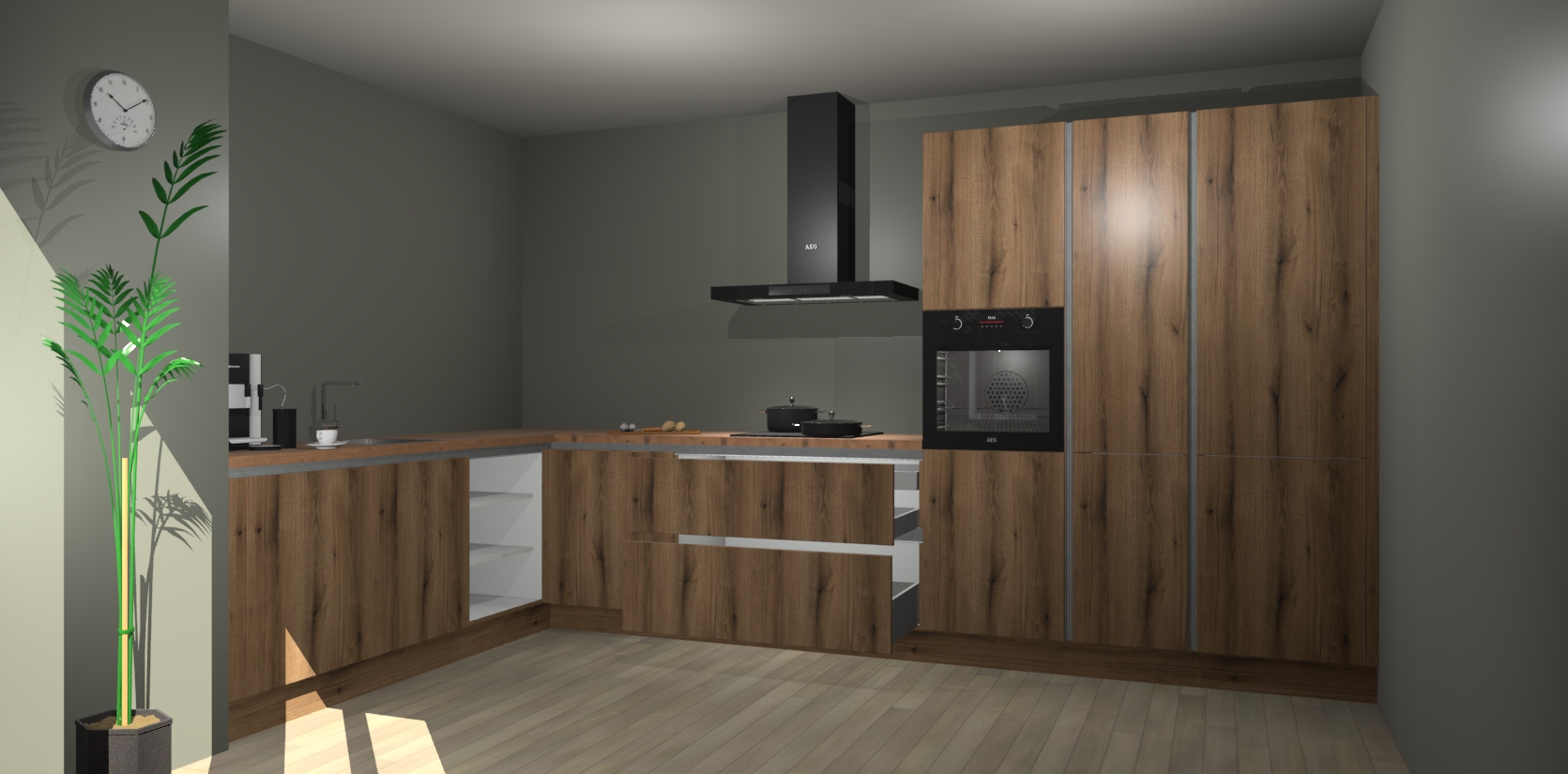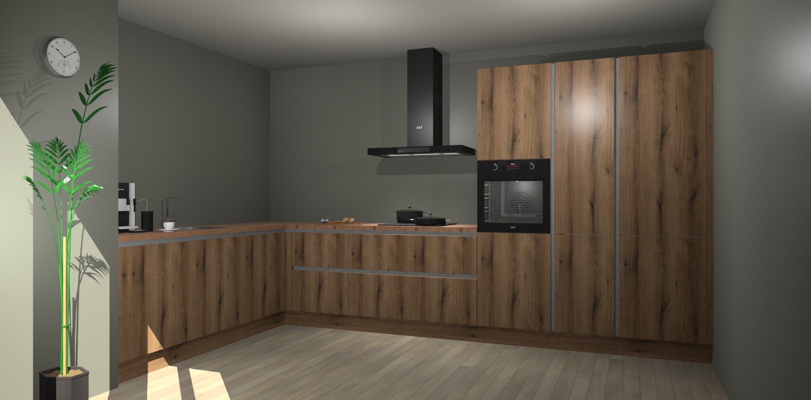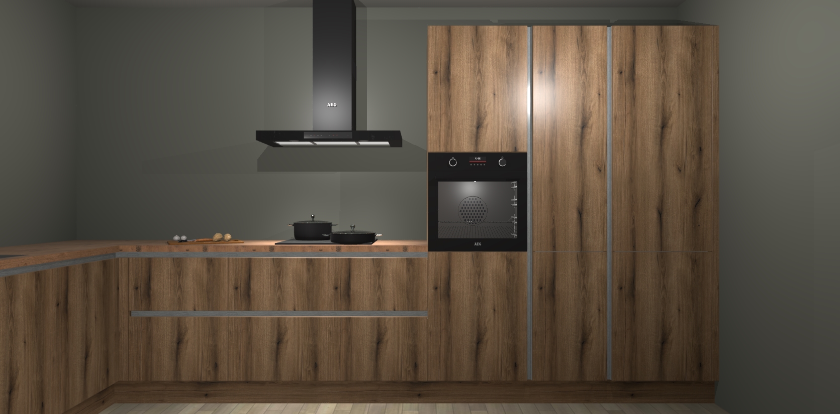 Welkom bij de goud eiken greeploze keuken Nuuk. Deze prachtige keuken zal de komende jaren het middelpunt van de belangstelling in uw huis zijn. Uitgerust met vijf inbouwapparaten komt u nooit kookgereedschap tekort.