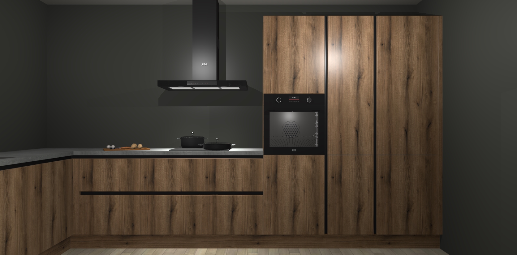 Welkom bij de goud eiken greeploze keuken Nuuk. Deze prachtige keuken zal de komende jaren het middelpunt van de belangstelling in uw huis zijn. Uitgerust met vijf inbouwapparaten komt u nooit kookgereedschap tekort.