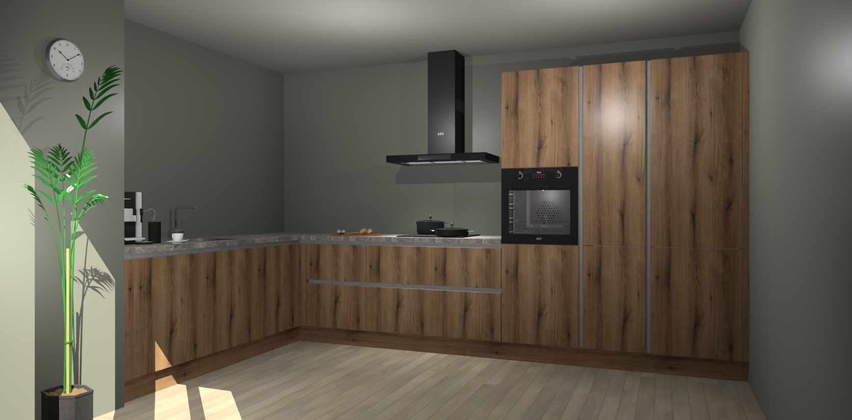 Welkom bij de goud eiken greeploze keuken Nuuk. Deze prachtige keuken zal de komende jaren het middelpunt van de belangstelling in uw huis zijn. Uitgerust met vijf inbouwapparaten komt u nooit kookgereedschap tekort.