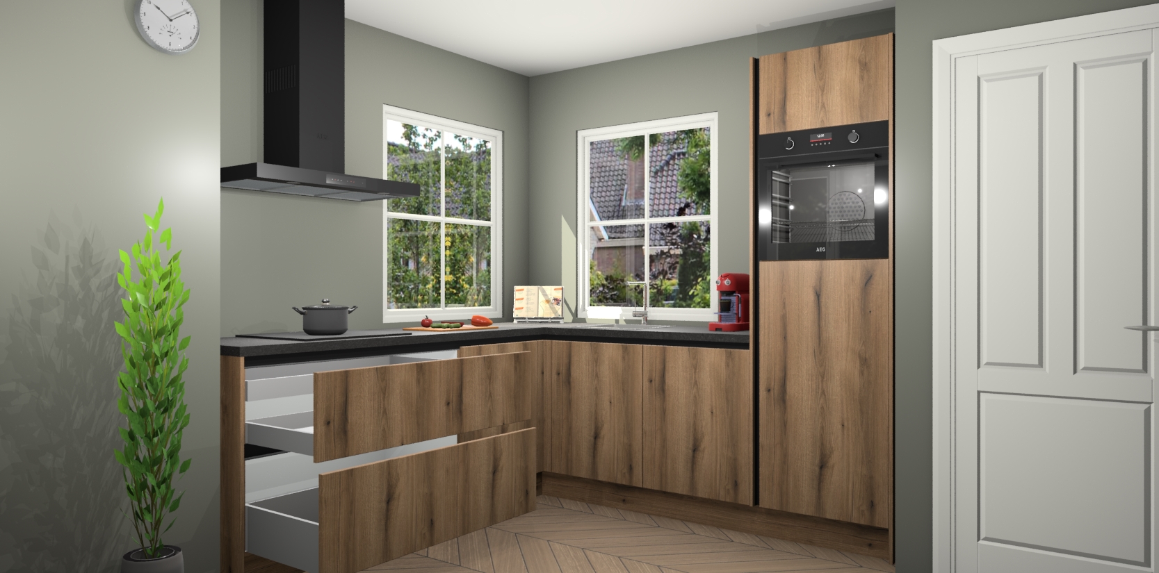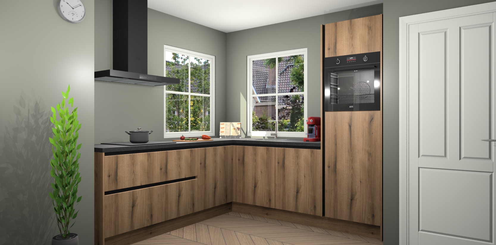 De Goud Eiken greeploze keuken Pai bevat vijf essentiële inbouwapparaten - een oven, inductiekookplaat, afzuigkap, vaatwasser en koelkast - zodat u er na levering meteen in kunt. Voor de slimme kopers die weten dat apparaten vaak het verschil kunnen maken tussen functioneel en luxueus, bieden we eenvoudige upgradeopties naar AEG, van oven naar combimagnetron na bestelling of naar een kookplaat met geïntrigeerde afzuiging. En met onze vaste lage prijs en snelle levering binnen zeven weken vanaf de orderbevestiging hoeft u zich geen zorgen te maken over verborgen kosten of lange levertijden die uw droomkeuken kunnen vertragen.