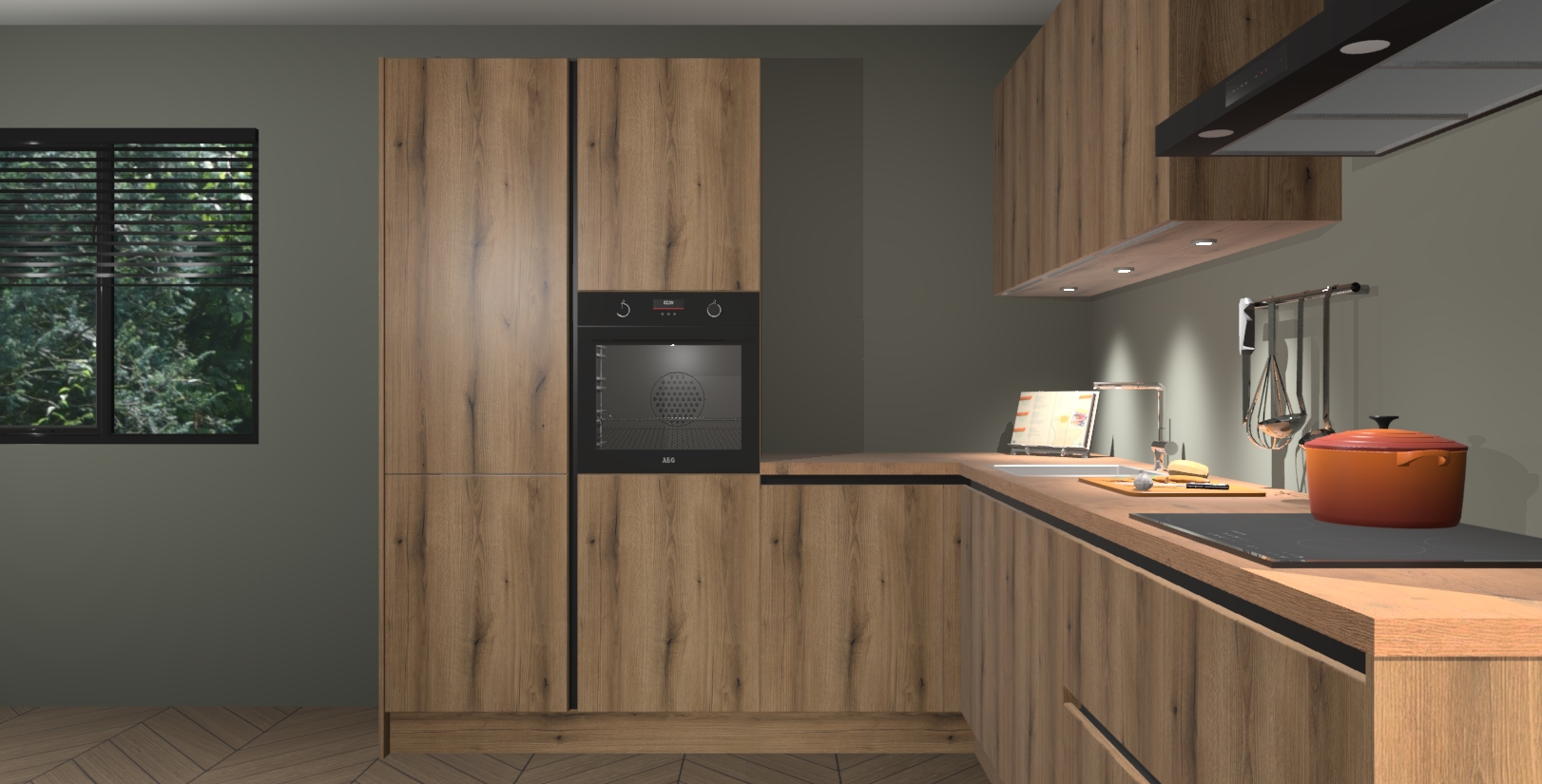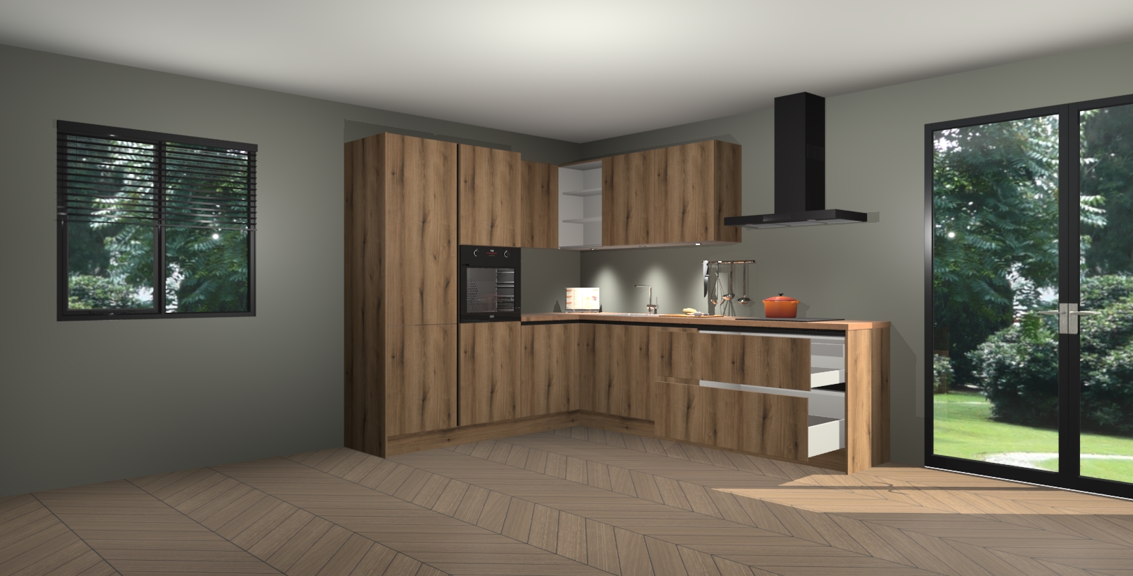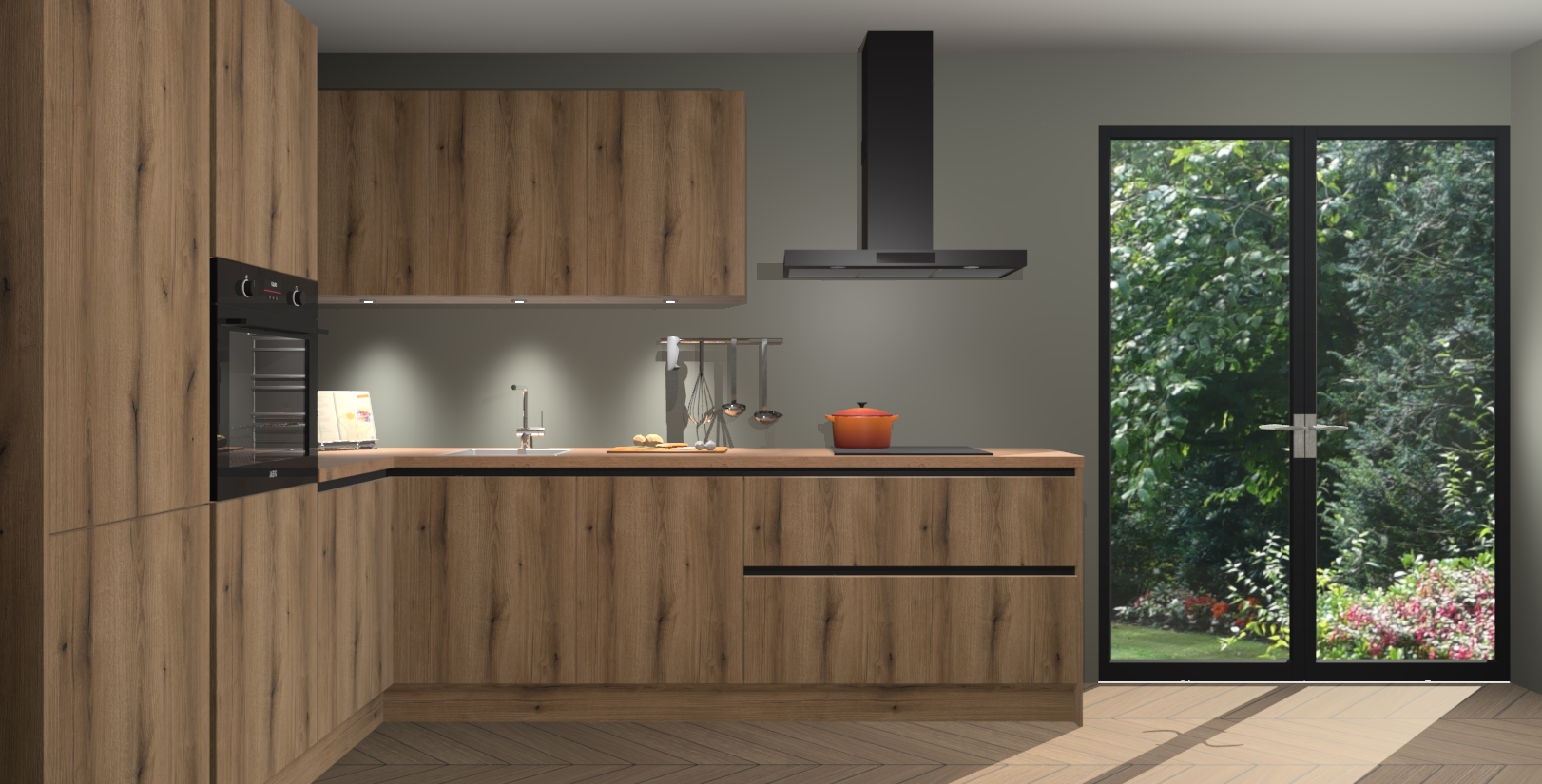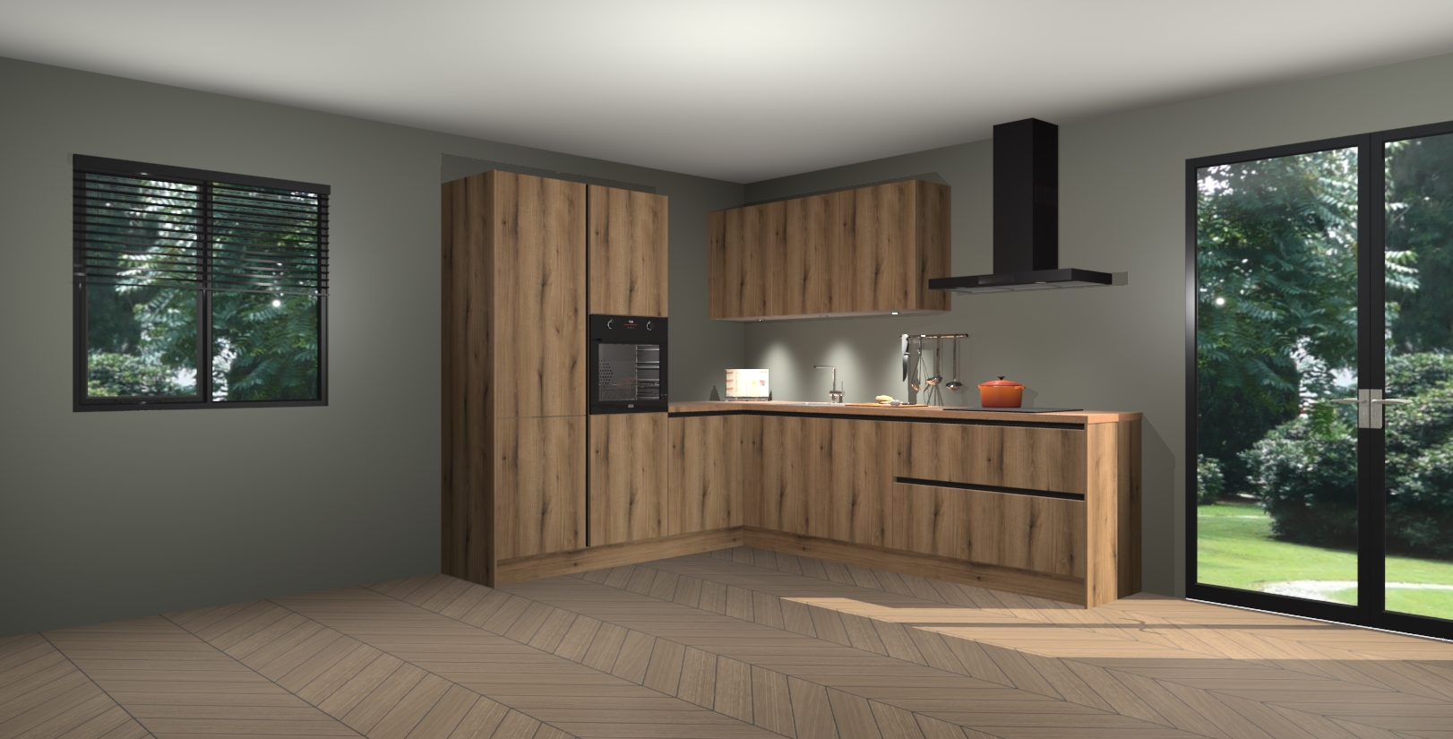 Maak kennis met de goud eiken greeploze keuken Parla - de perfecte aanvulling voor uw moderne keuken! Ervaar tijdloos design, elegantie en een chique uitstraling met onze zwarte handgrepen, soft-close deuren en veel opbergruimte. Dit alles wordt aangeboden tegen een vaste lage prijs voor ongeëvenaarde Duitse keukenkwaliteit!