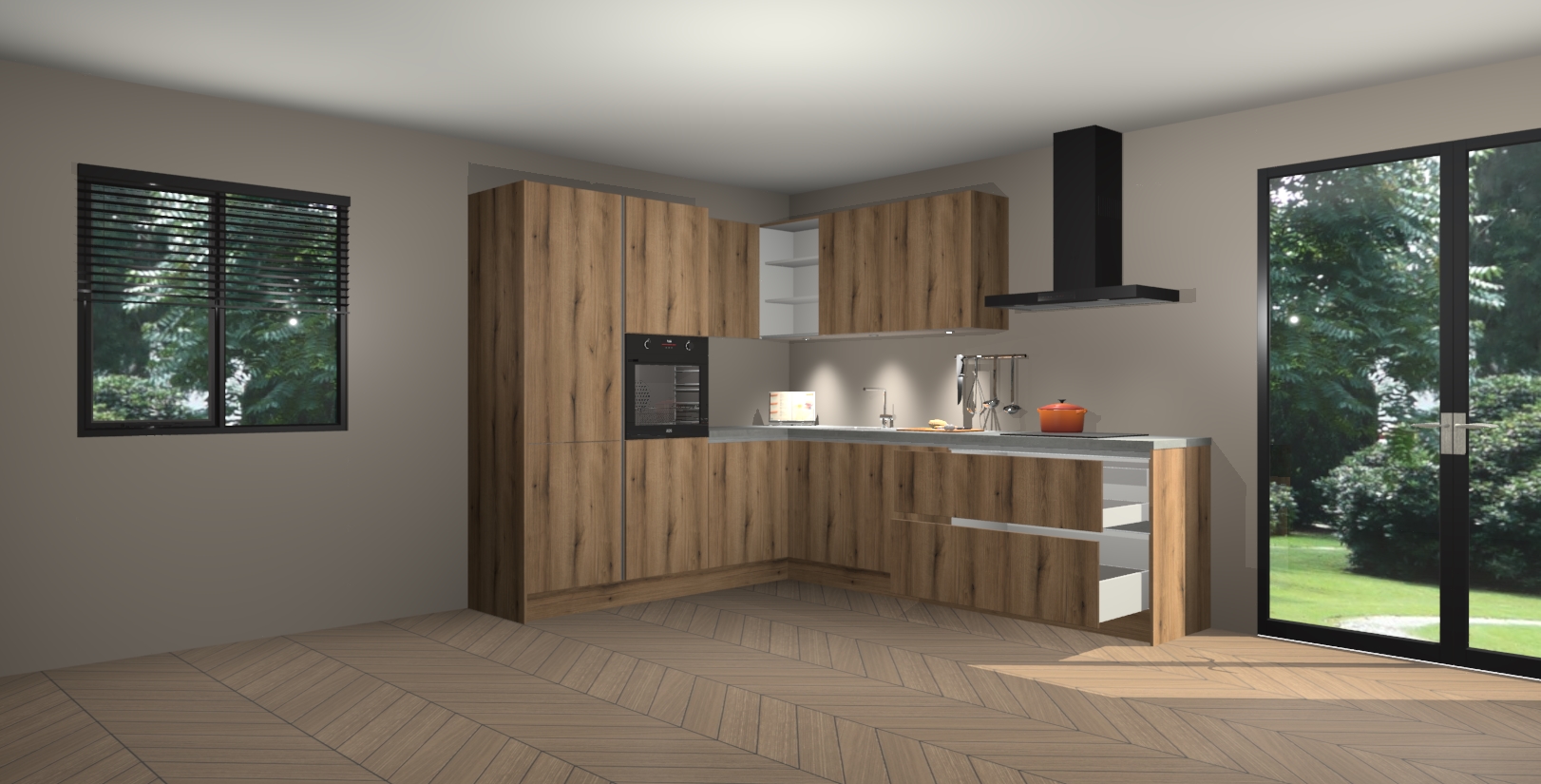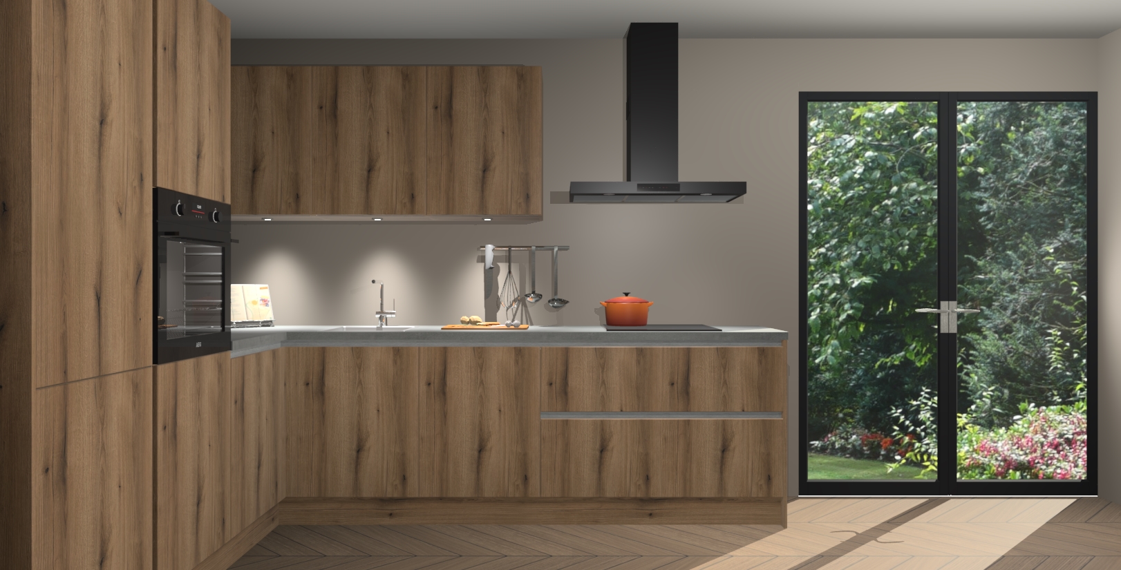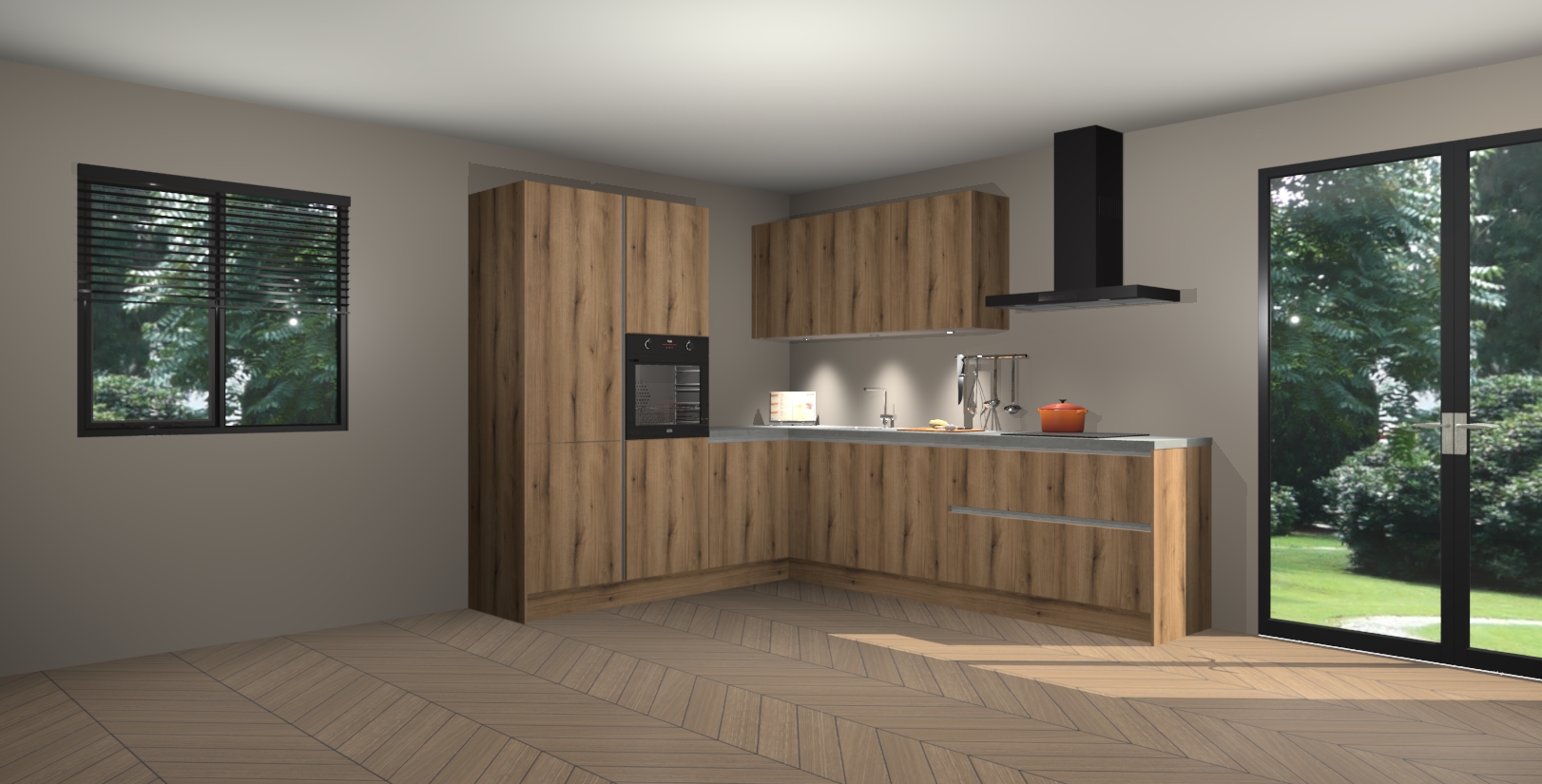 Maak kennis met de goud eiken greeploze keuken Parla - de perfecte aanvulling voor uw moderne keuken! Ervaar tijdloos design, elegantie en een chique uitstraling met onze zwarte handgrepen, soft-close deuren en veel opbergruimte. Dit alles wordt aangeboden tegen een vaste lage prijs voor ongeëvenaarde Duitse keukenkwaliteit!