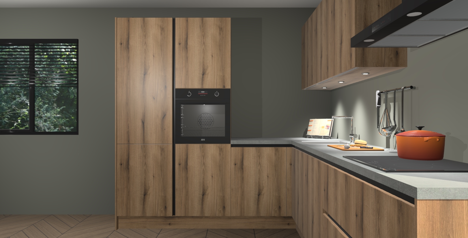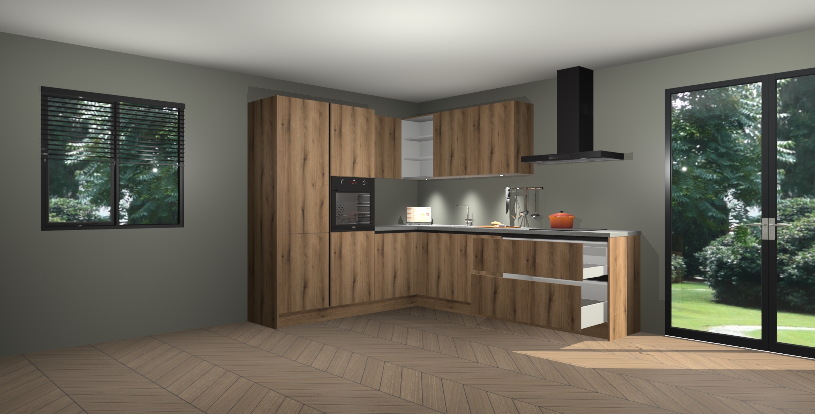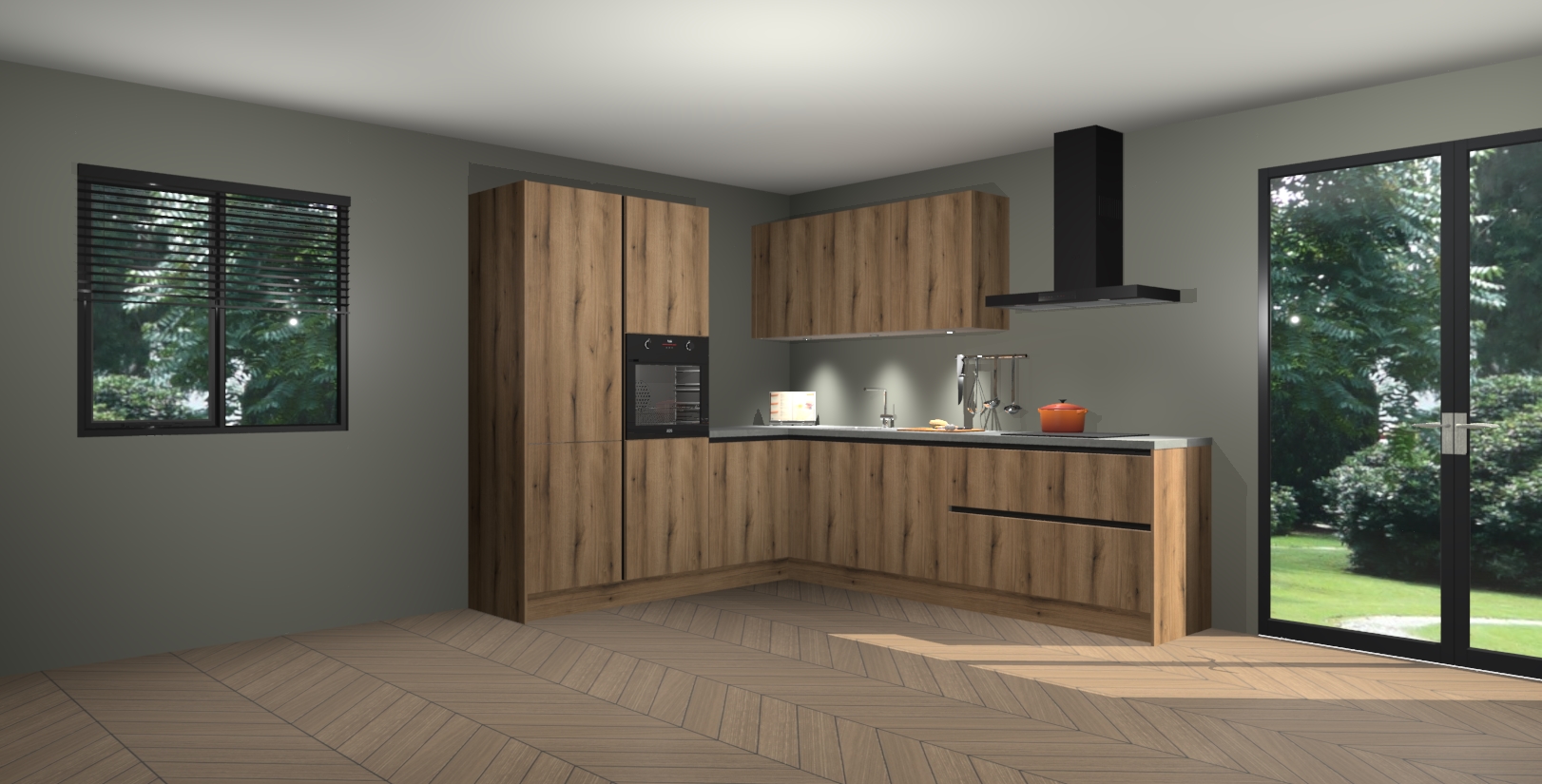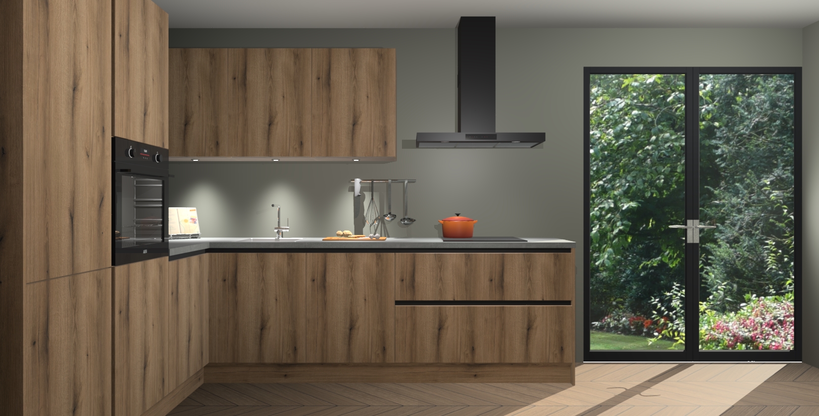 Maak kennis met de goud eiken greeploze keuken Parla - de perfecte aanvulling voor uw moderne keuken! Ervaar tijdloos design, elegantie en een chique uitstraling met onze zwarte handgrepen, soft-close deuren en veel opbergruimte. Dit alles wordt aangeboden tegen een vaste lage prijs voor ongeëvenaarde Duitse keukenkwaliteit!