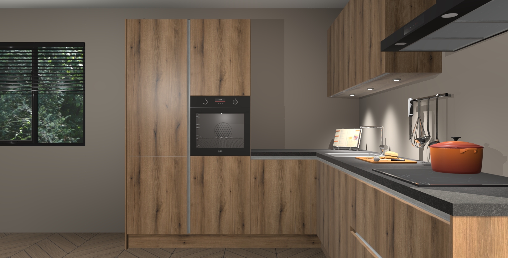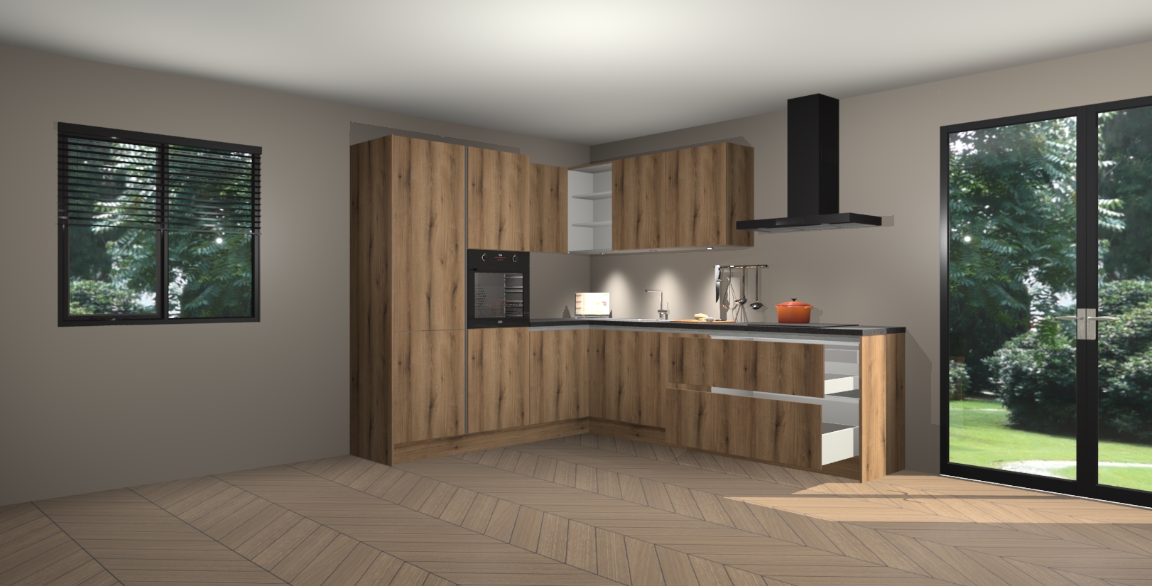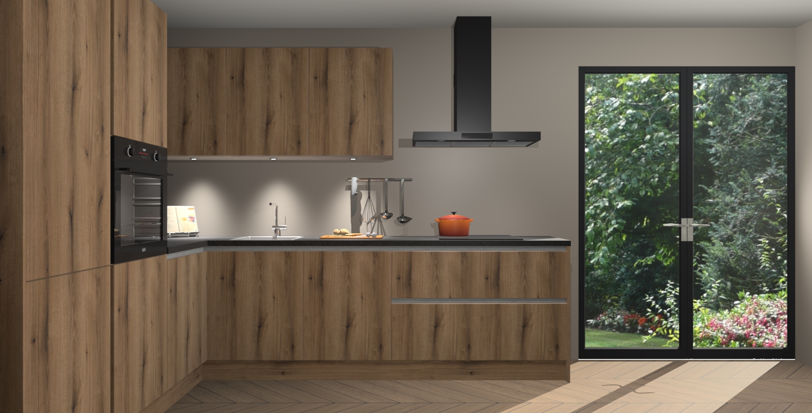 Maak kennis met de goud eiken greeploze keuken Parla - de perfecte aanvulling voor uw moderne keuken! Ervaar tijdloos design, elegantie en een chique uitstraling met onze zwarte handgrepen, soft-close deuren en veel opbergruimte. Dit alles wordt aangeboden tegen een vaste lage prijs voor ongeëvenaarde Duitse keukenkwaliteit!