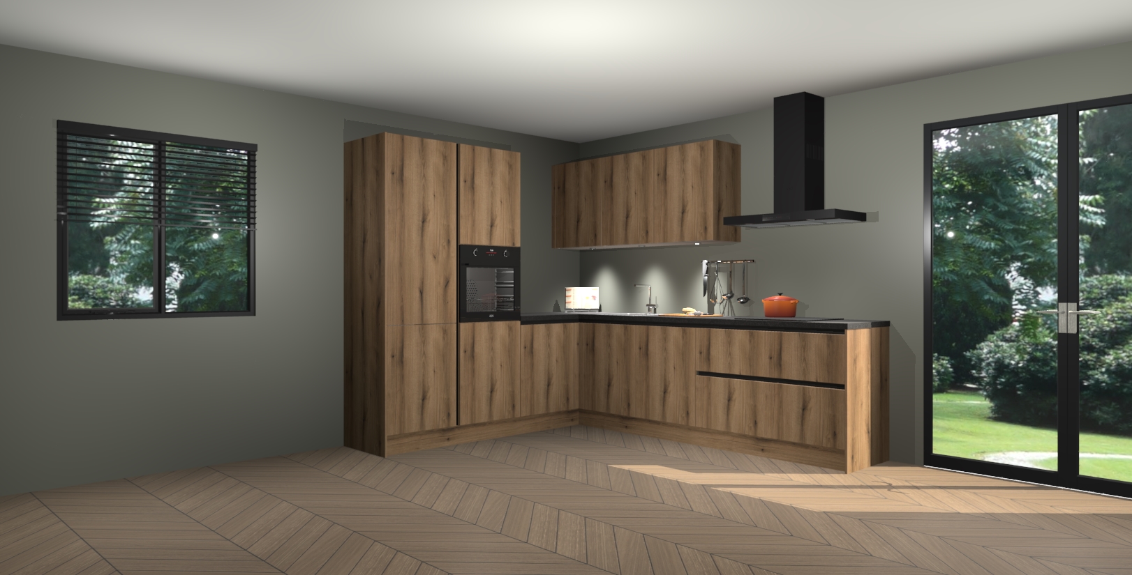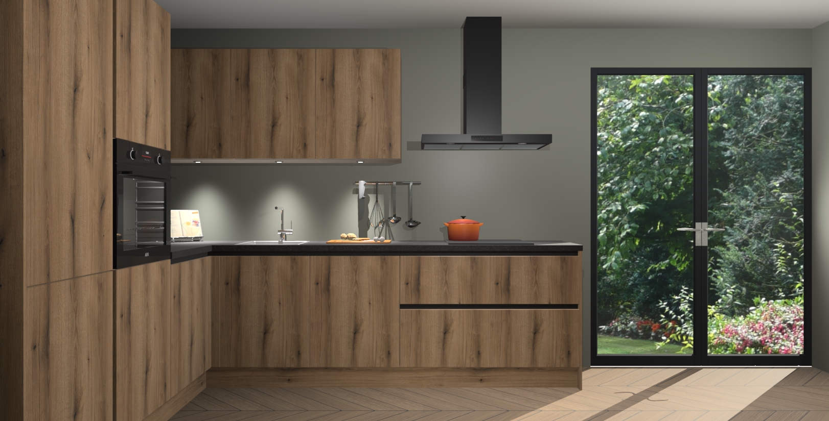 Maak kennis met de goud eiken greeploze keuken Parla - de perfecte aanvulling voor uw moderne keuken! Ervaar tijdloos design, elegantie en een chique uitstraling met onze zwarte handgrepen, soft-close deuren en veel opbergruimte. Dit alles wordt aangeboden tegen een vaste lage prijs voor ongeëvenaarde Duitse keukenkwaliteit!