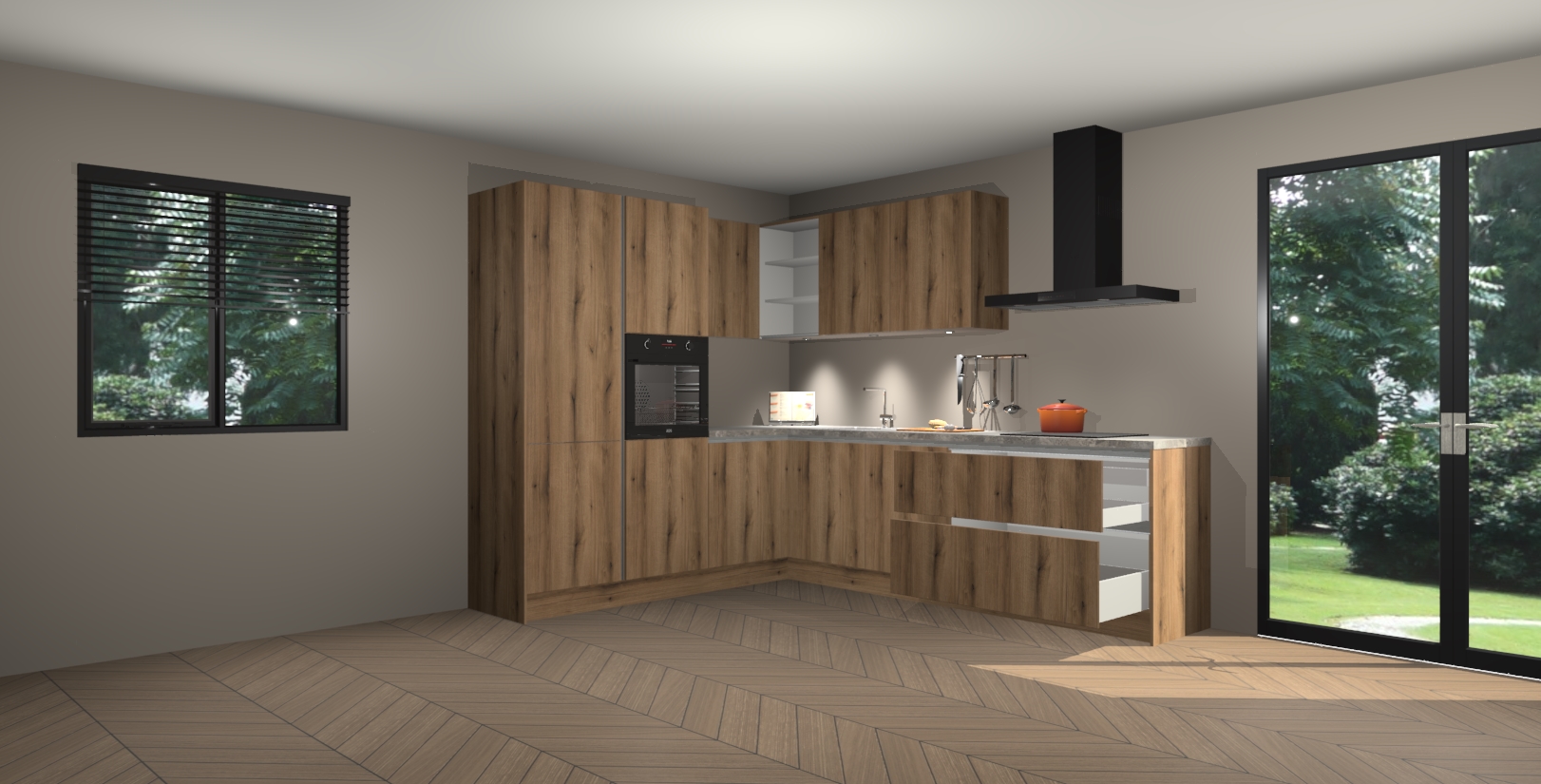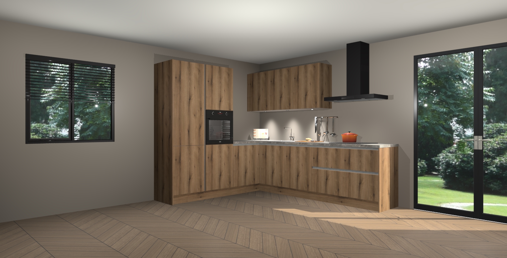 Maak kennis met de goud eiken greeploze keuken Parla - de perfecte aanvulling voor uw moderne keuken! Ervaar tijdloos design, elegantie en een chique uitstraling met onze zwarte handgrepen, soft-close deuren en veel opbergruimte. Dit alles wordt aangeboden tegen een vaste lage prijs voor ongeëvenaarde Duitse keukenkwaliteit!