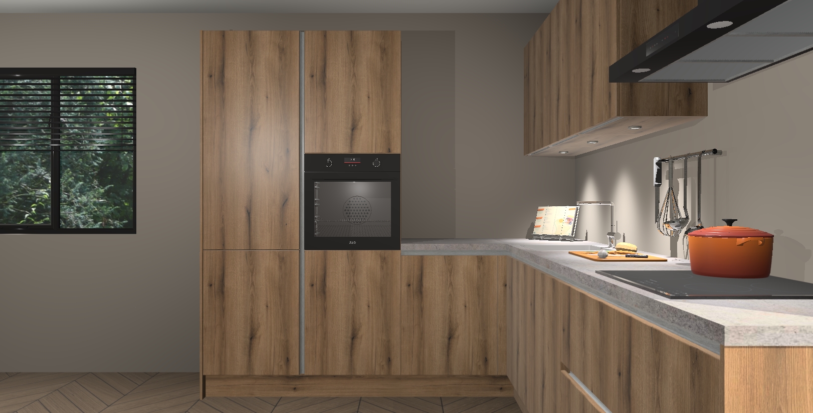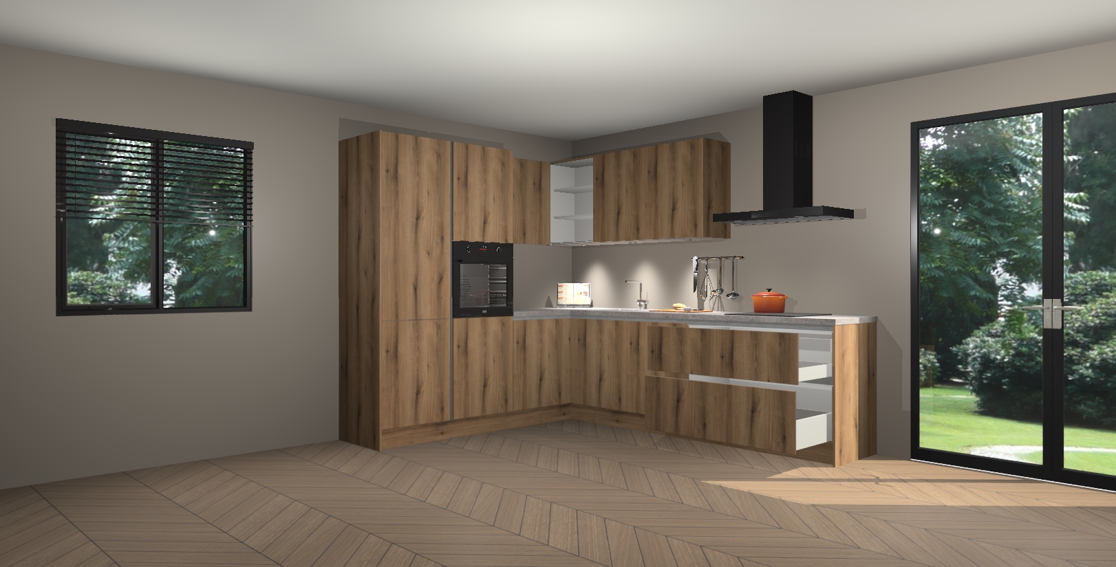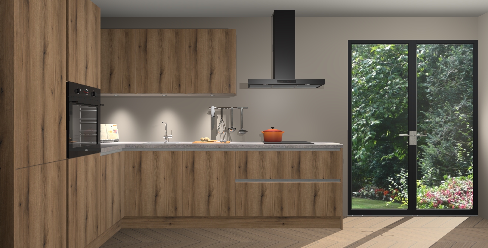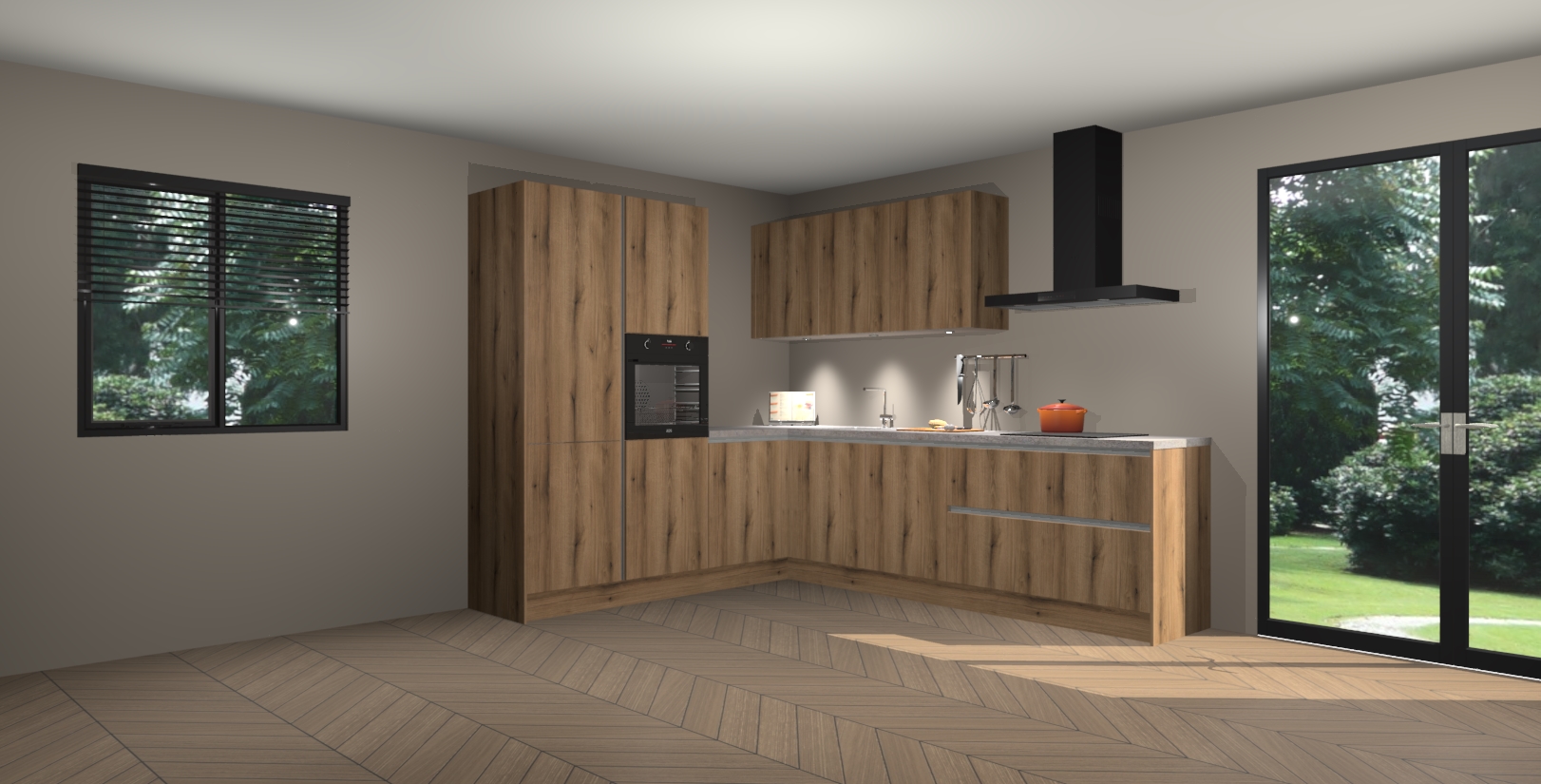 Maak kennis met de goud eiken greeploze keuken Parla - de perfecte aanvulling voor uw moderne keuken! Ervaar tijdloos design, elegantie en een chique uitstraling met onze zwarte handgrepen, soft-close deuren en veel opbergruimte. Dit alles wordt aangeboden tegen een vaste lage prijs voor ongeëvenaarde Duitse keukenkwaliteit!