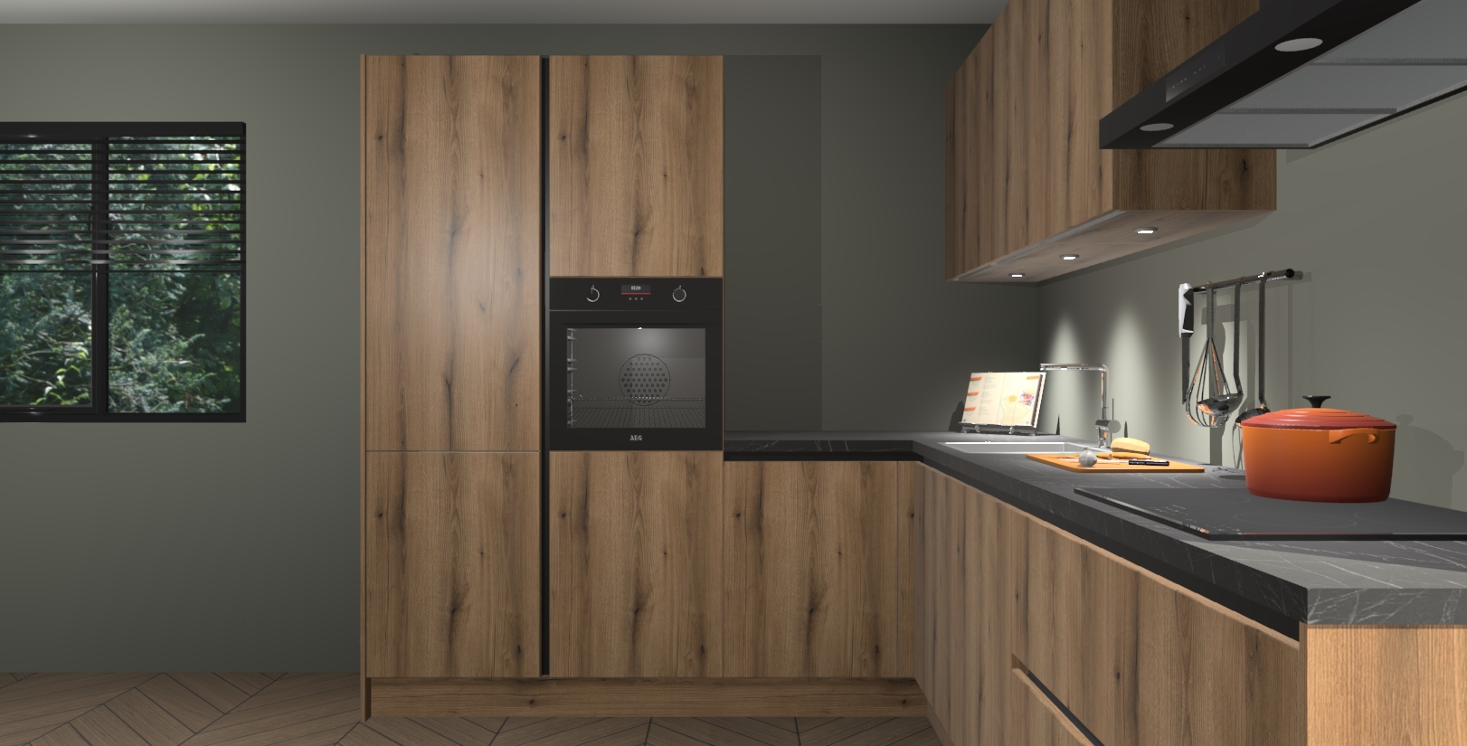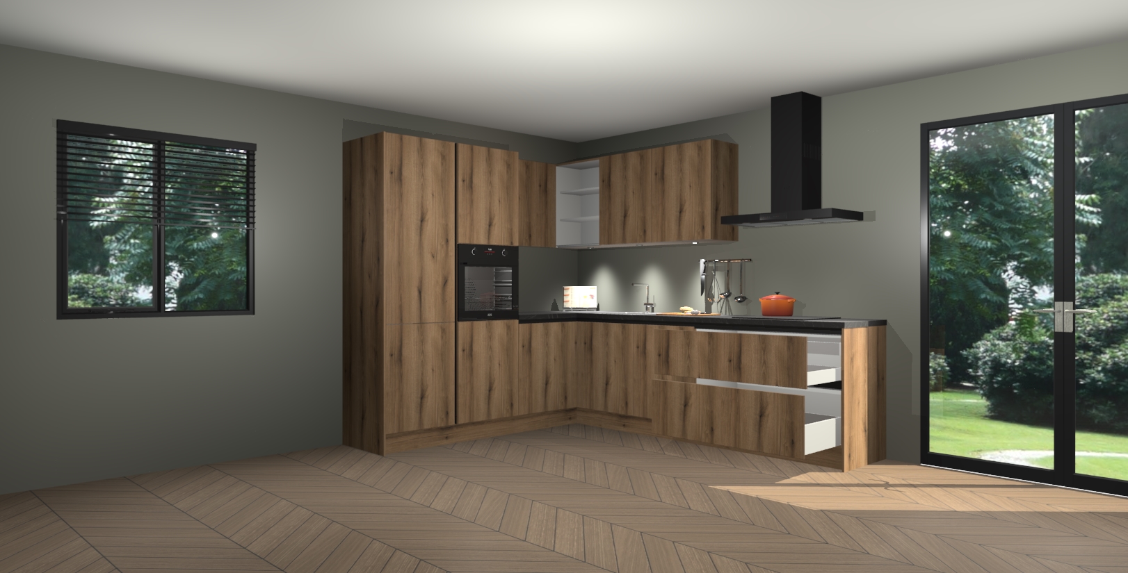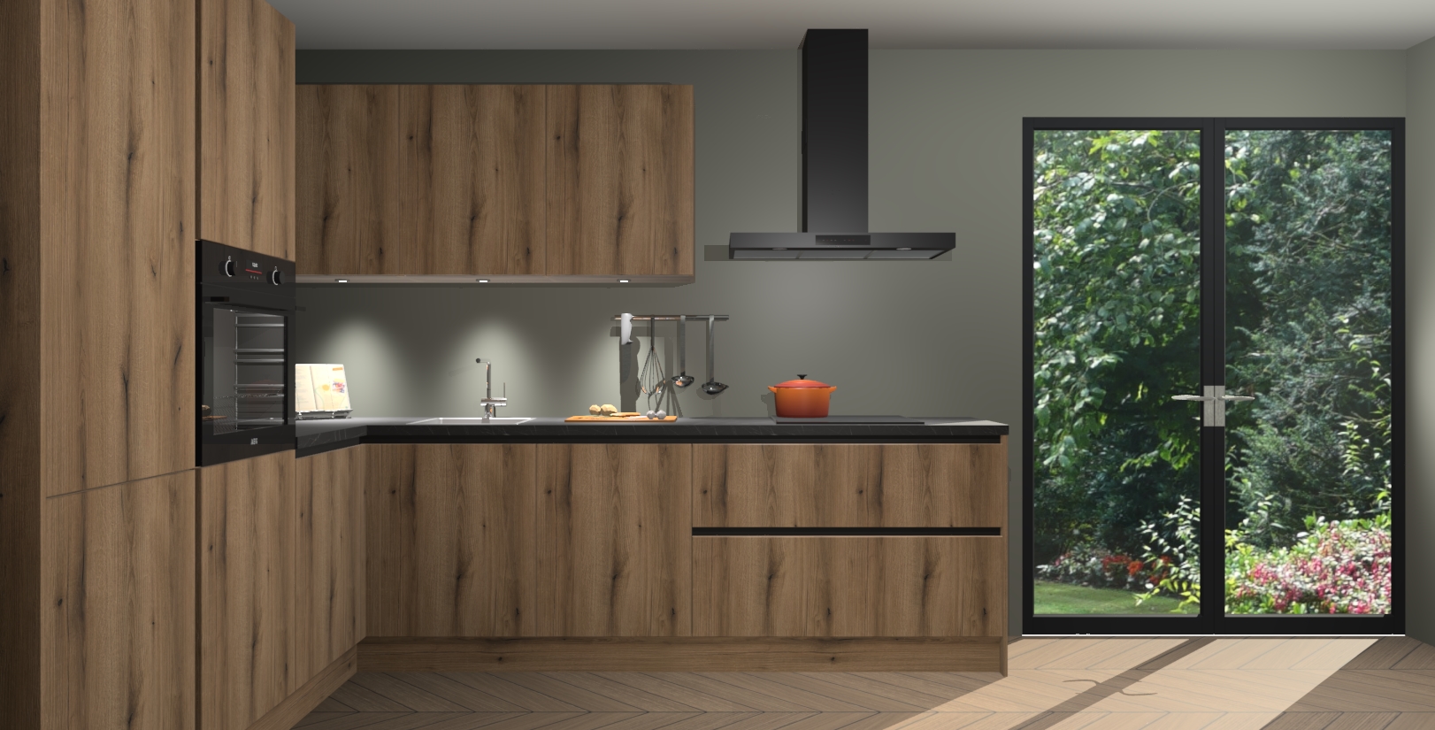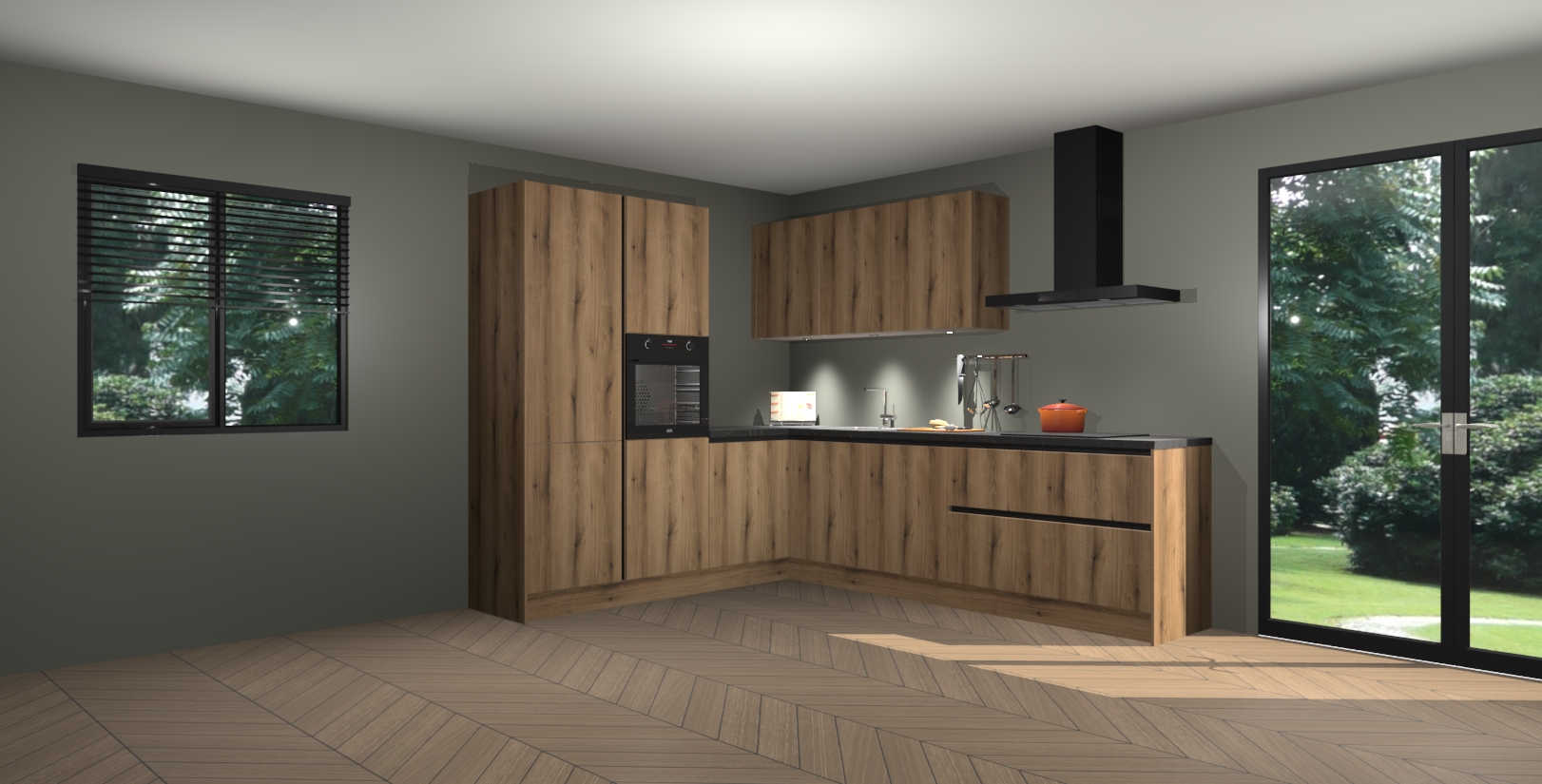 Maak kennis met de goud eiken greeploze keuken Parla - de perfecte aanvulling voor uw moderne keuken! Ervaar tijdloos design, elegantie en een chique uitstraling met onze zwarte handgrepen, soft-close deuren en veel opbergruimte. Dit alles wordt aangeboden tegen een vaste lage prijs voor ongeëvenaarde Duitse keukenkwaliteit!