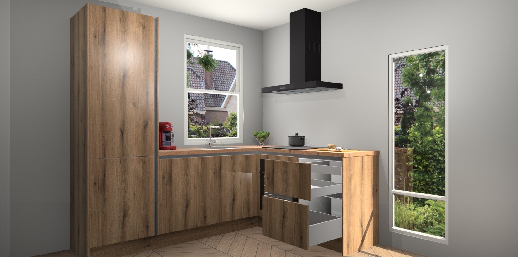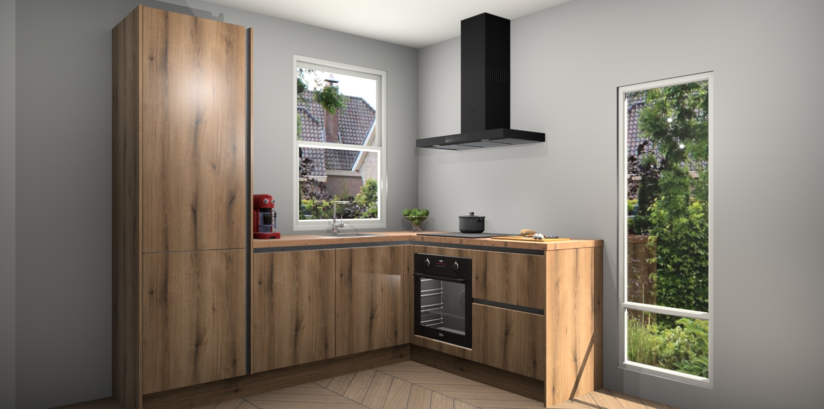 De prachtige Goud Eiken greeploze keuken Phuket is de perfecte keuze als u op zoek bent naar een moderne hoekkeuken met alle luxe en comfort die u kunt verwachten! De uitstraling in het houtlook-design draagt bij aan de warme sfeer die u nu al voelt wanneer u er naar kijkt. Heeft u genoeg van ouderwetse keukens? Probeer dan direct deze moderne, mooie hoekkeukens en laat iedereen verbluft achter!