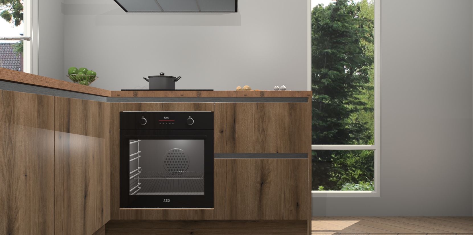 De Goud Eiken greeploze keuken Phuket heeft alles wat u maar kunt wensen. Niet alleen zijn er softclose deuren, maar ook 5 ingebouwde apparaten: een oven, inductiekookplaat, afzuigkap, vaatwasser en koelkast - waarbij u later gemakkelijk naar het AEG merk, van inductiekookplaat naar kookplaat met geïntegreerde afzuiging of van oven naar combimagnetron kunt upgraden. Dat alles tegen een vast laag tarief! Bovendien geeft de Goud Eiken greeploze keuken Phuket supersnelle levering van 7 weken. Echt iets voor u als u er niet op wilt wachten om het resultaat te zien in eigen keuken!