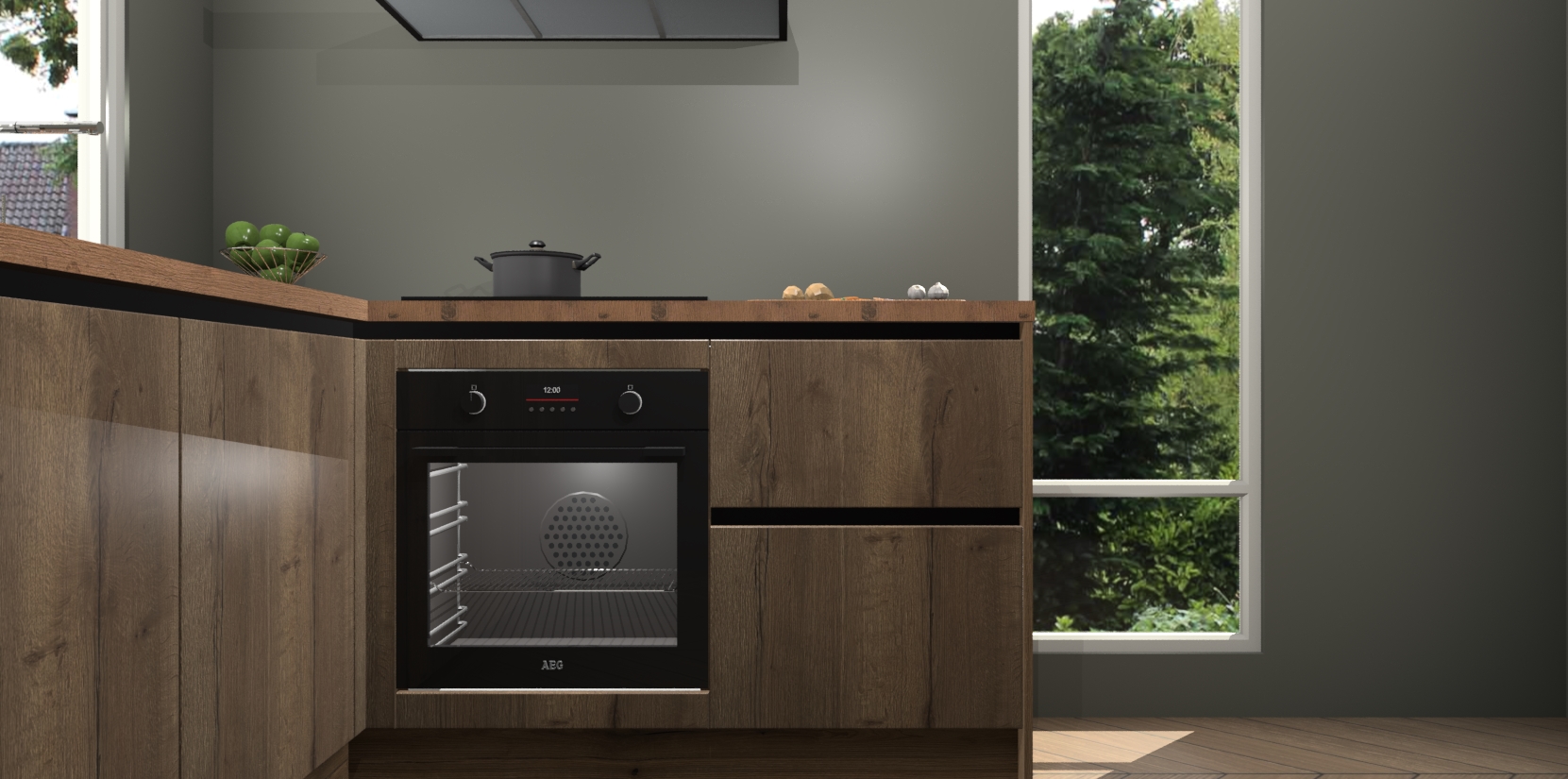 De Goud Eiken greeploze keuken Phuket heeft alles wat u maar kunt wensen. Niet alleen zijn er softclose deuren, maar ook 5 ingebouwde apparaten: een oven, inductiekookplaat, afzuigkap, vaatwasser en koelkast - waarbij u later gemakkelijk naar het AEG merk, van inductiekookplaat naar kookplaat met geïntegreerde afzuiging of van oven naar combimagnetron kunt upgraden. Dat alles tegen een vast laag tarief! Bovendien geeft de Goud Eiken greeploze keuken Phuket supersnelle levering van 7 weken. Echt iets voor u als u er niet op wilt wachten om het resultaat te zien in eigen keuken!