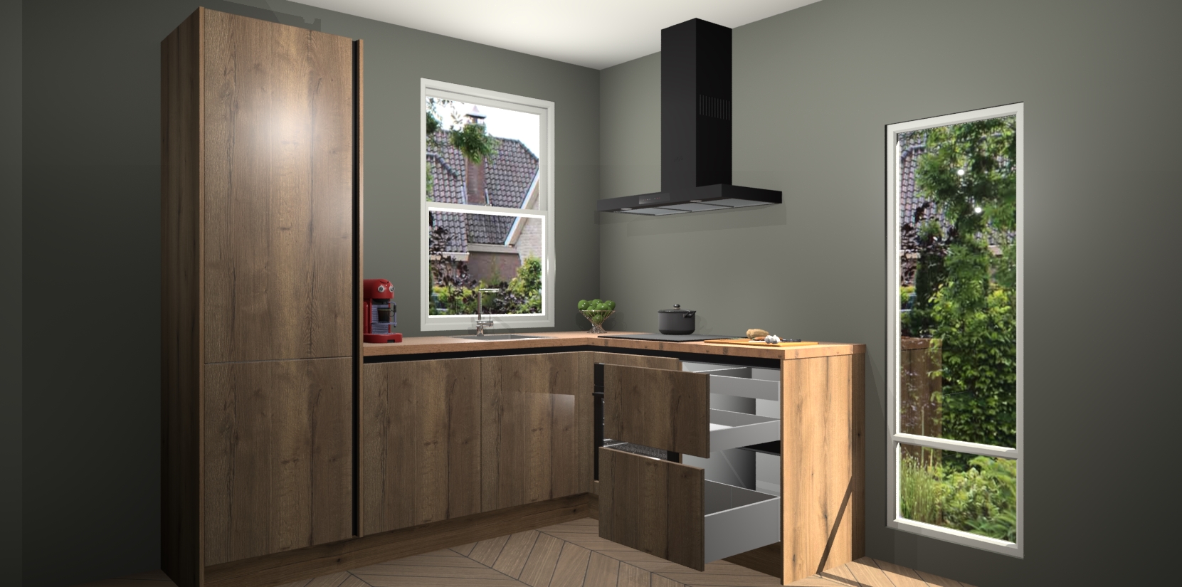 De prachtige Goud Eiken greeploze keuken Phuket is de perfecte keuze als u op zoek bent naar een moderne hoekkeuken met alle luxe en comfort die u kunt verwachten! De uitstraling in het houtlook-design draagt bij aan de warme sfeer die u nu al voelt wanneer u er naar kijkt. Heeft u genoeg van ouderwetse keukens? Probeer dan direct deze moderne, mooie hoekkeukens en laat iedereen verbluft achter!
