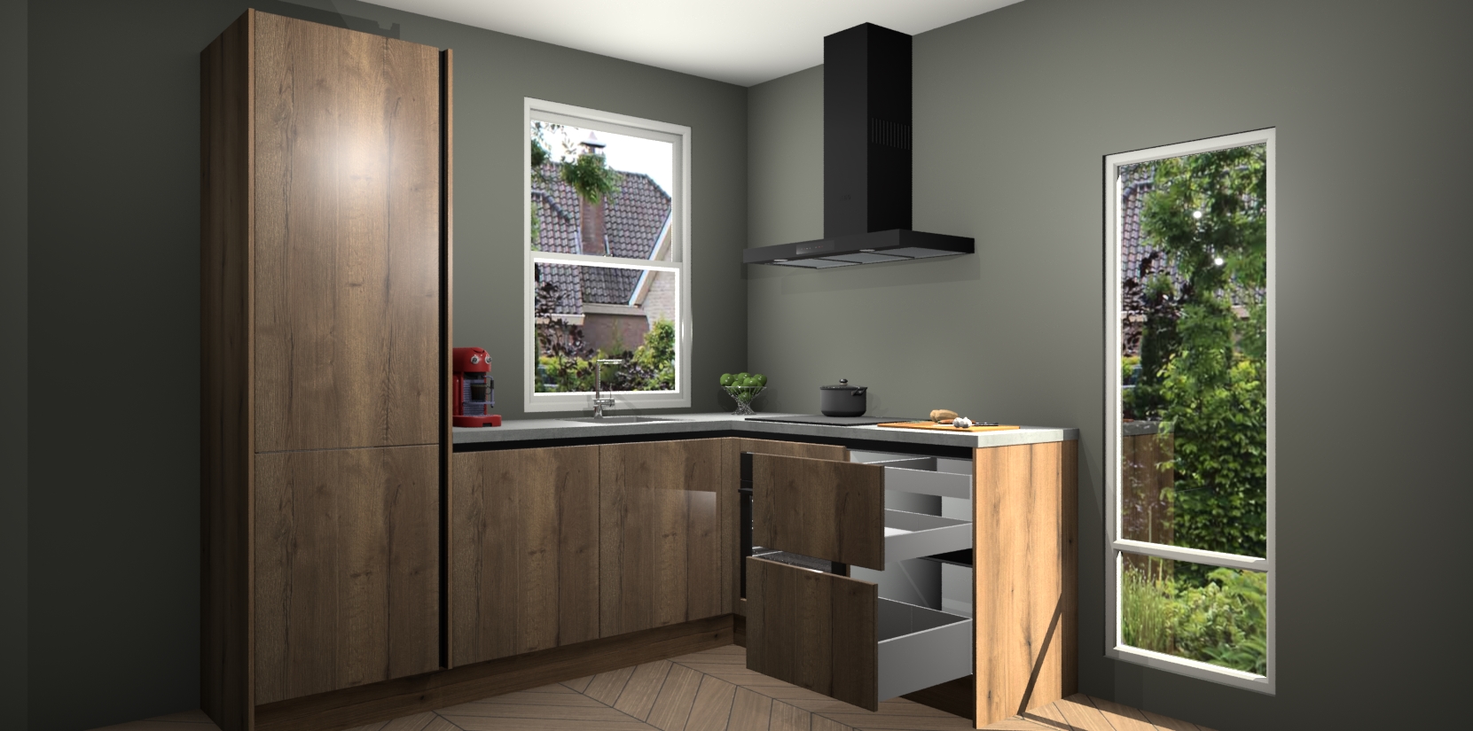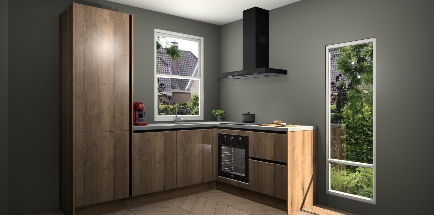 De prachtige Goud Eiken greeploze keuken Phuket is de perfecte keuze als u op zoek bent naar een moderne hoekkeuken met alle luxe en comfort die u kunt verwachten! De uitstraling in het houtlook-design draagt bij aan de warme sfeer die u nu al voelt wanneer u er naar kijkt. Heeft u genoeg van ouderwetse keukens? Probeer dan direct deze moderne, mooie hoekkeukens en laat iedereen verbluft achter!