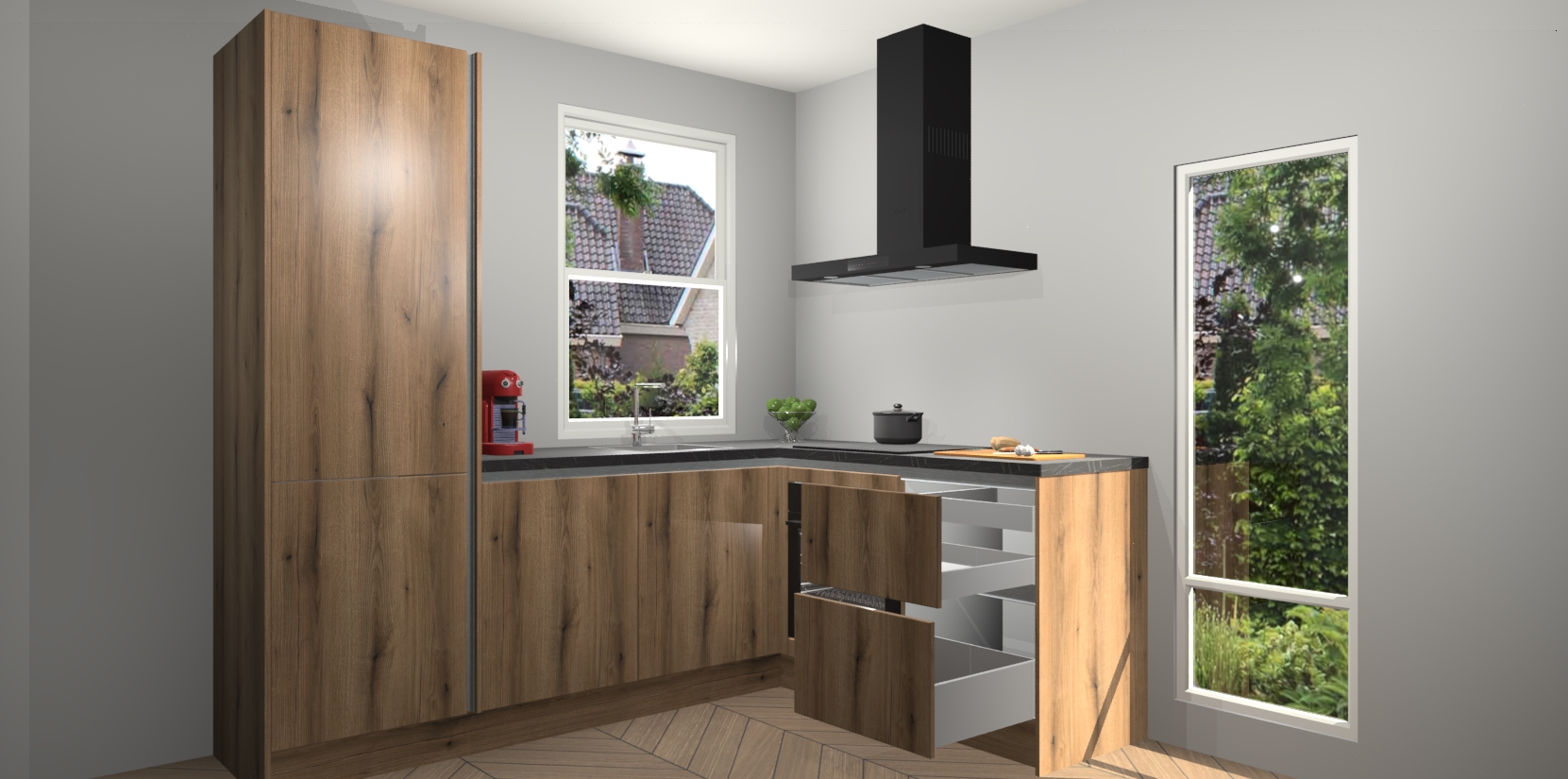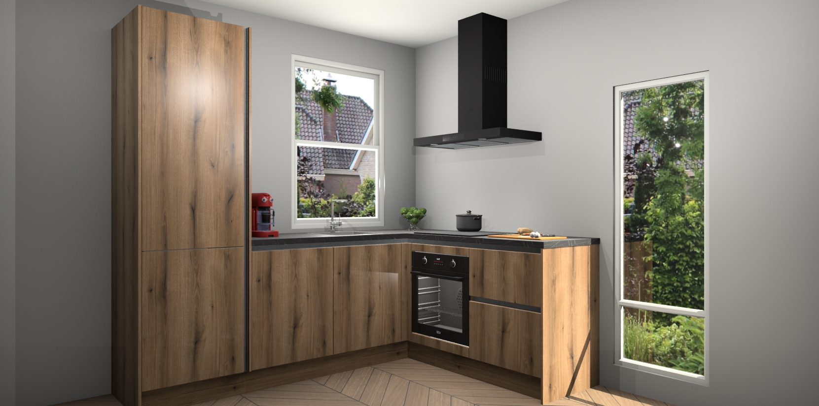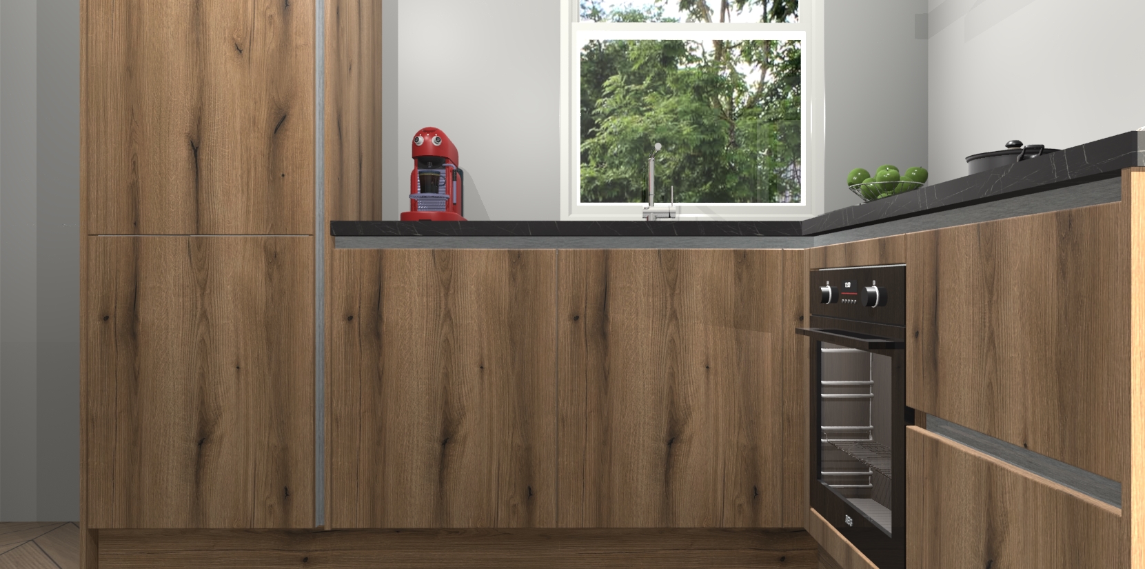De prachtige Goud Eiken greeploze keuken Phuket is de perfecte keuze als u op zoek bent naar een moderne hoekkeuken met alle luxe en comfort die u kunt verwachten! De uitstraling in het houtlook-design draagt bij aan de warme sfeer die u nu al voelt wanneer u er naar kijkt. Heeft u genoeg van ouderwetse keukens? Probeer dan direct deze moderne, mooie hoekkeukens en laat iedereen verbluft achter!