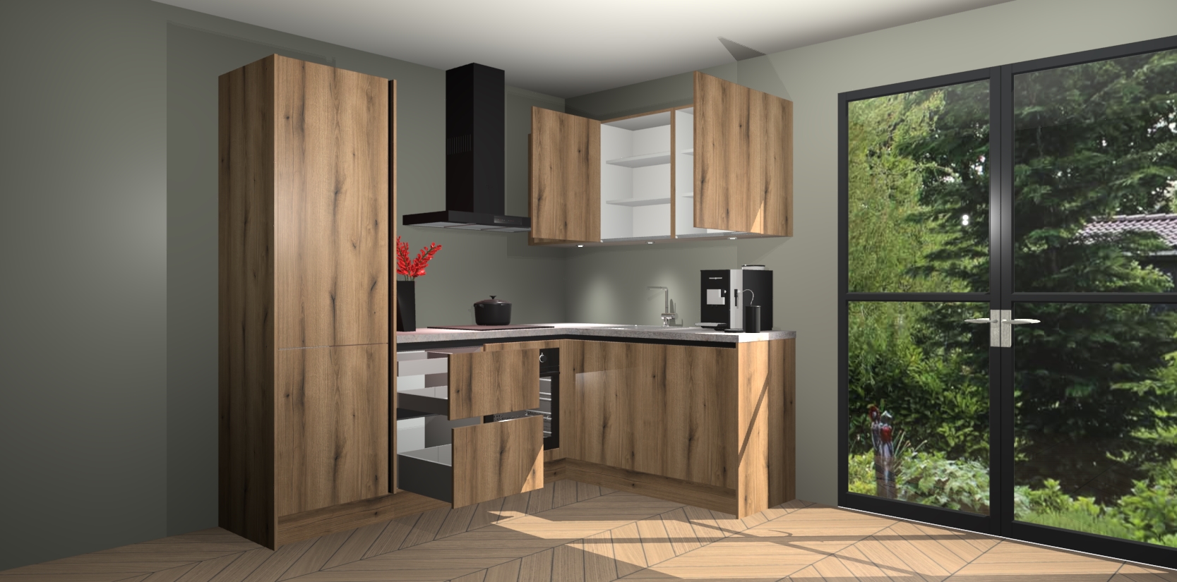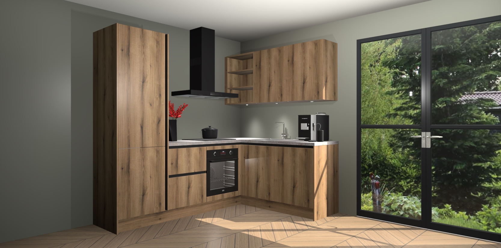 Wauw, dit is de Goud Eiken greeploze keuken Pilsen! U kunt gerust zeggen dat u elegantie combineert met functionaliteit met deze keuken. Met een modern en chique ontwerp is de keuken precies wat u nodig heeft om uw ruimte te verfraaien. De binnenzijde van de kasten is in dezelfde donkere kleur als de buitenzijde voor een uniforme look, compleet met softclose-kasten die stil sluiten.