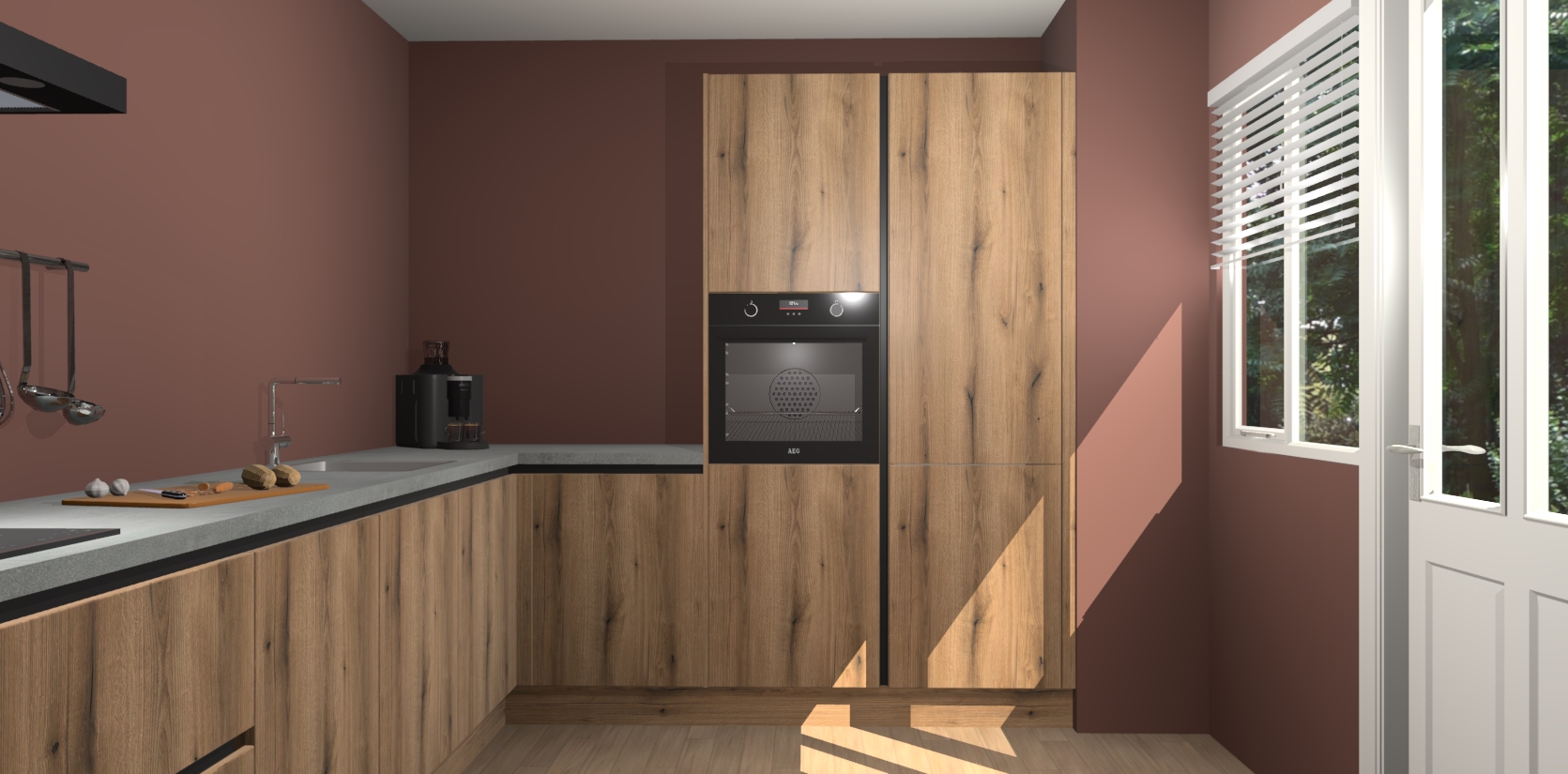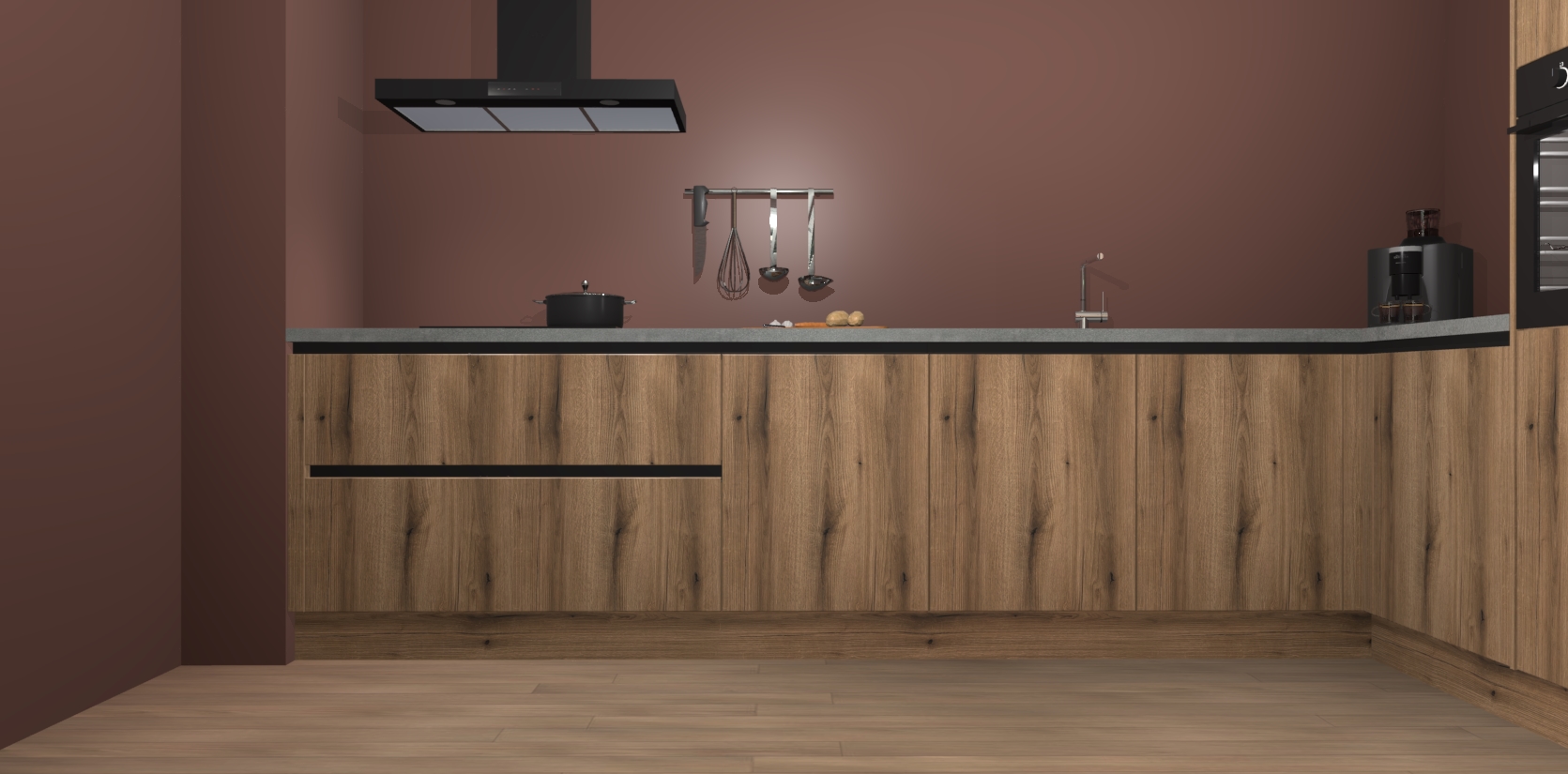 Welkom bij de Goud Eiken greeploze keuken Portland. Deze prachtige keuken zal de komende jaren het middelpunt van de belangstelling in uw huis zijn. Uitgerust met vijf inbouwapparaten komt u nooit kookgereedschap tekort. Bovendien geeft de warme houtlook elke ruimte een uitnodigende en tijdloze uitstraling.